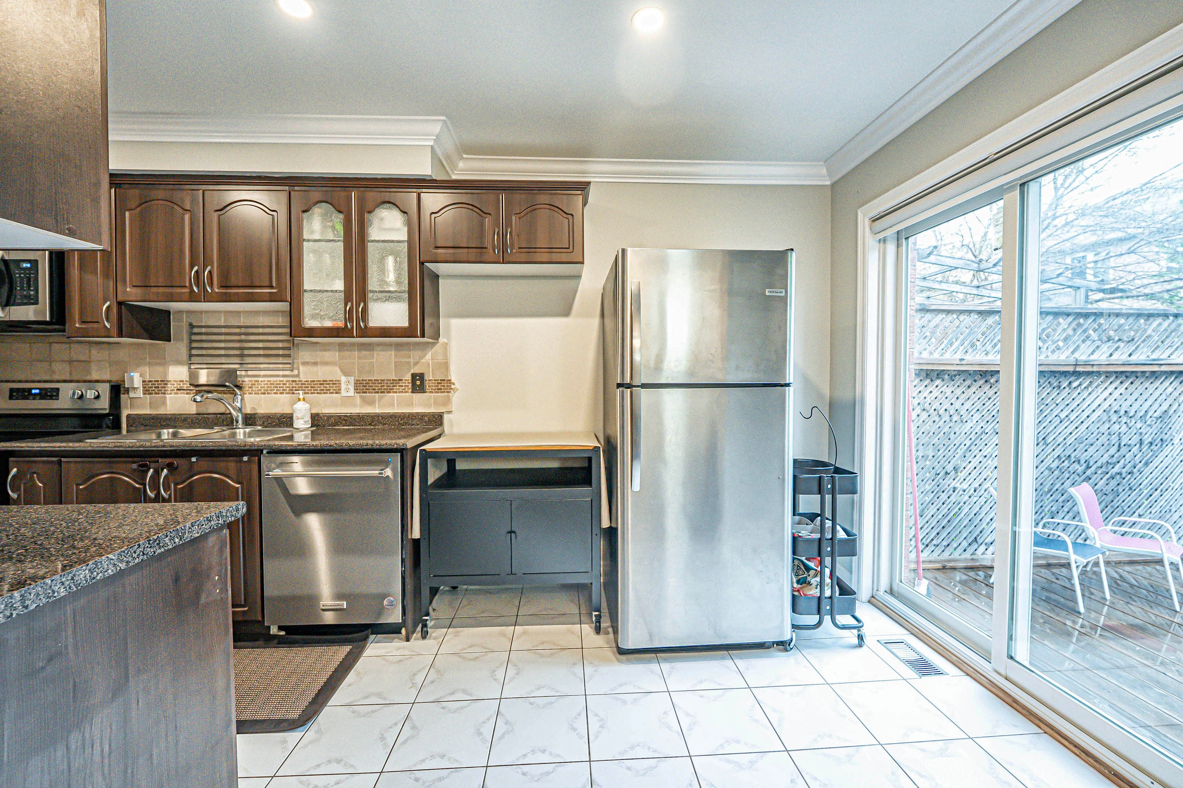 • Elegant pot lights and stylish marble backsplash in the kitchen.