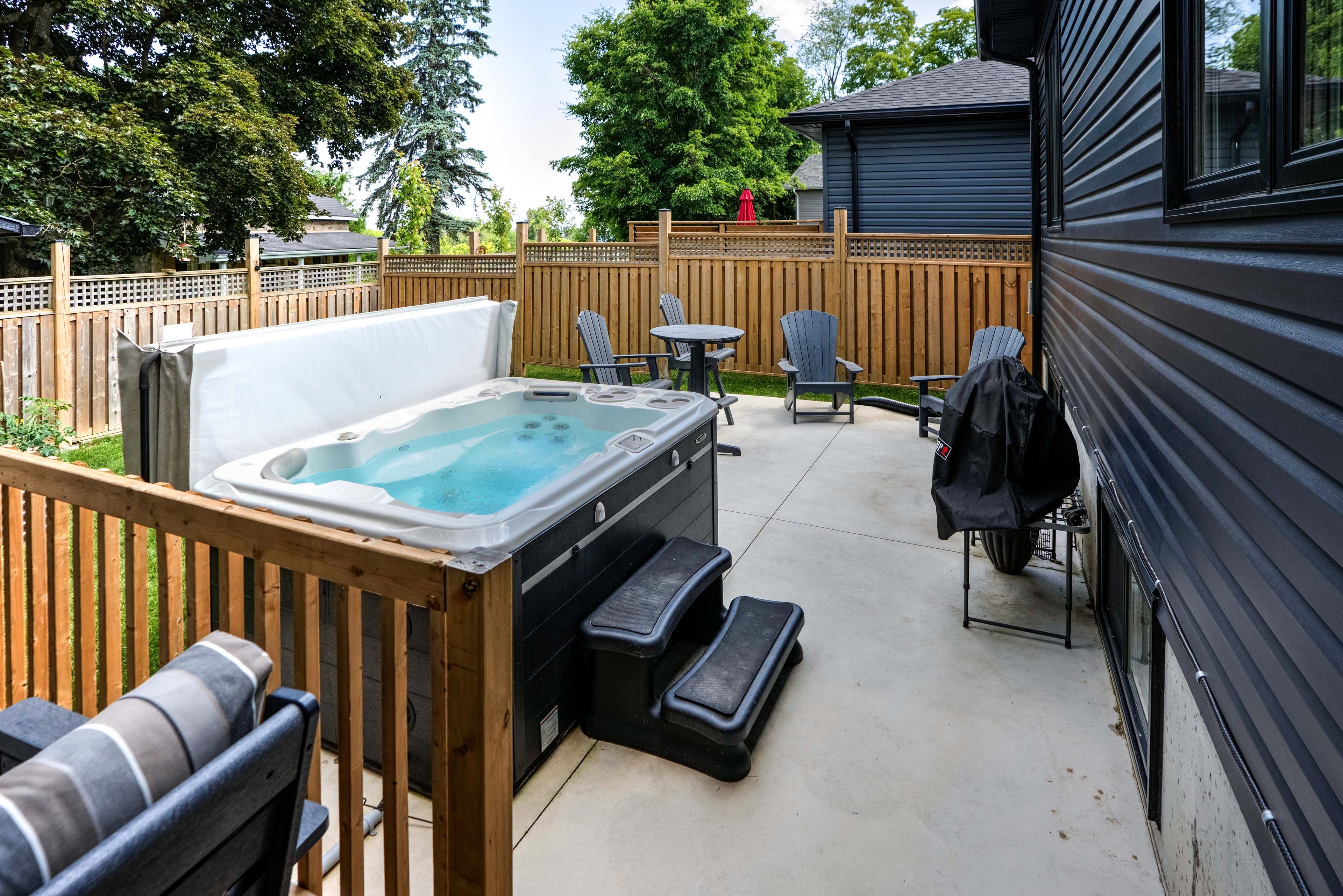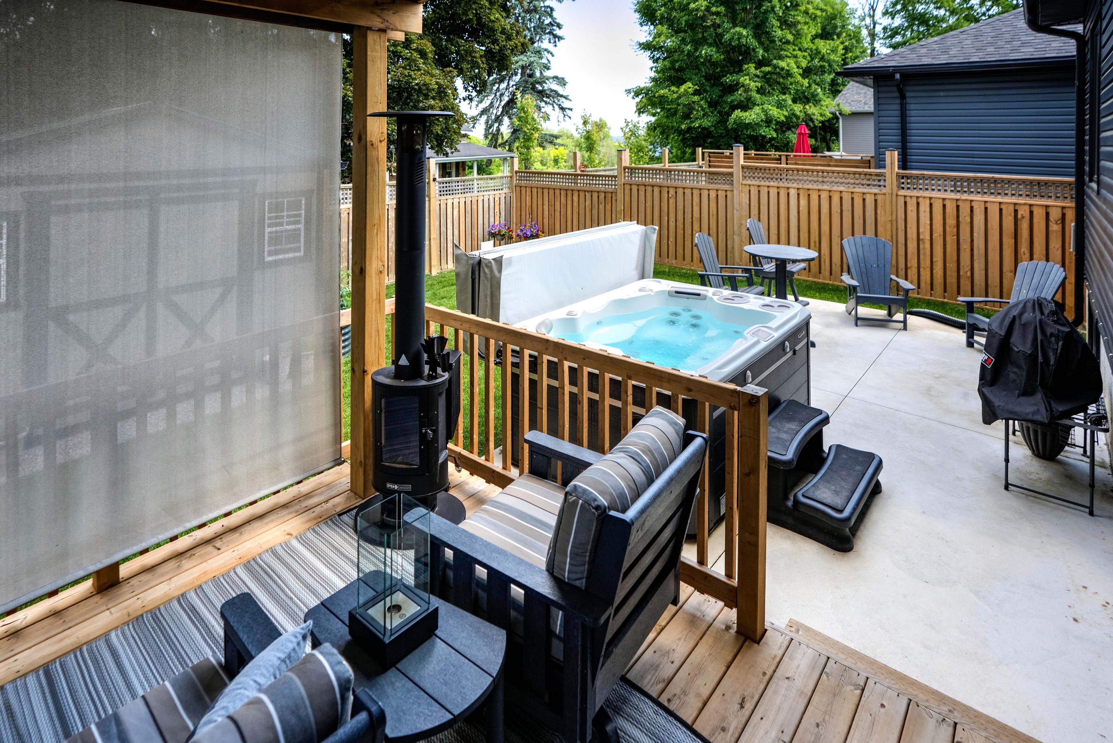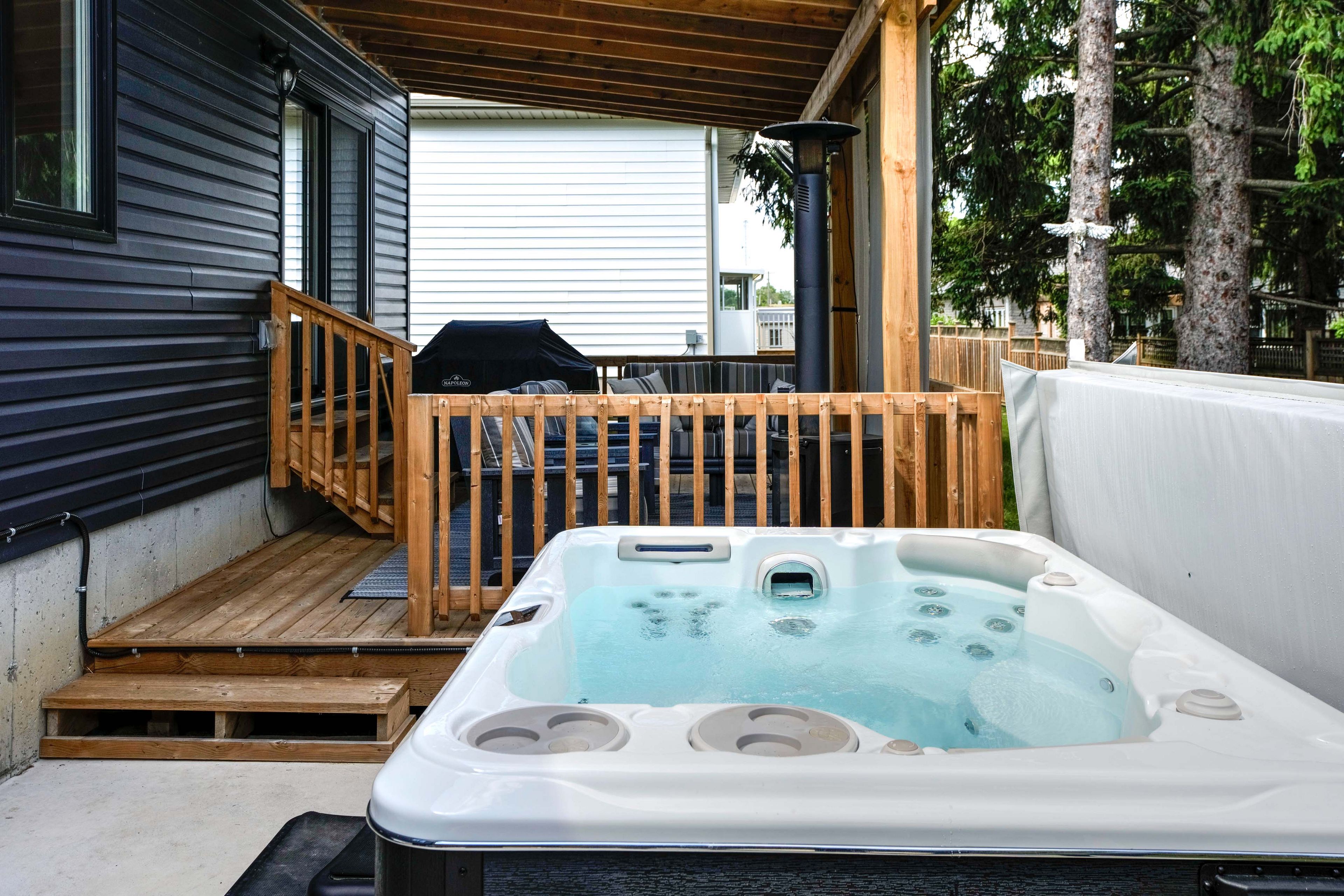• Private deck with heating, cooling fans, and a hot tub for relaxation.