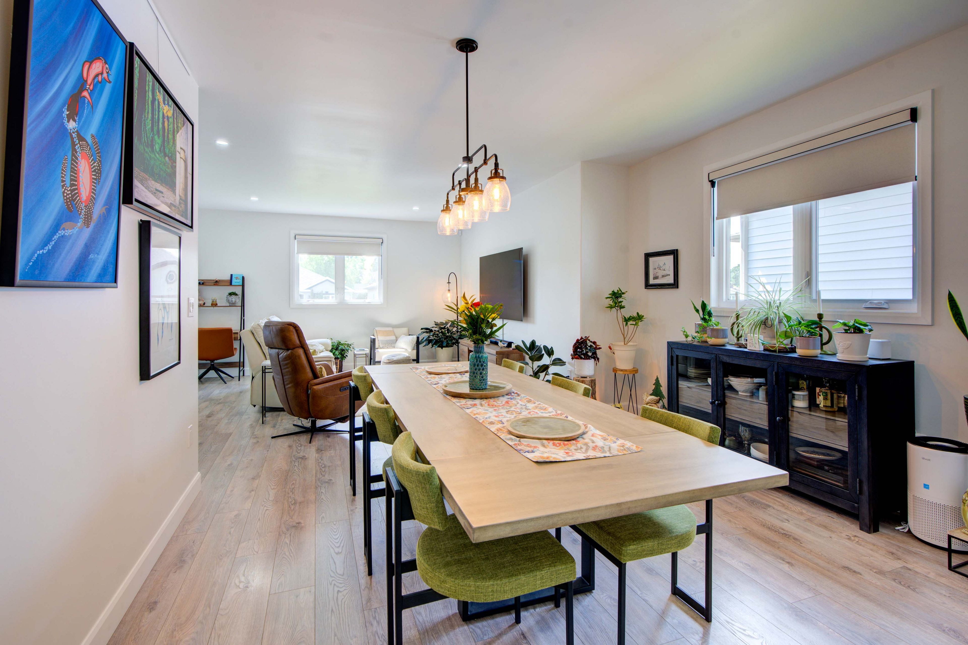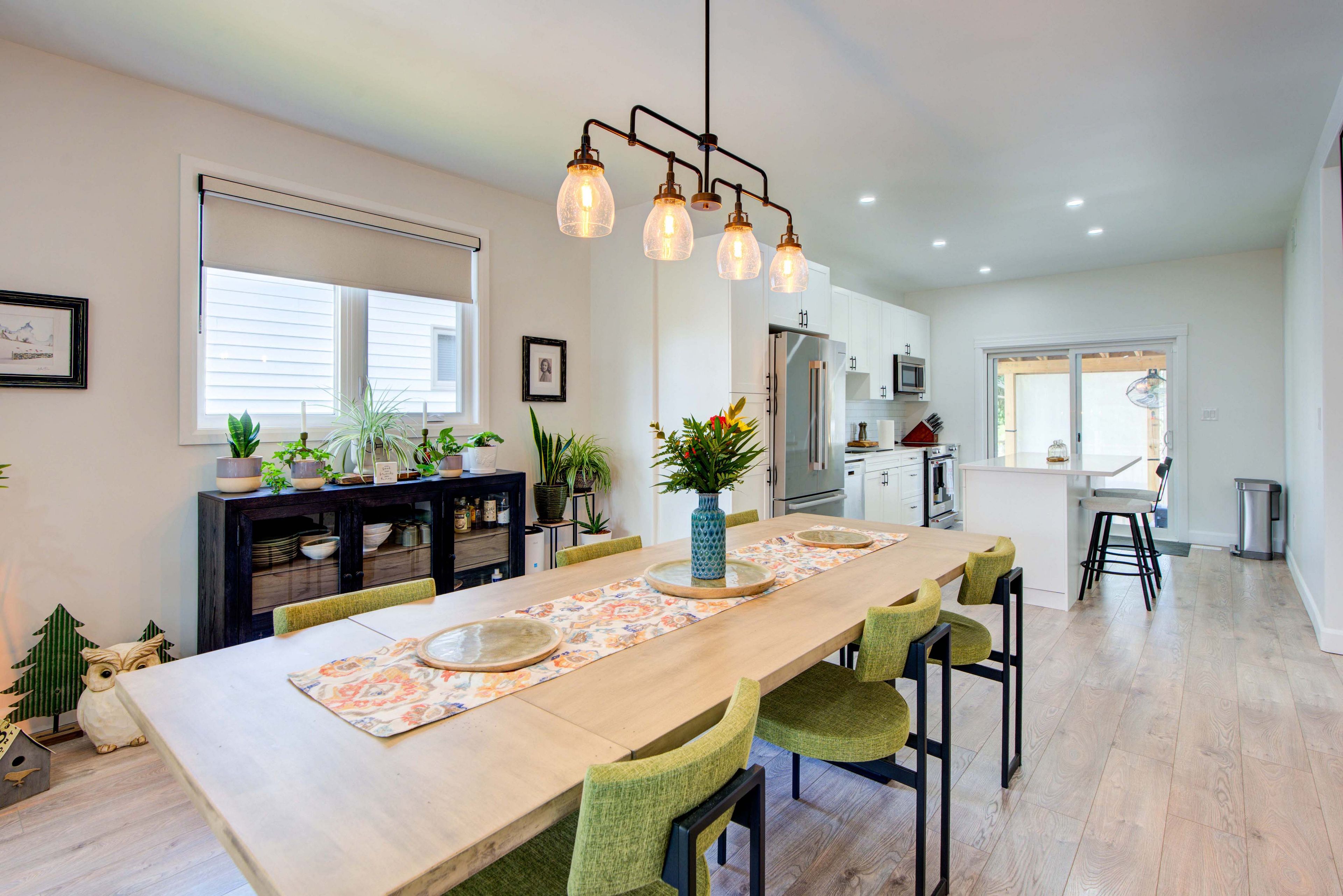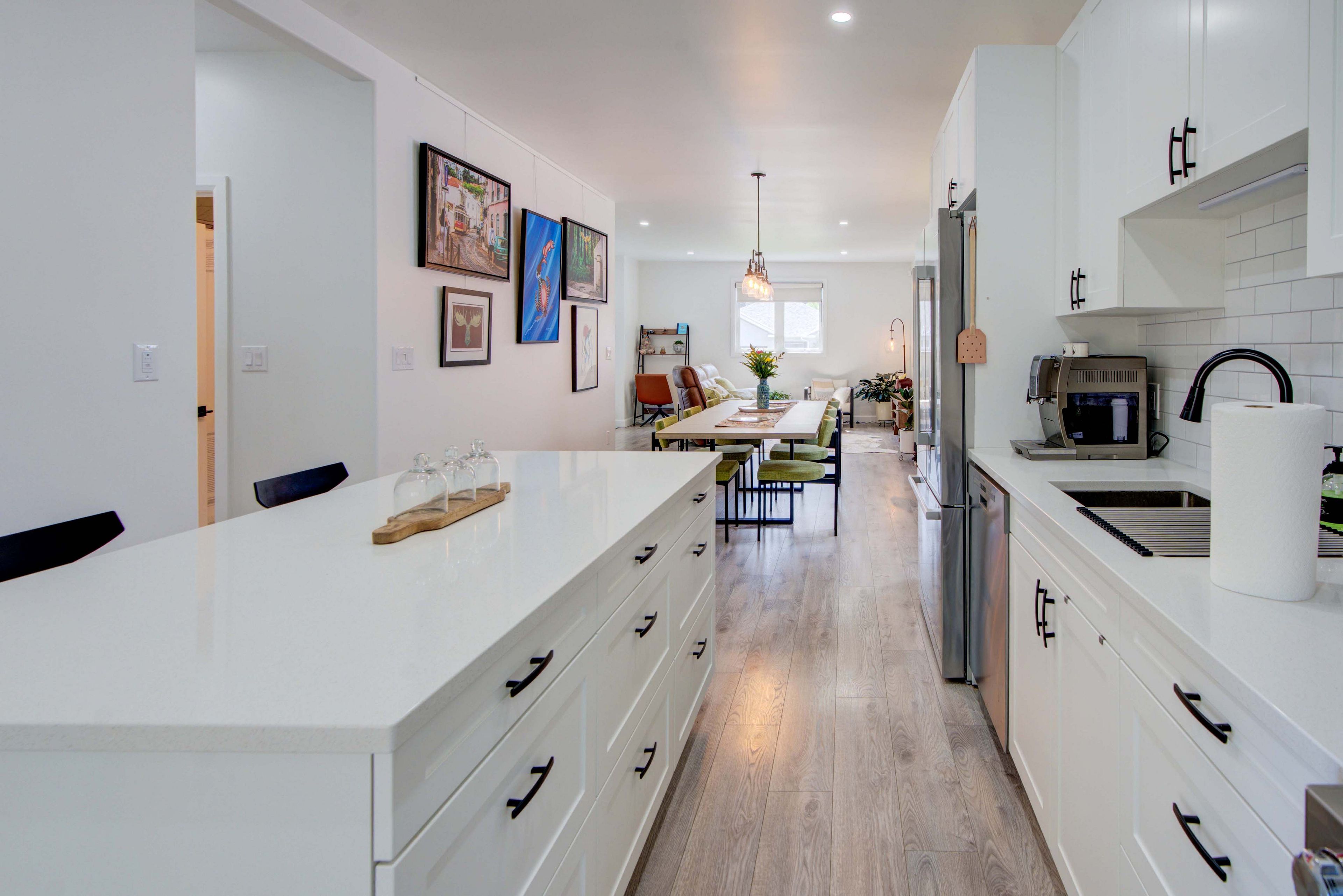 • Open concept living, dining, and kitchen area with a center island.