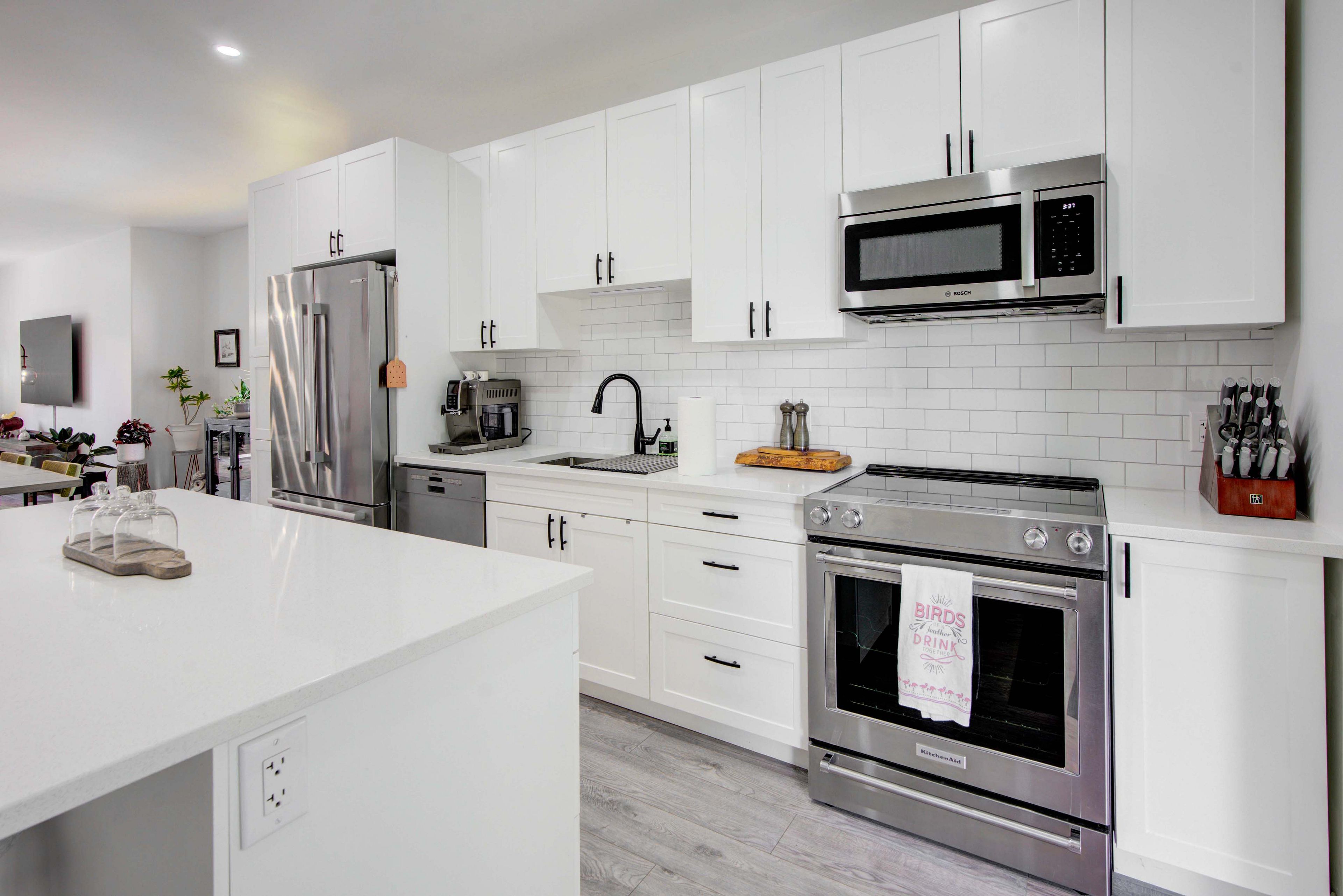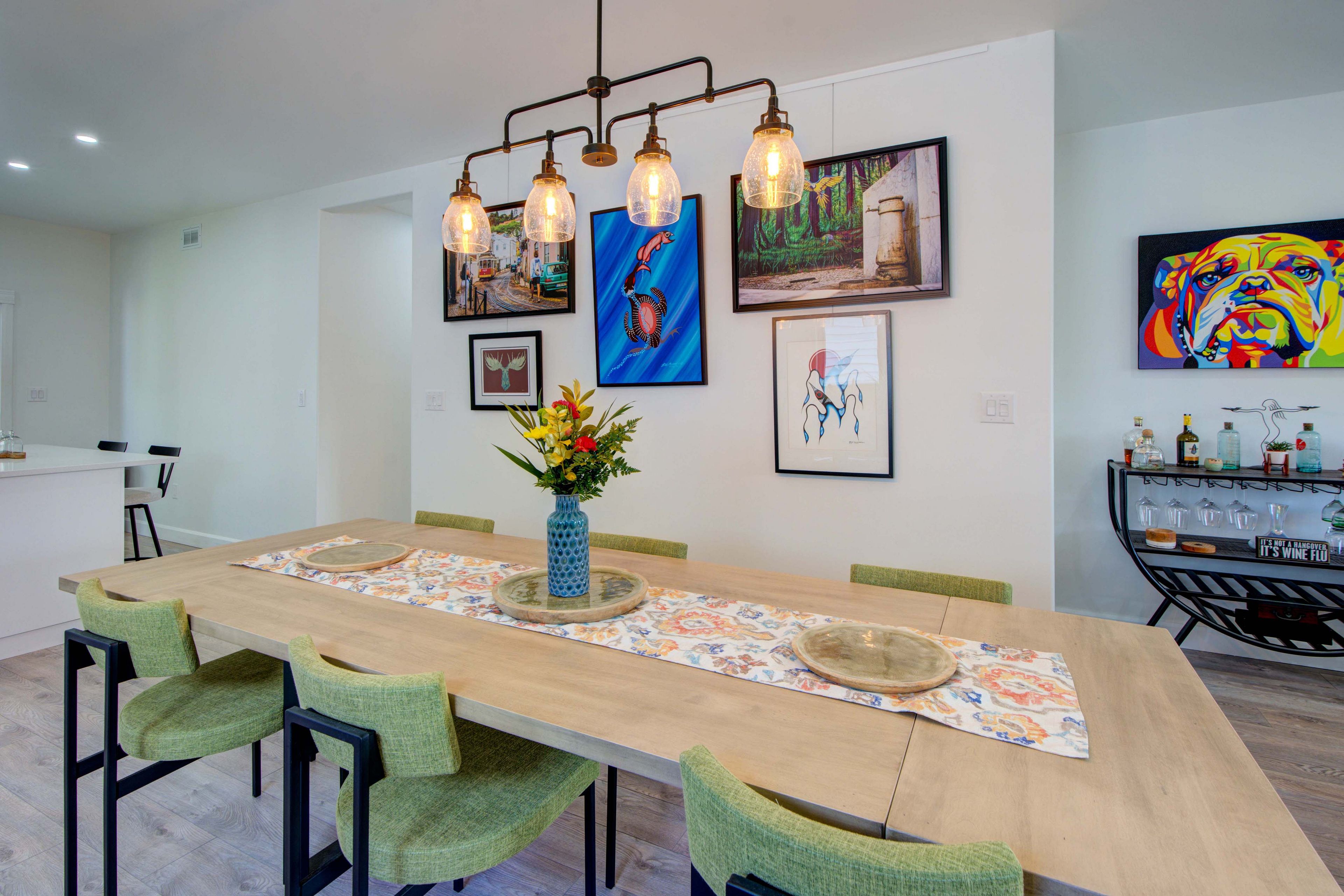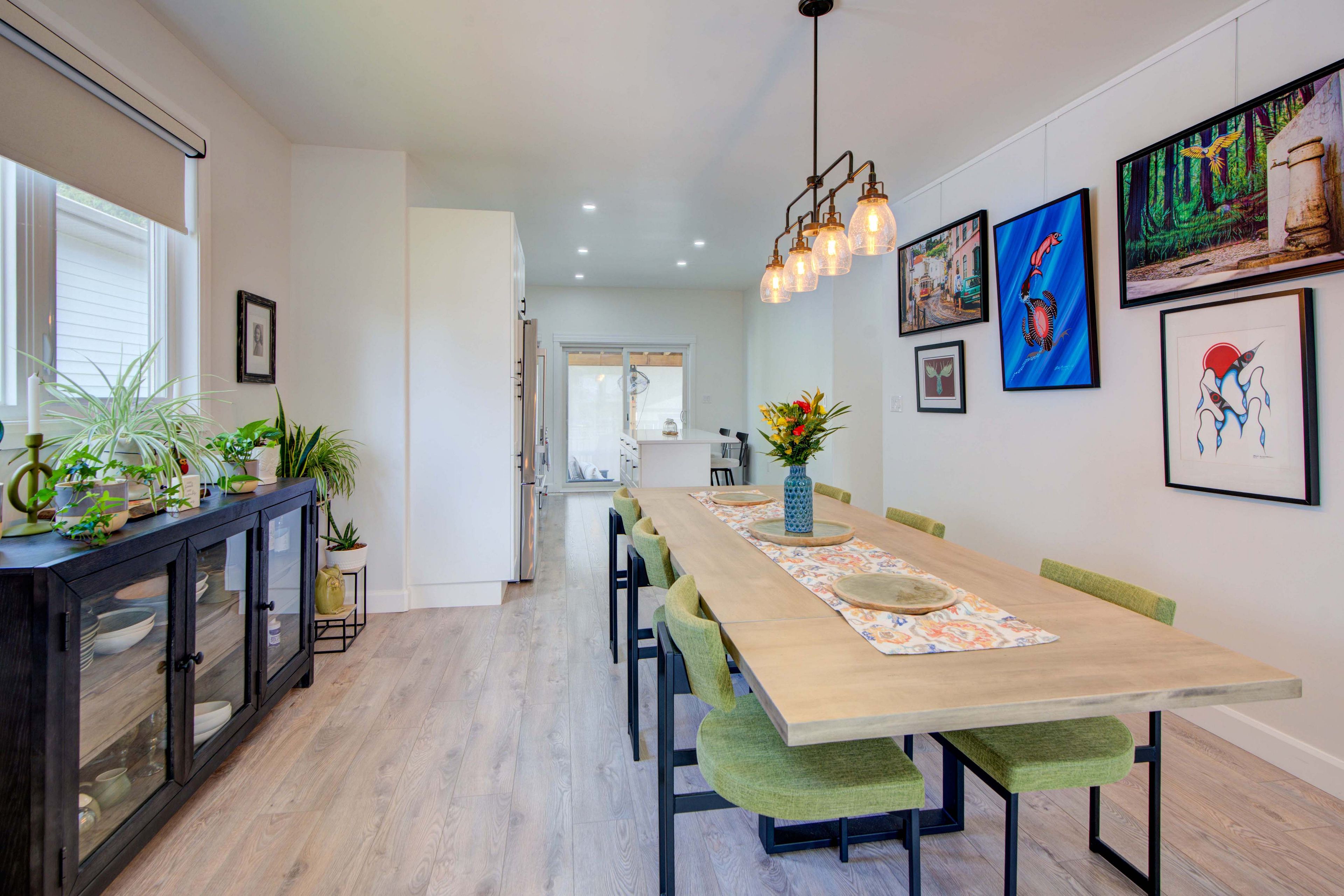 • Open concept living, dining, and kitchen area with a center island.