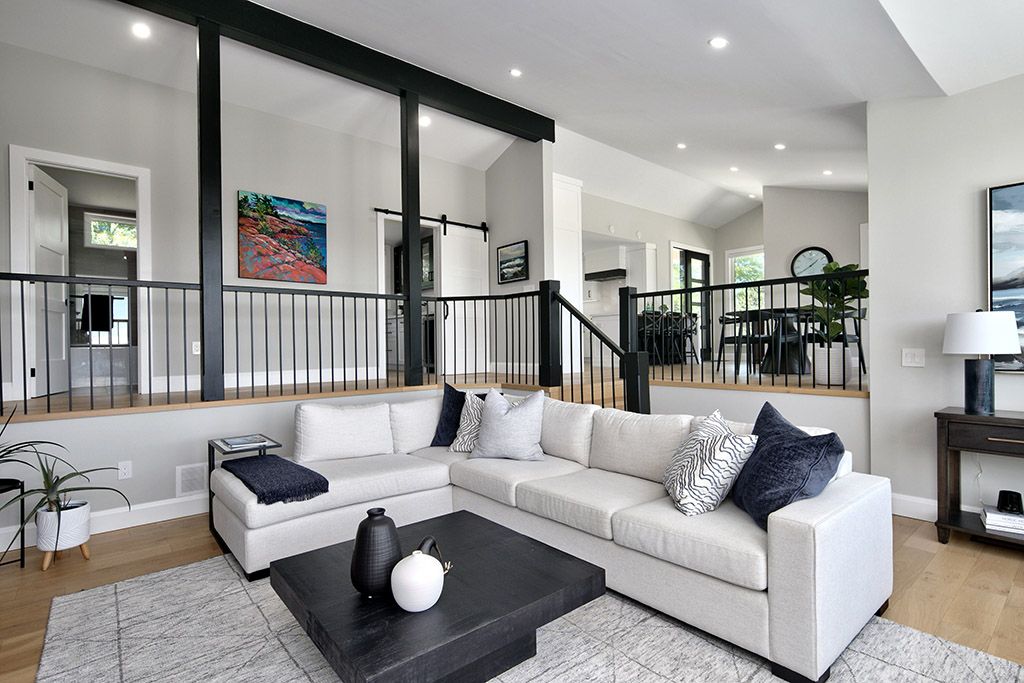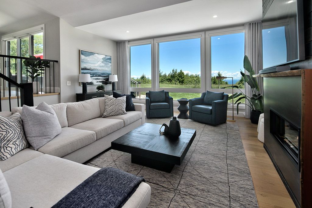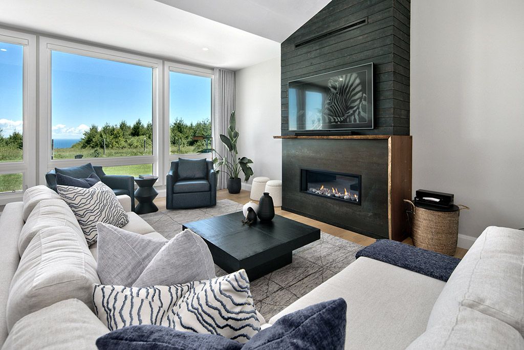 • Spacious open-concept layout with floor-to-ceiling windows and a cozy fireplace.