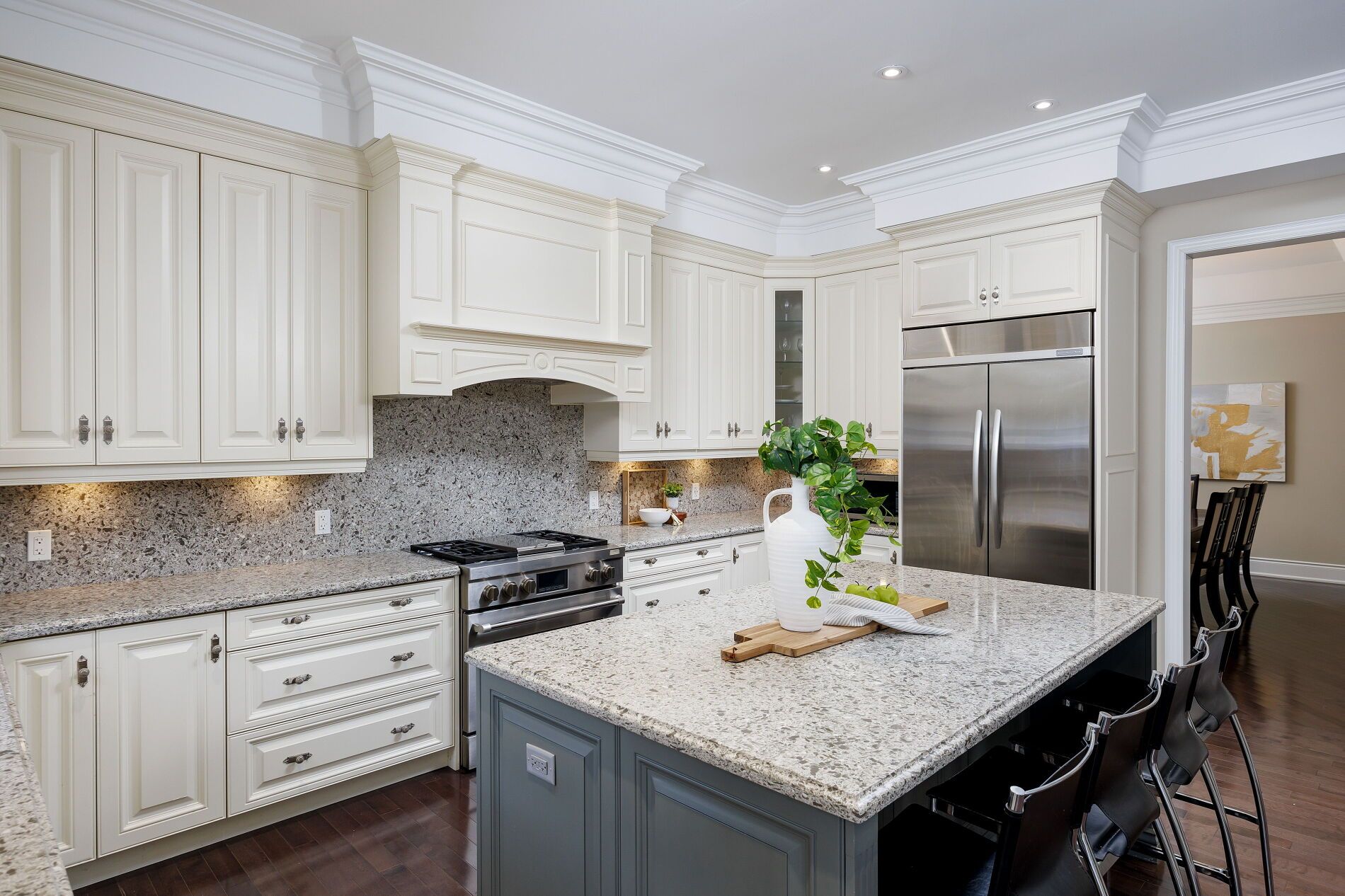 • Kitchen features custom cabinetry and opens to a landscaped backyard patio.