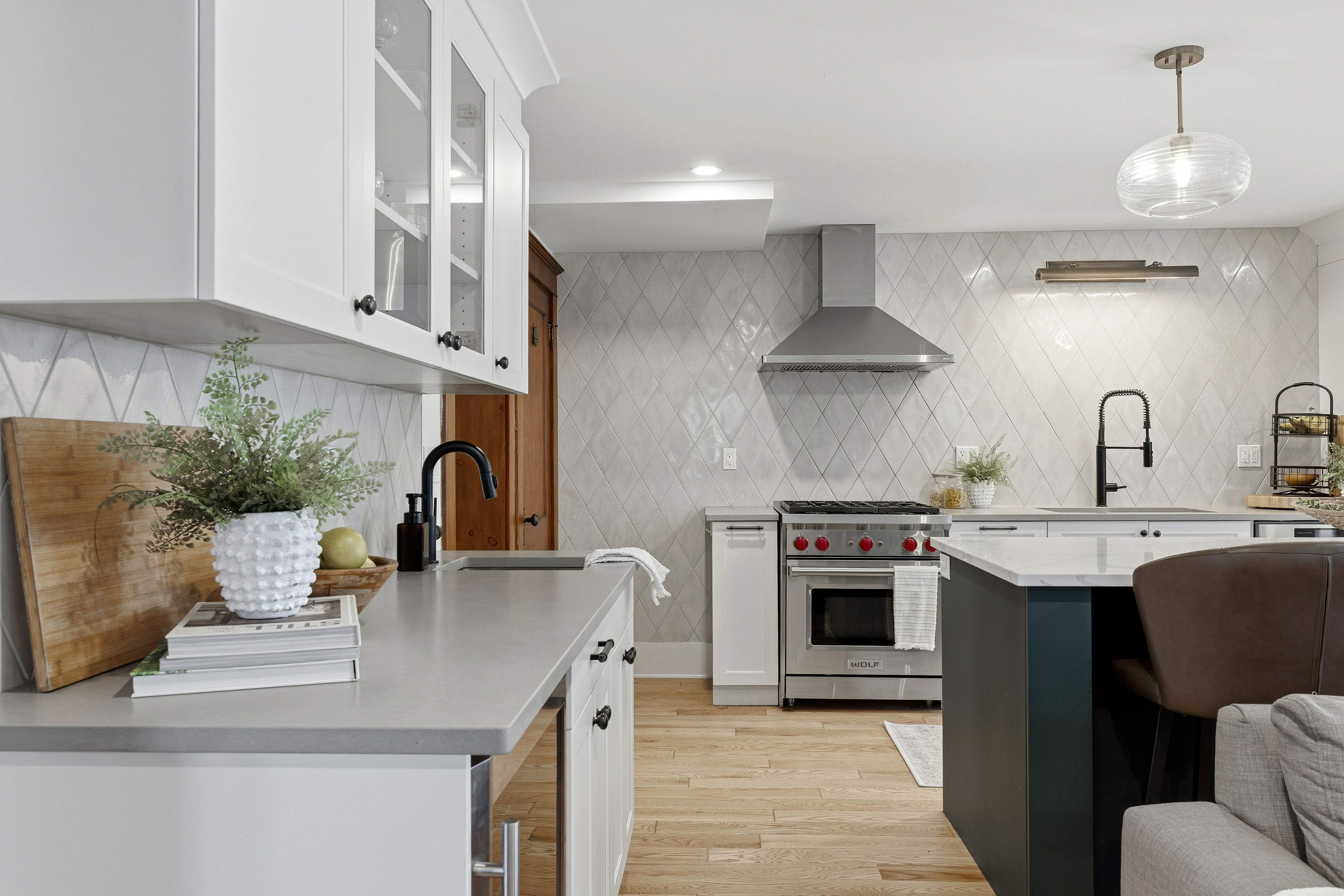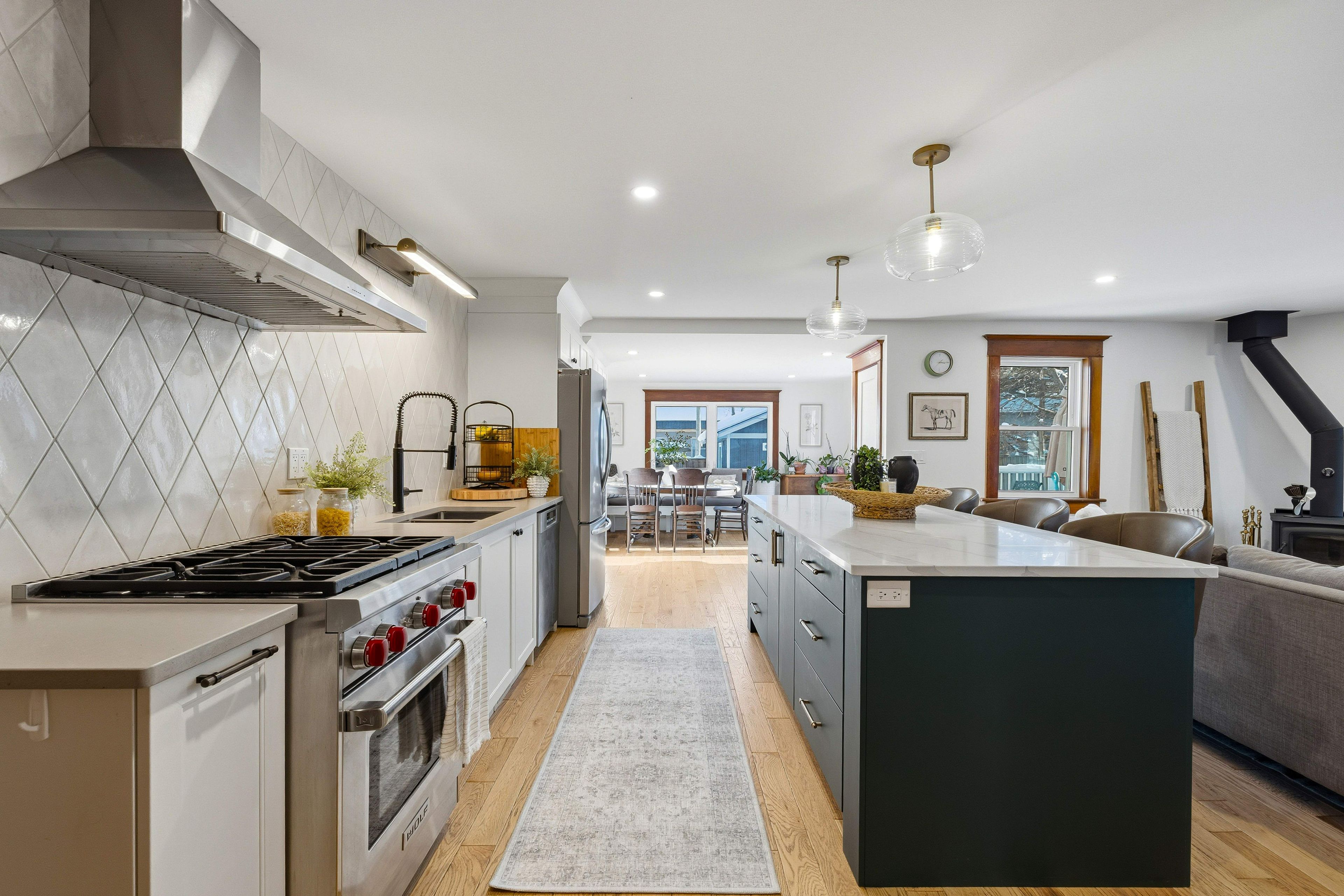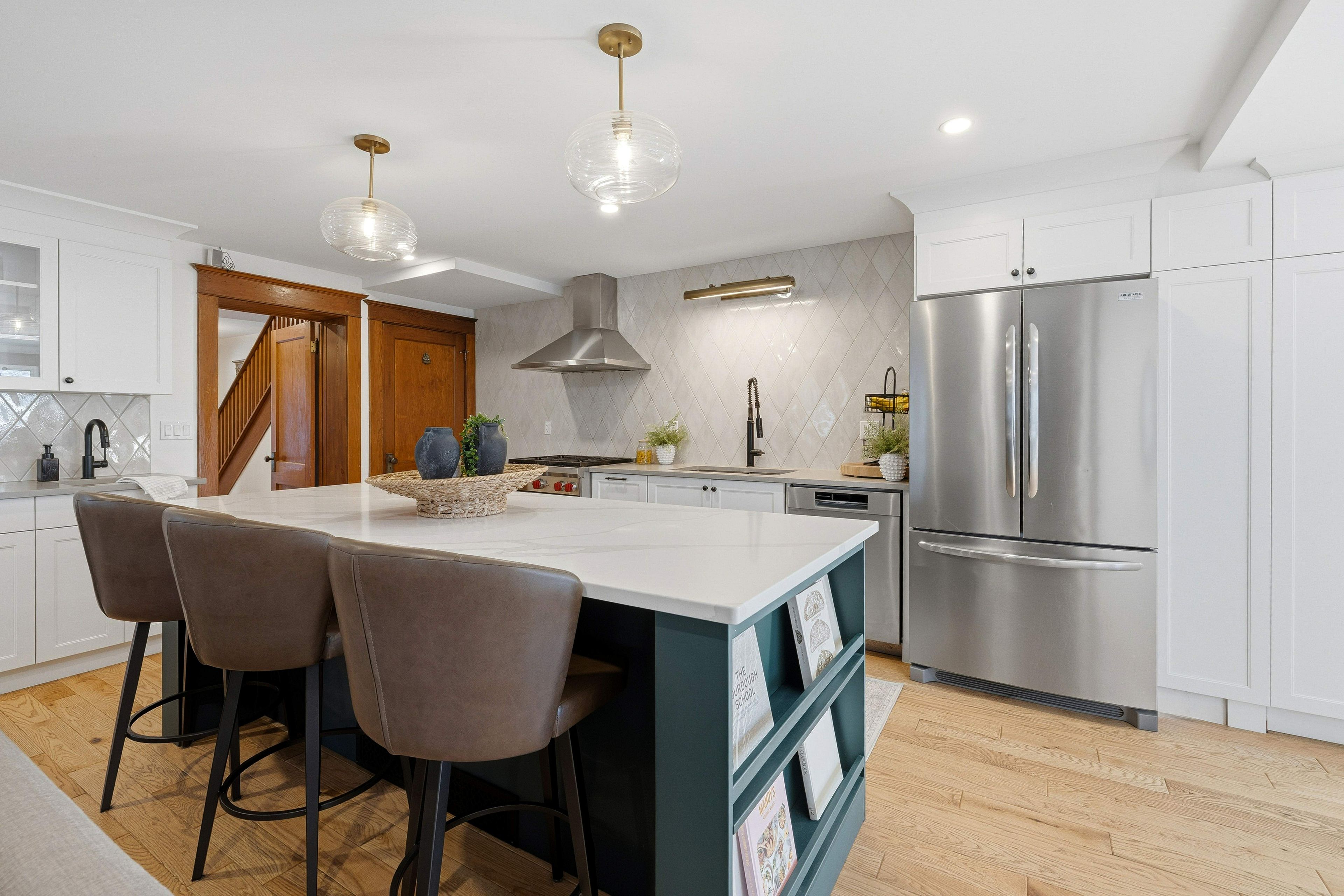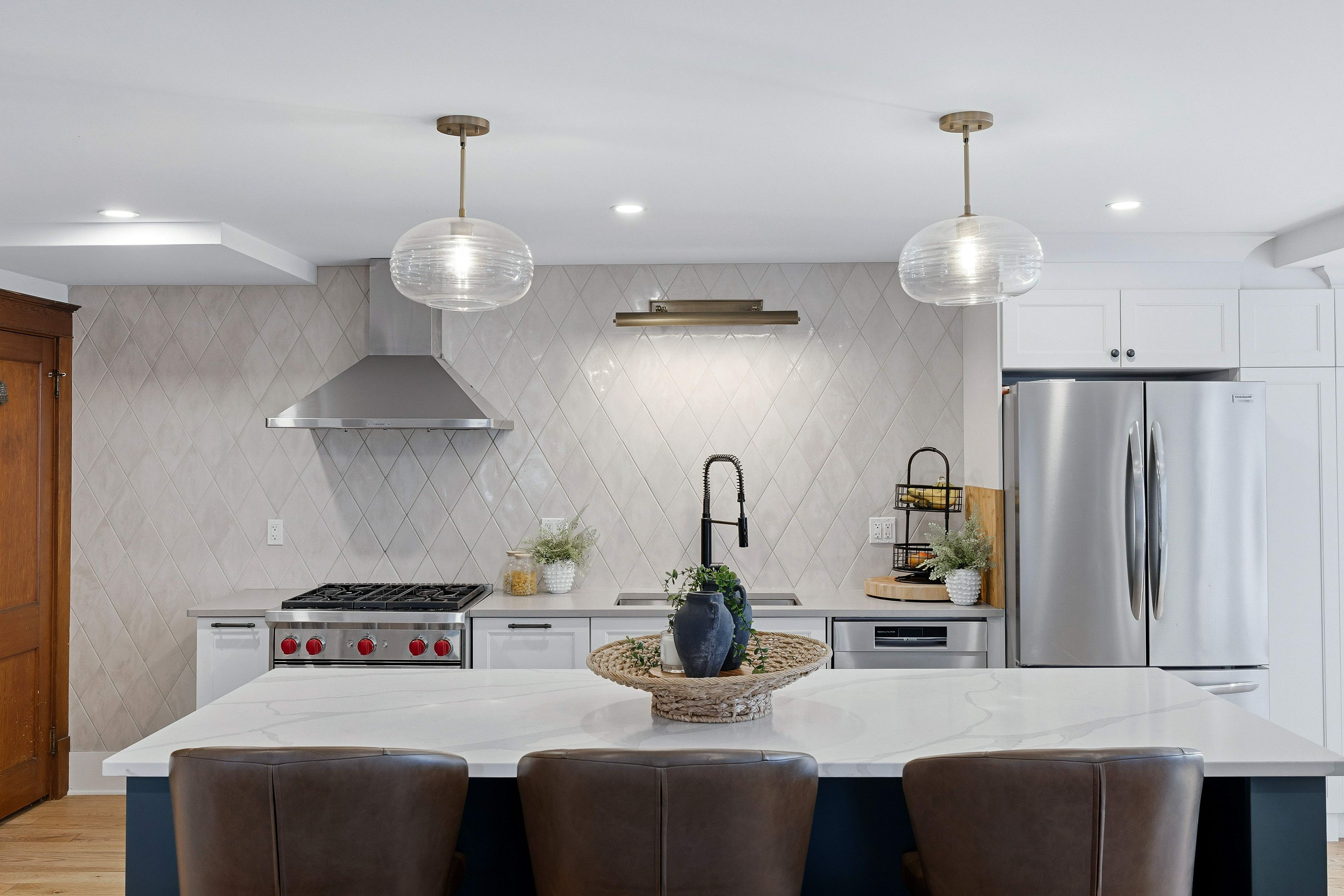 • Spacious chef's kitchen featuring high-end appliances and a large quartz island.