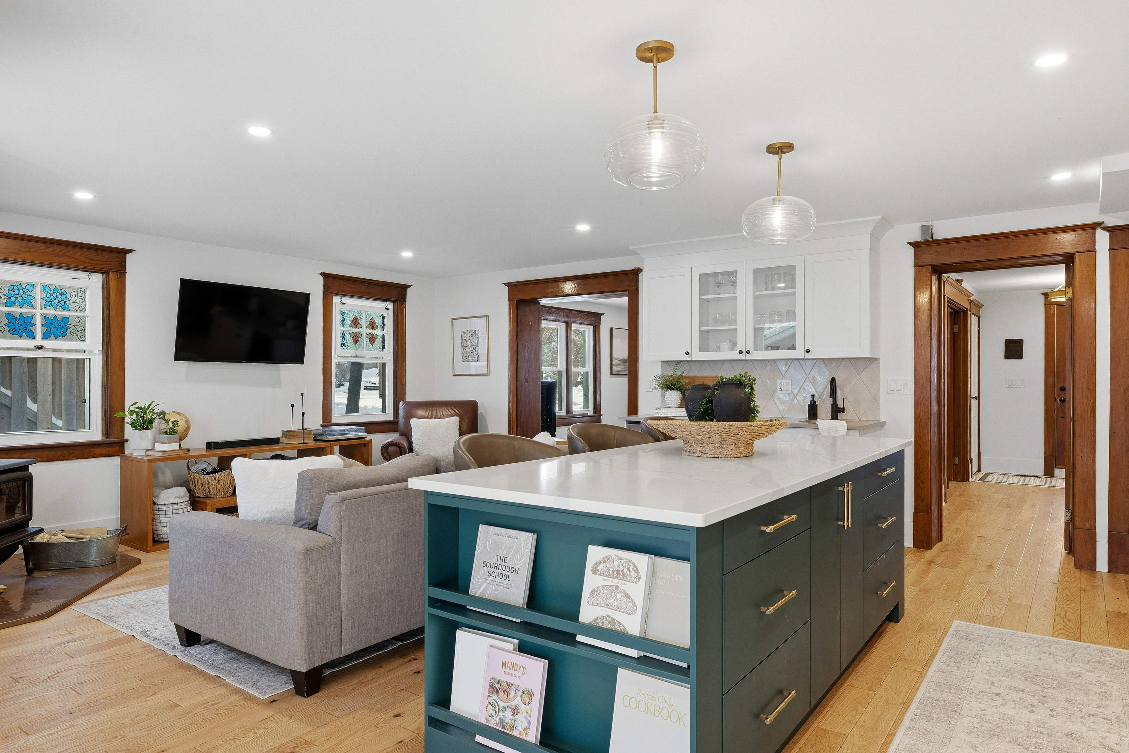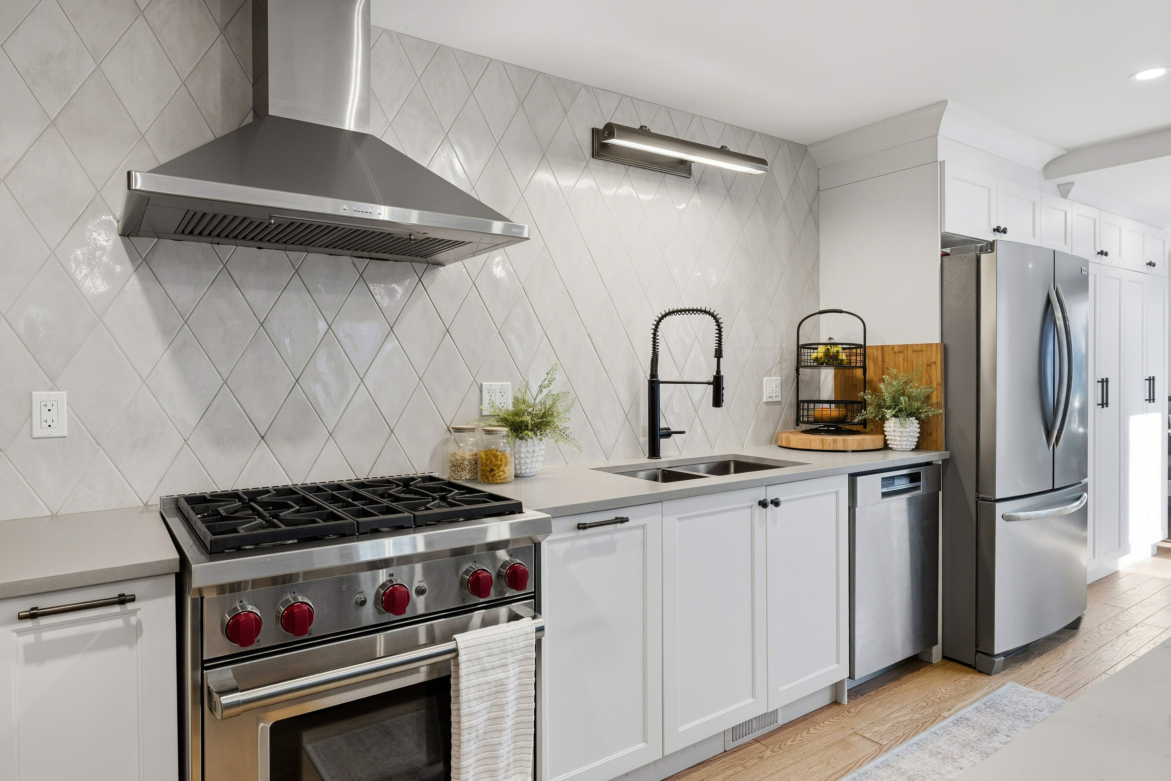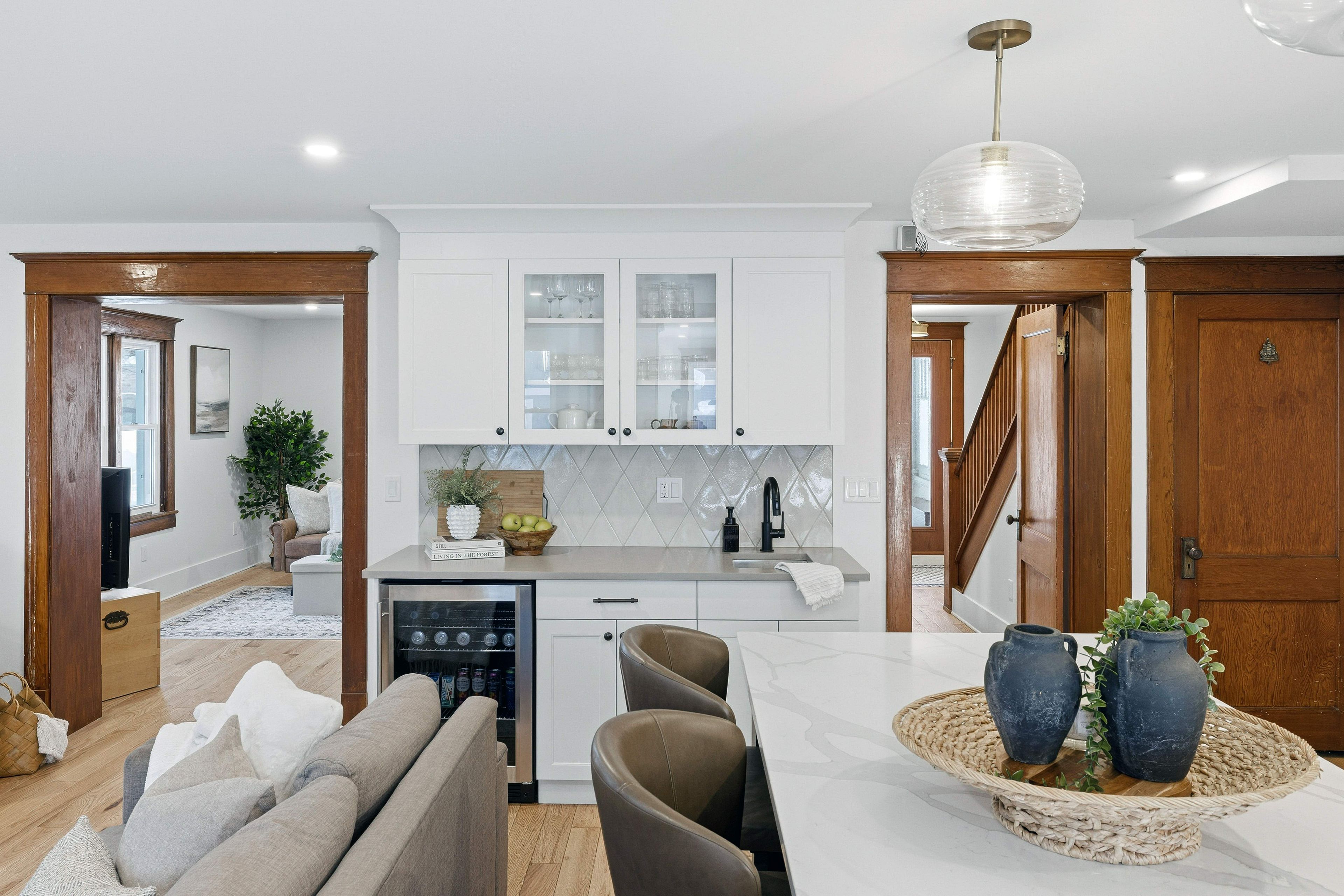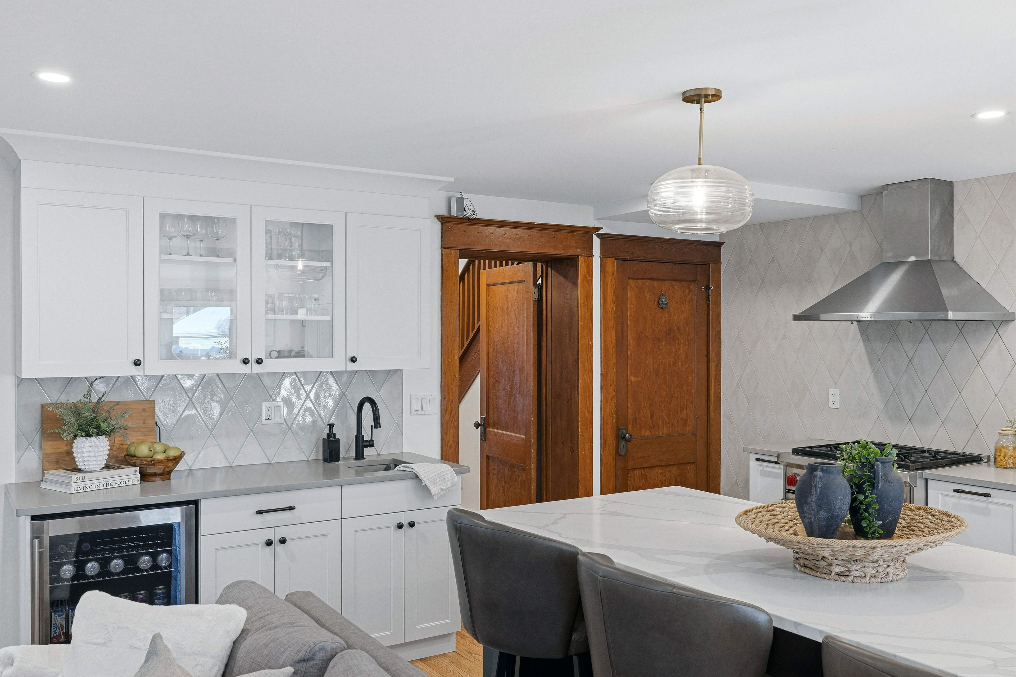 • Spacious chef's kitchen featuring high-end appliances and a large quartz island.