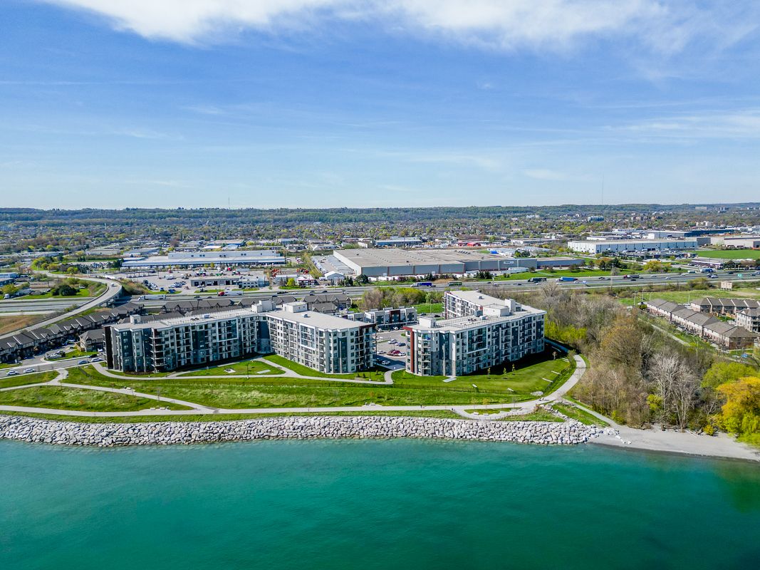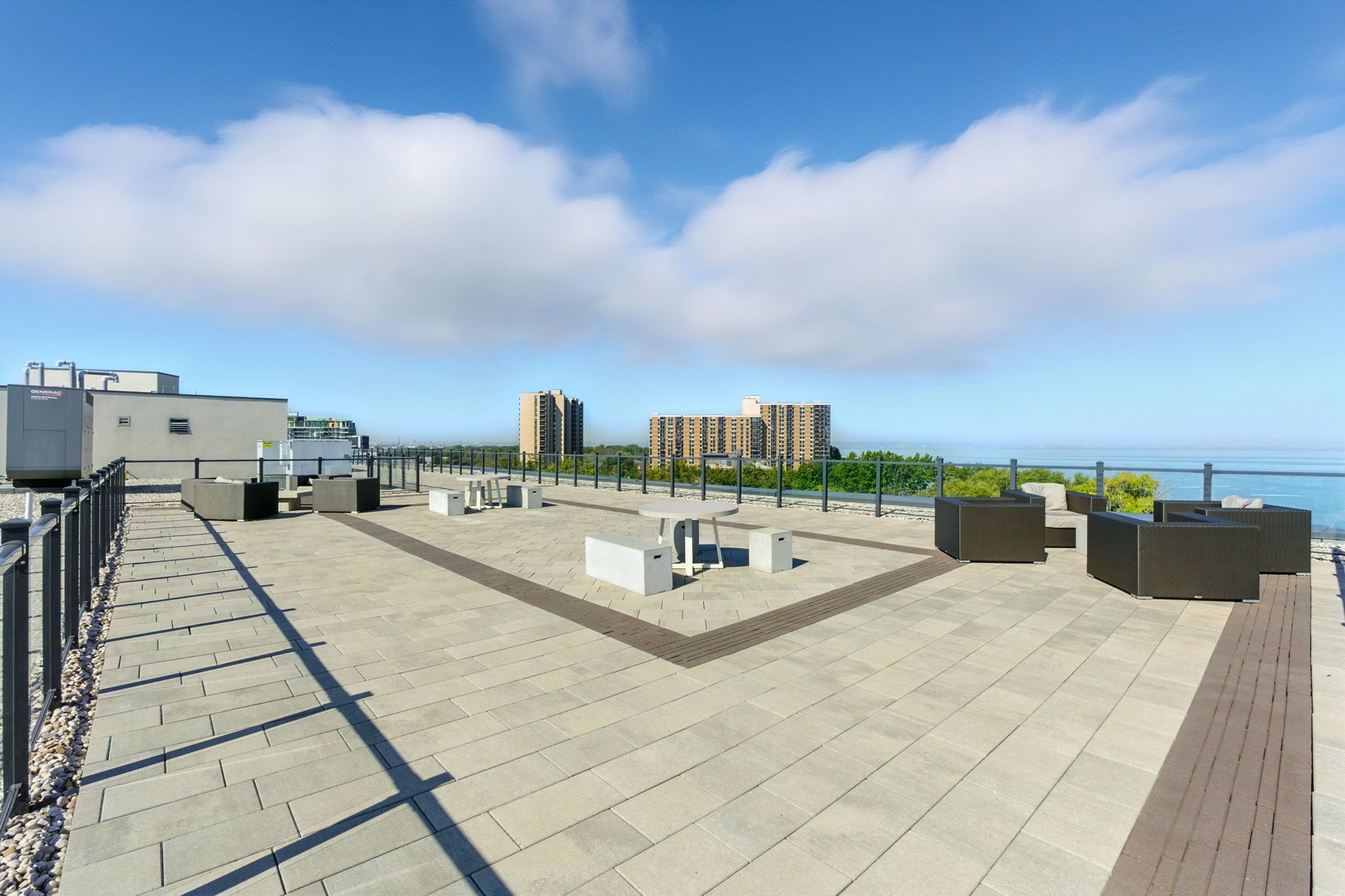 Welcome to sapphire condos and effortless lakeside living on the shores of lake ontario. This carpet-free 1 bedroom + den suite offers convenient main-level living; no elevators when unloading groceries or welcoming guests. The open-concept kitchen features stainless steel appliances and breakfast bar seating, flowing into a bright living area with sliding doors to your private patio. The spacious primary bedroom includes a walk-in closet, and the den is ideal for a home office or guest space. Complete with a 4-piece bath and in-suite laundry. Enjoy rooftop terrace views of the lake, fitness centre, party room, underground parking, locker, and ample visitor parking. Steps to trails, beach, and quick qew access. Low-maintenance waterfront living at its best.