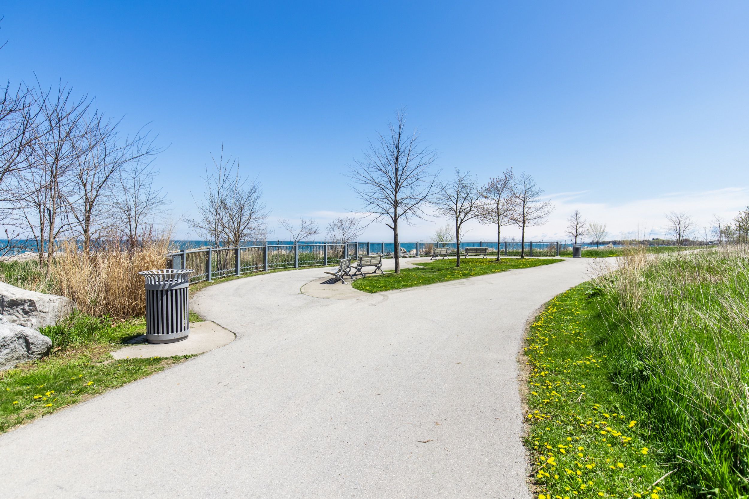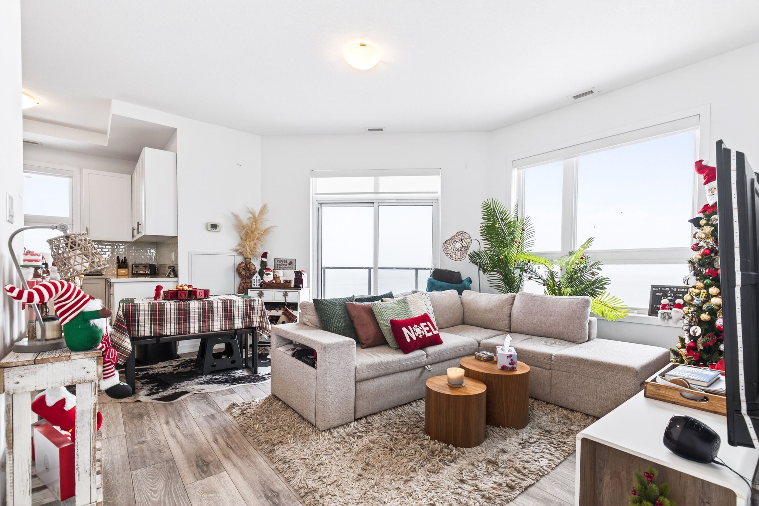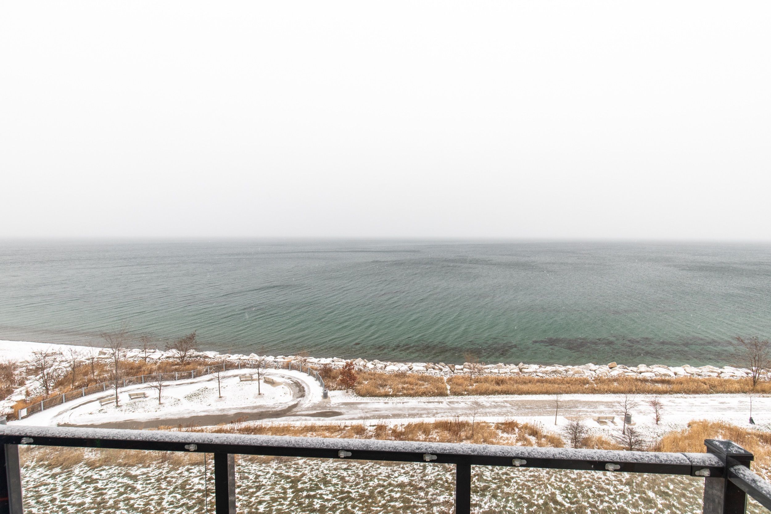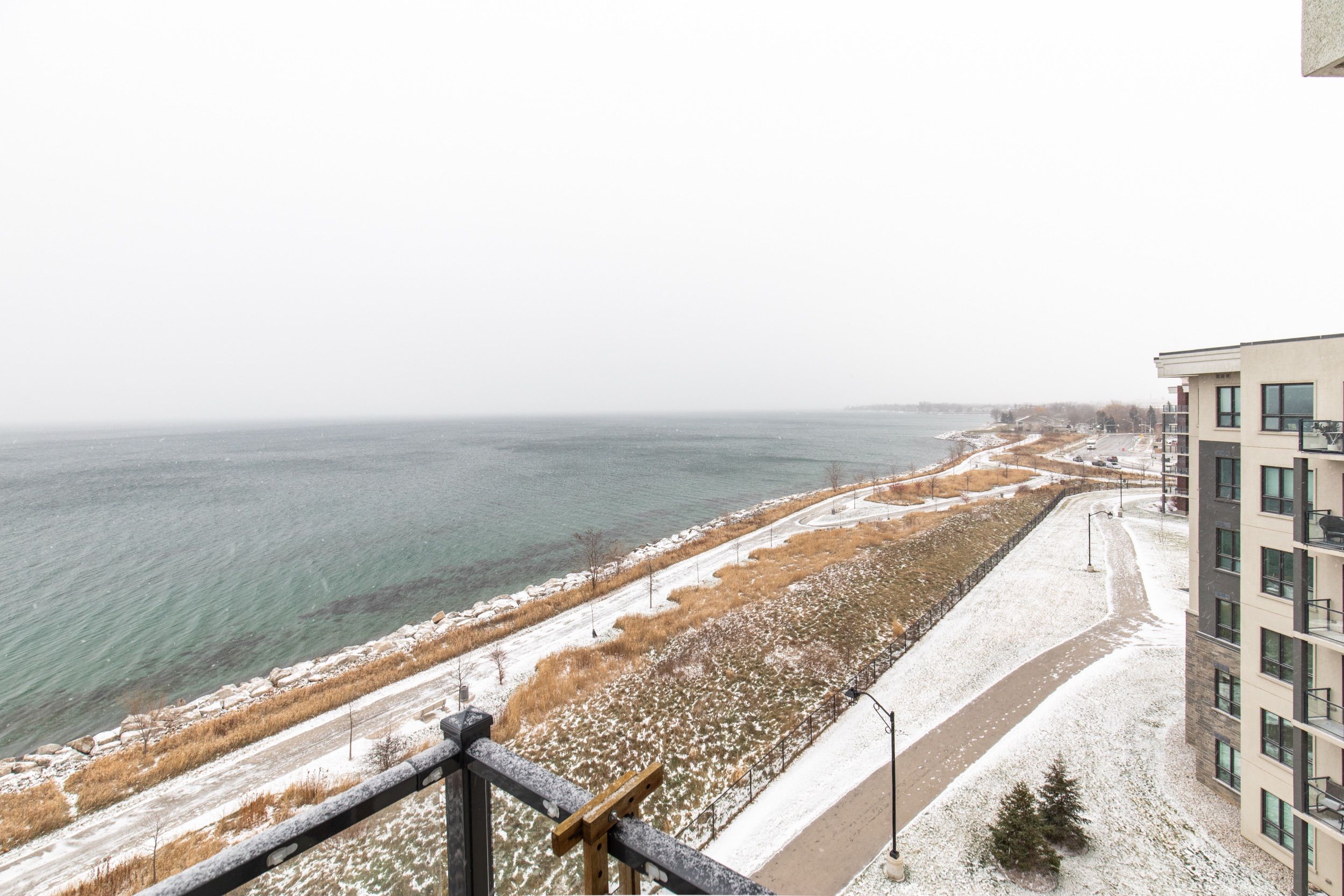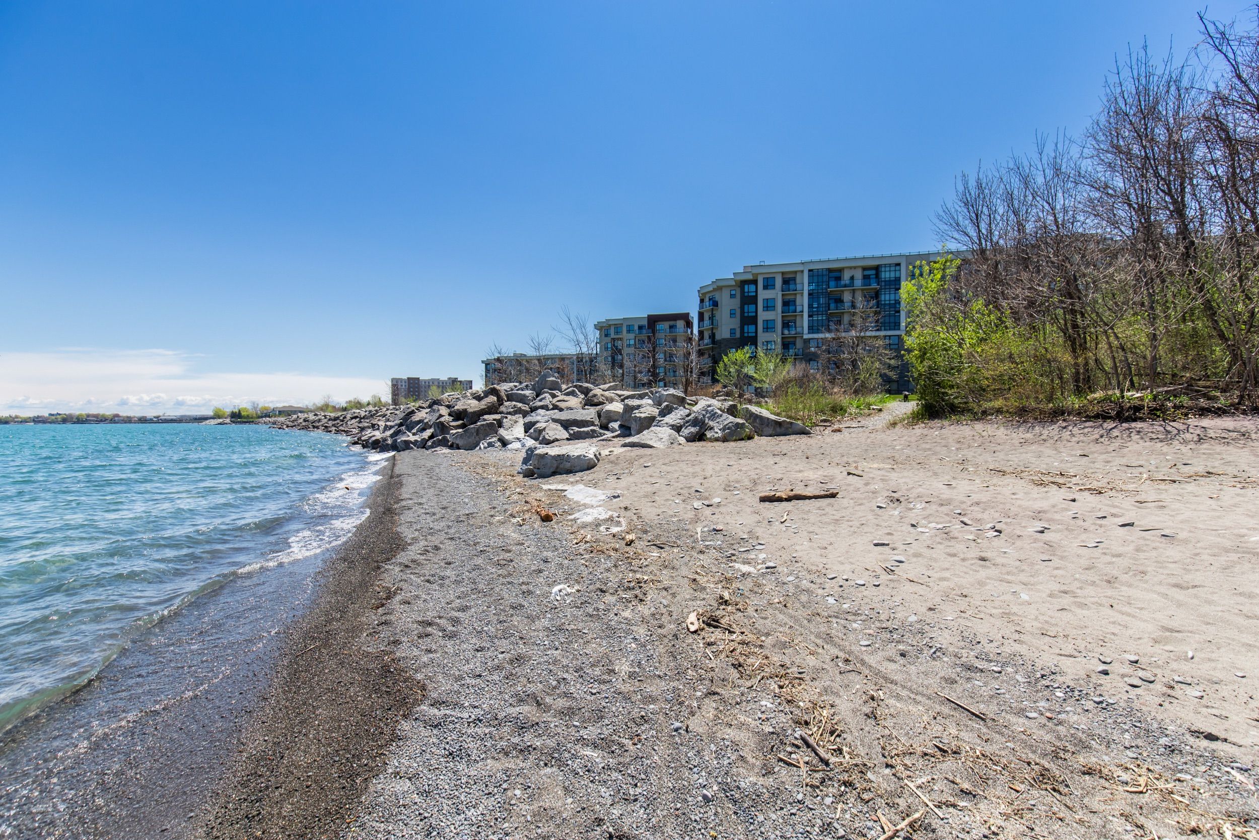 Penthouse living at the lake! Welcome to sapphire at waterfront trails, where waterfront living truly shines. This top-floor 2-bedroom, 2-bath penthouse suite offers the ultimate blend of style, comfort, and vacation-inspired living, every single day. Stunning lake views from the balcony and living areas! Soaring 10-foot ceilings and a bright open floor plan create an airy, inviting atmosphere. The modern kitchen is designed to impress with quartz countertops, stainless steel appliances, extended cabinetry, and a striking backsplash, making it perfect for both everyday living and entertaining. The spacious primary bedroom features a walk-in closet and private ensuite, while the second bedroom and full bath offer flexibility for guests, a home office, or additional living space. Contemporary vinyl flooring throughout the condo, in-suite laundry, modern blinds on all windows, and stylish finishes complete the space. Every room has a window for abundant natural light! Step outside to your private extended balcony and soak in the lake breeze, or head up to the breathtaking rooftop terrace for panoramic views of lake ontario-spectacular sunrises and sunsets included. This well-managed building offers premium amenities including a fully equipped gym, party room, bike storage, guest suites, and geo-thermal heating and cooling. Enjoy 1 underground parking space (#116) and 1 locker conveniently located on the 6th floor (locker number to be confirmed). Located steps from the waterfront trail, beach strip, and lake access, you can walk, bike, or even swim right at your doorstep. This is more than a condo-it's a lifestyle. Live where others vacation. Welcome home to sapphire.