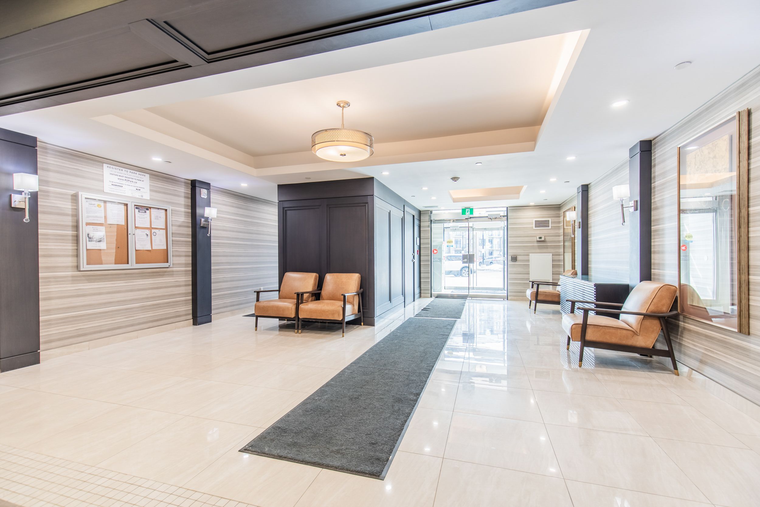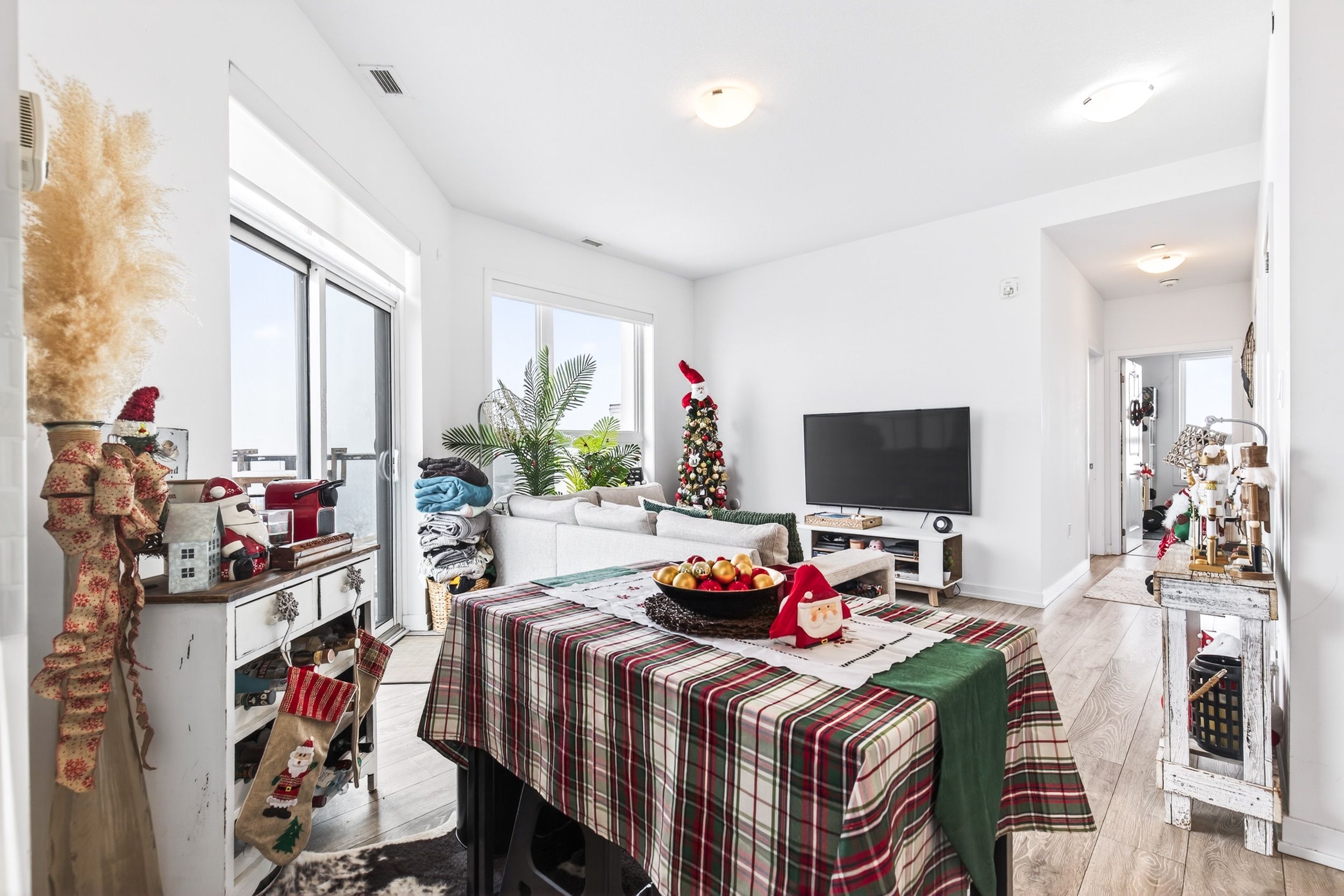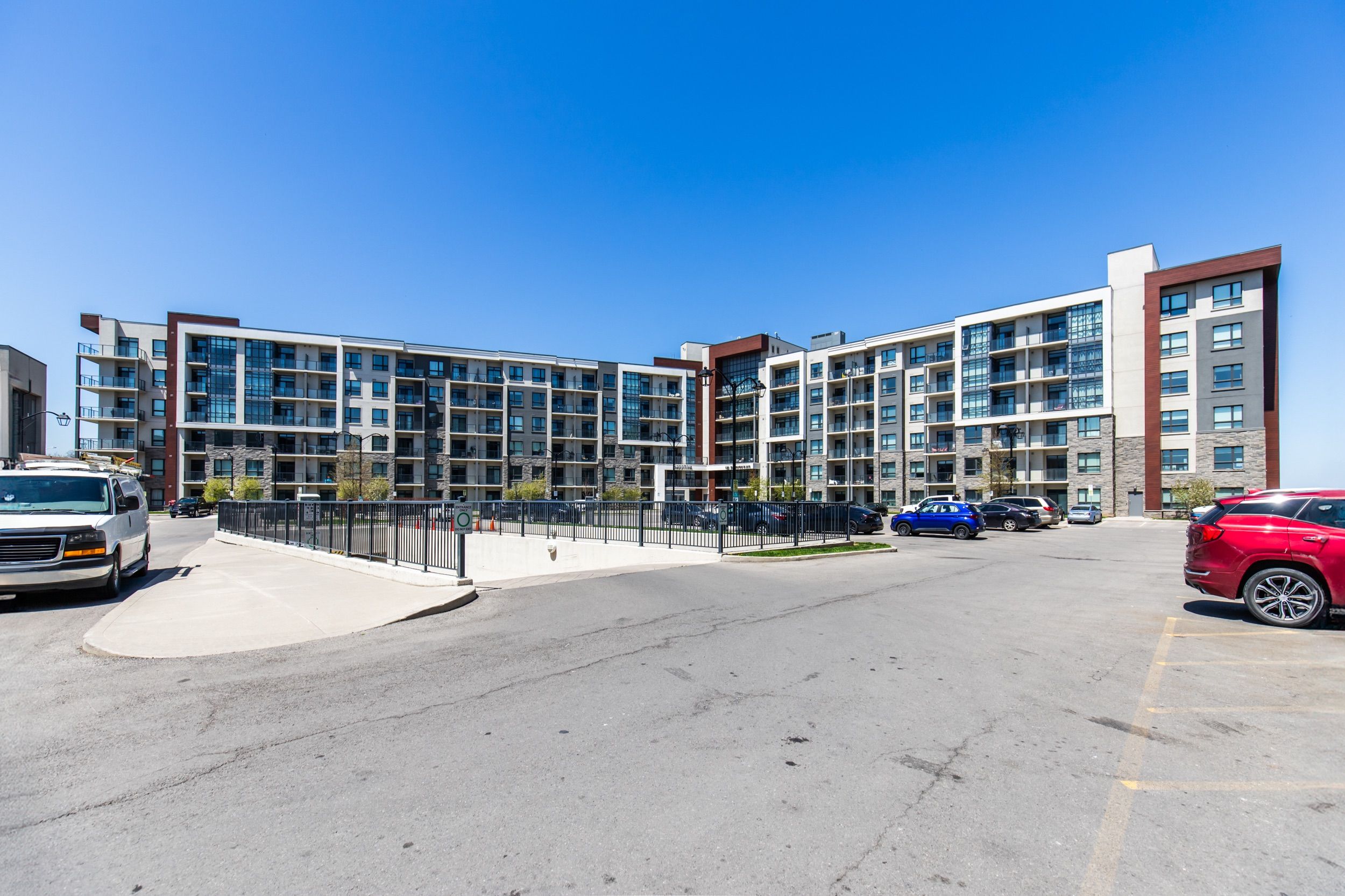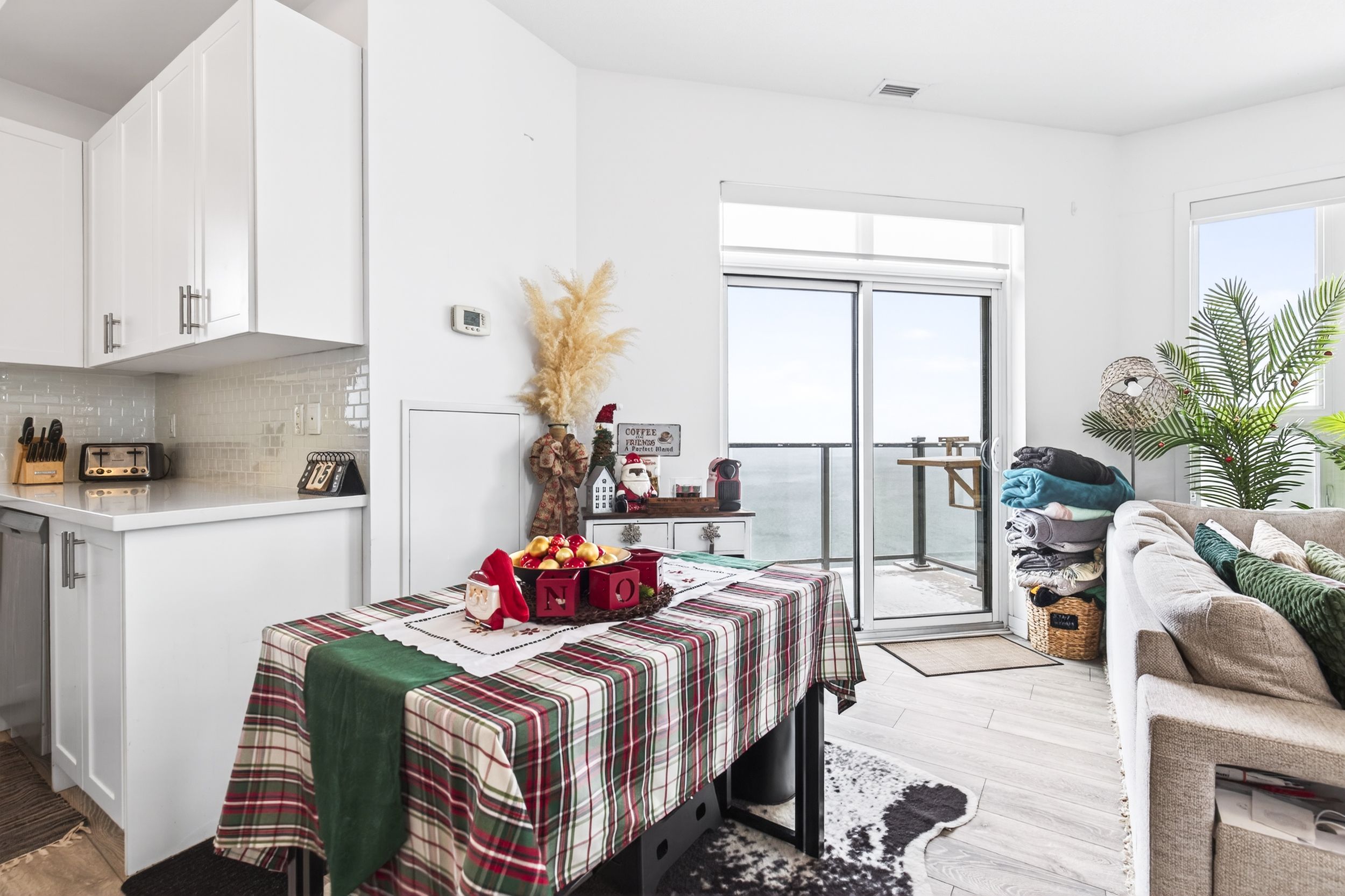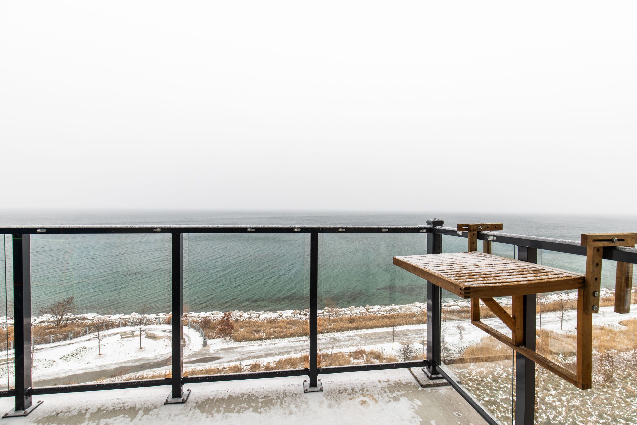 Penthouse living at the lake! Welcome to sapphire at waterfront trails, where waterfront living truly shines. This top-floor 2-bedroom, 2-bath penthouse suite offers the ultimate blend of style, comfort, and vacation-inspired living, every single day. Stunning lake views from the balcony and living areas! Soaring 10-foot ceilings and a bright open floor plan create an airy, inviting atmosphere. The modern kitchen is designed to impress with quartz countertops, stainless steel appliances, extended cabinetry, and a striking backsplash, making it perfect for both everyday living and entertaining. The spacious primary bedroom features a walk-in closet and private ensuite, while the second bedroom and full bath offer flexibility for guests, a home office, or additional living space. Contemporary vinyl flooring throughout the condo, in-suite laundry, modern blinds on all windows, and stylish finishes complete the space. Every room has a window for abundant natural light! Step outside to your private extended balcony and soak in the lake breeze, or head up to the breathtaking rooftop terrace for panoramic views of lake ontario-spectacular sunrises and sunsets included. This well-managed building offers premium amenities including a fully equipped gym, party room, bike storage, guest suites, and geo-thermal heating and cooling. Enjoy 1 underground parking space (#116) and 1 locker conveniently located on the 6th floor (locker number to be confirmed). Located steps from the waterfront trail, beach strip, and lake access, you can walk, bike, or even swim right at your doorstep. This is more than a condo-it's a lifestyle. Live where others vacation. Welcome home to sapphire.