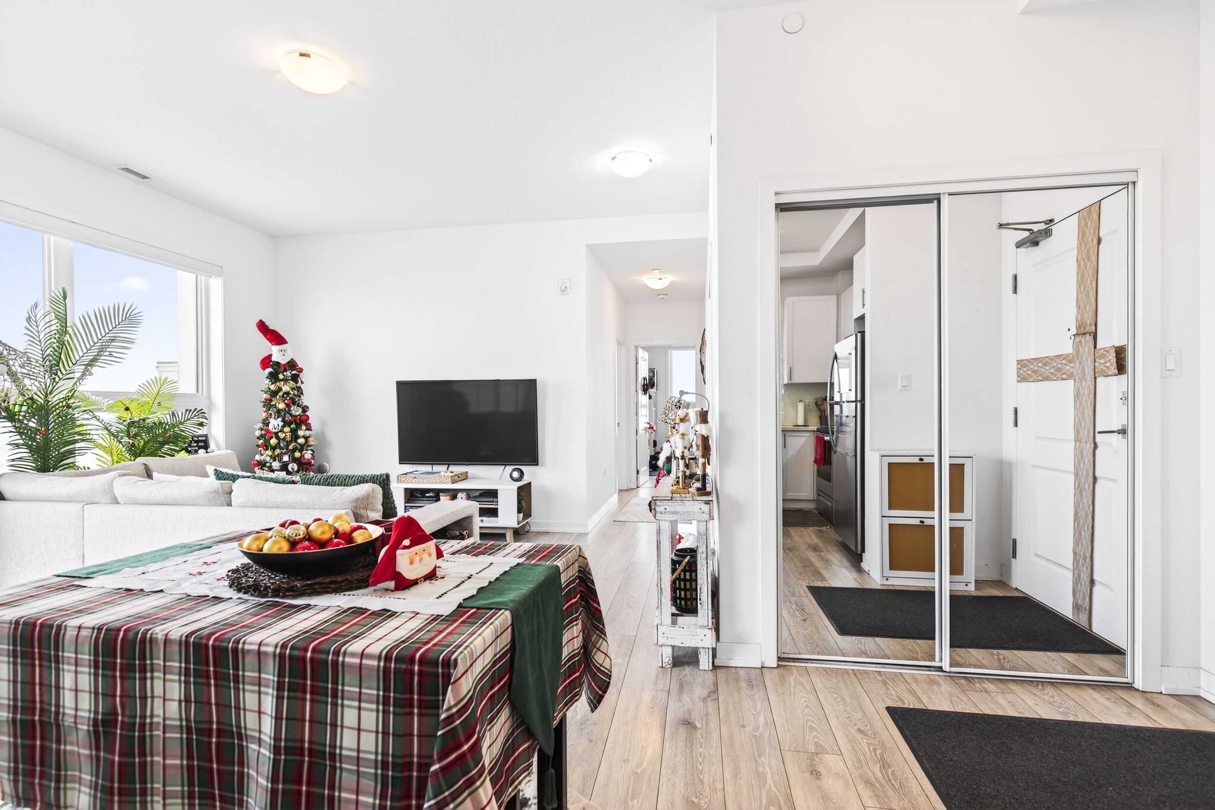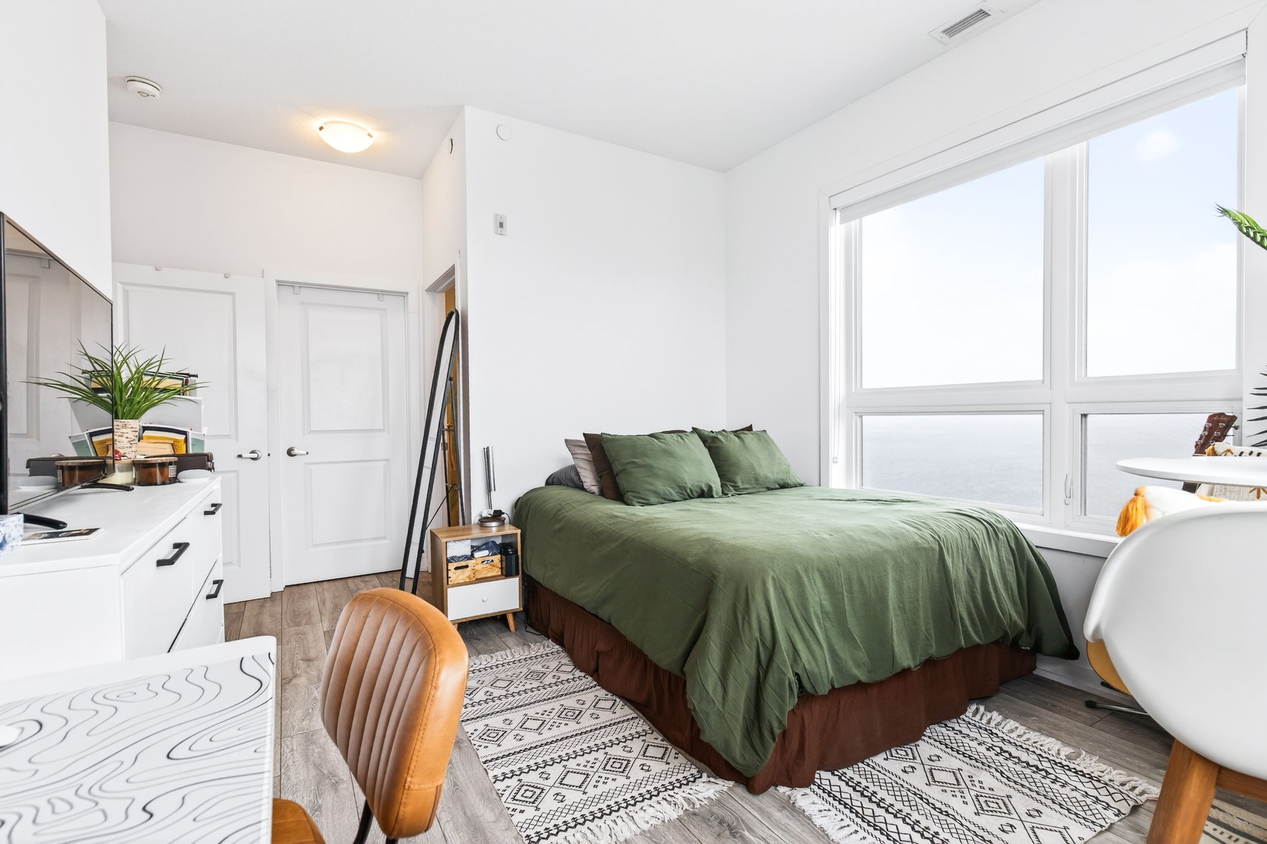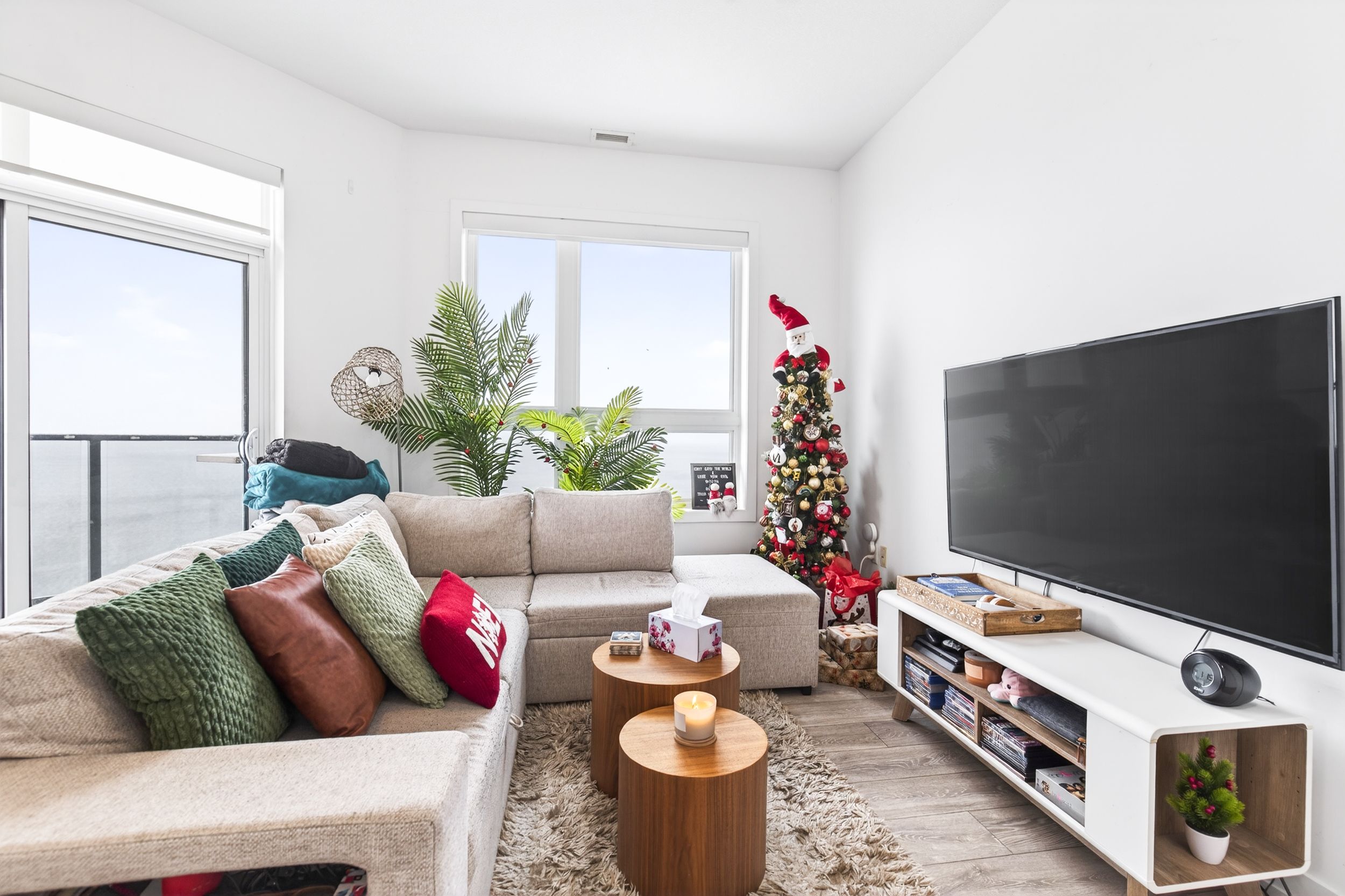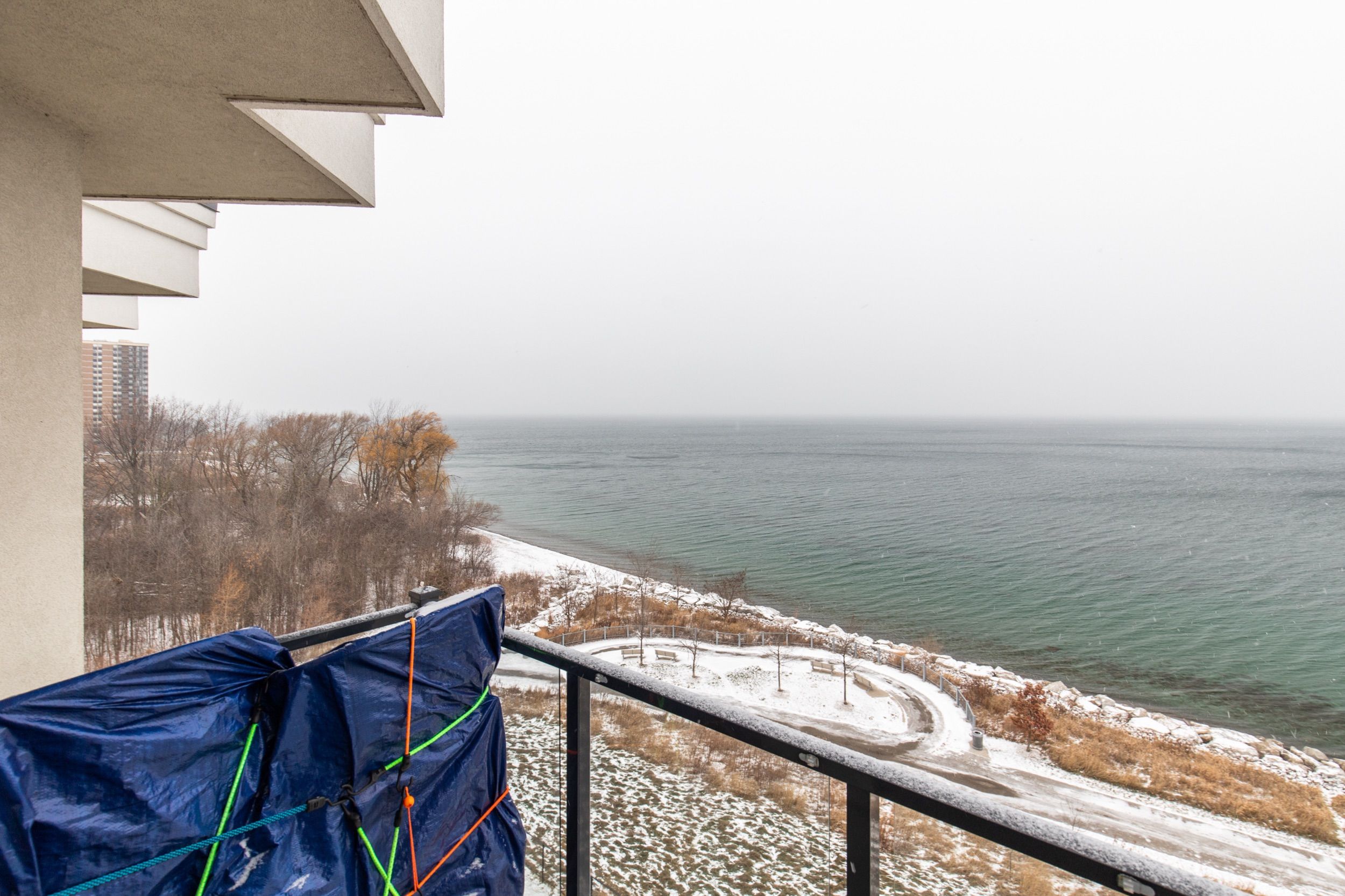 Penthouse living at the lake! Welcome to sapphire at waterfront trails, where waterfront living truly shines. This top-floor 2-bedroom, 2-bath penthouse suite offers the ultimate blend of style, comfort, and vacation-inspired living, every single day. Stunning lake views from the balcony and living areas! Soaring 10-foot ceilings and a bright open floor plan create an airy, inviting atmosphere. The modern kitchen is designed to impress with quartz countertops, stainless steel appliances, extended cabinetry, and a striking backsplash, making it perfect for both everyday living and entertaining. The spacious primary bedroom features a walk-in closet and private ensuite, while the second bedroom and full bath offer flexibility for guests, a home office, or additional living space. Contemporary vinyl flooring throughout the condo, in-suite laundry, modern blinds on all windows, and stylish finishes complete the space. Every room has a window for abundant natural light! Step outside to your private extended balcony and soak in the lake breeze, or head up to the breathtaking rooftop terrace for panoramic views of lake ontario-spectacular sunrises and sunsets included. This well-managed building offers premium amenities including a fully equipped gym, party room, bike storage, guest suites, and geo-thermal heating and cooling. Enjoy 1 underground parking space (#116) and 1 locker conveniently located on the 6th floor (locker number to be confirmed). Located steps from the waterfront trail, beach strip, and lake access, you can walk, bike, or even swim right at your doorstep. This is more than a condo-it's a lifestyle. Live where others vacation. Welcome home to sapphire.