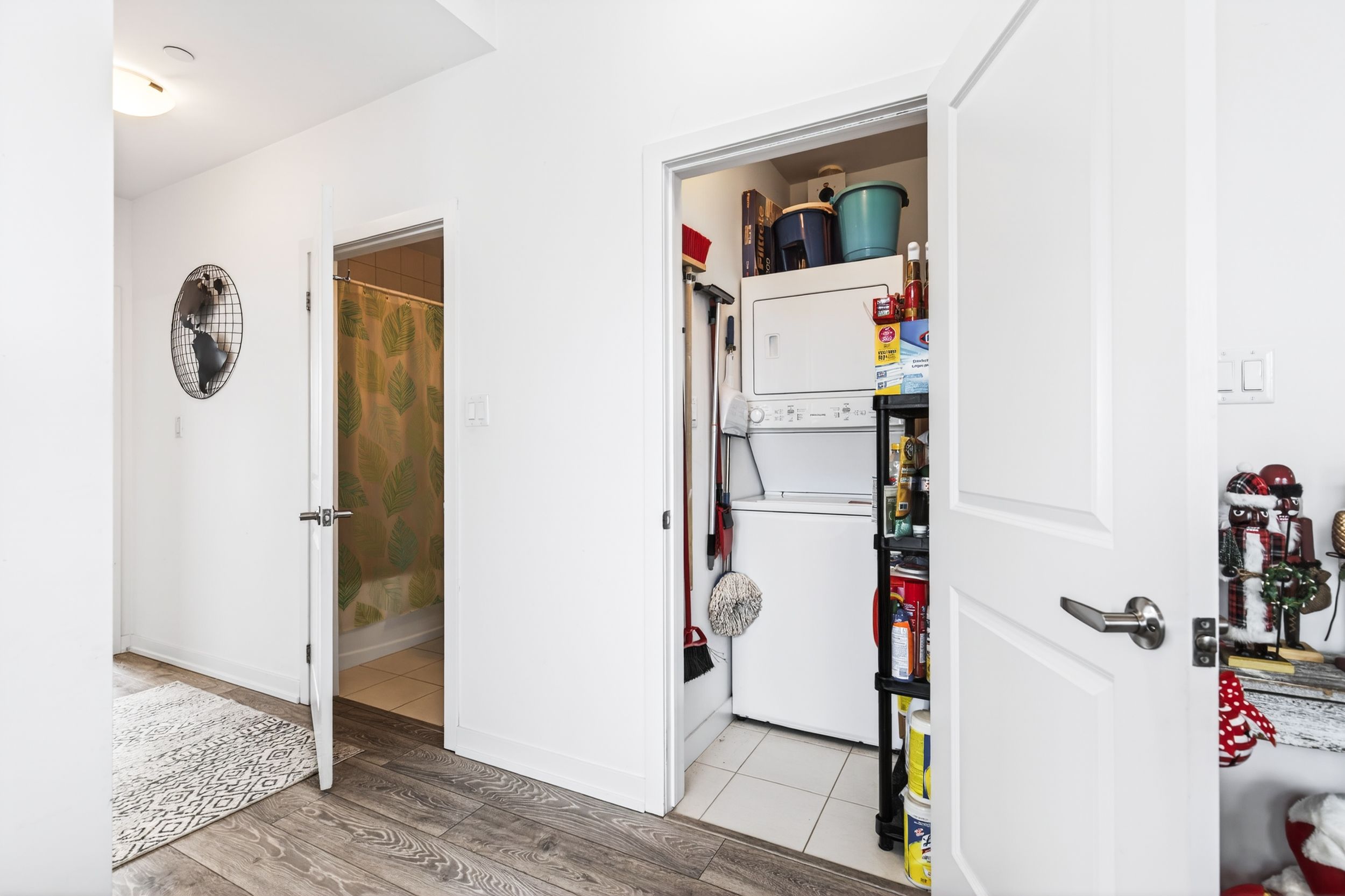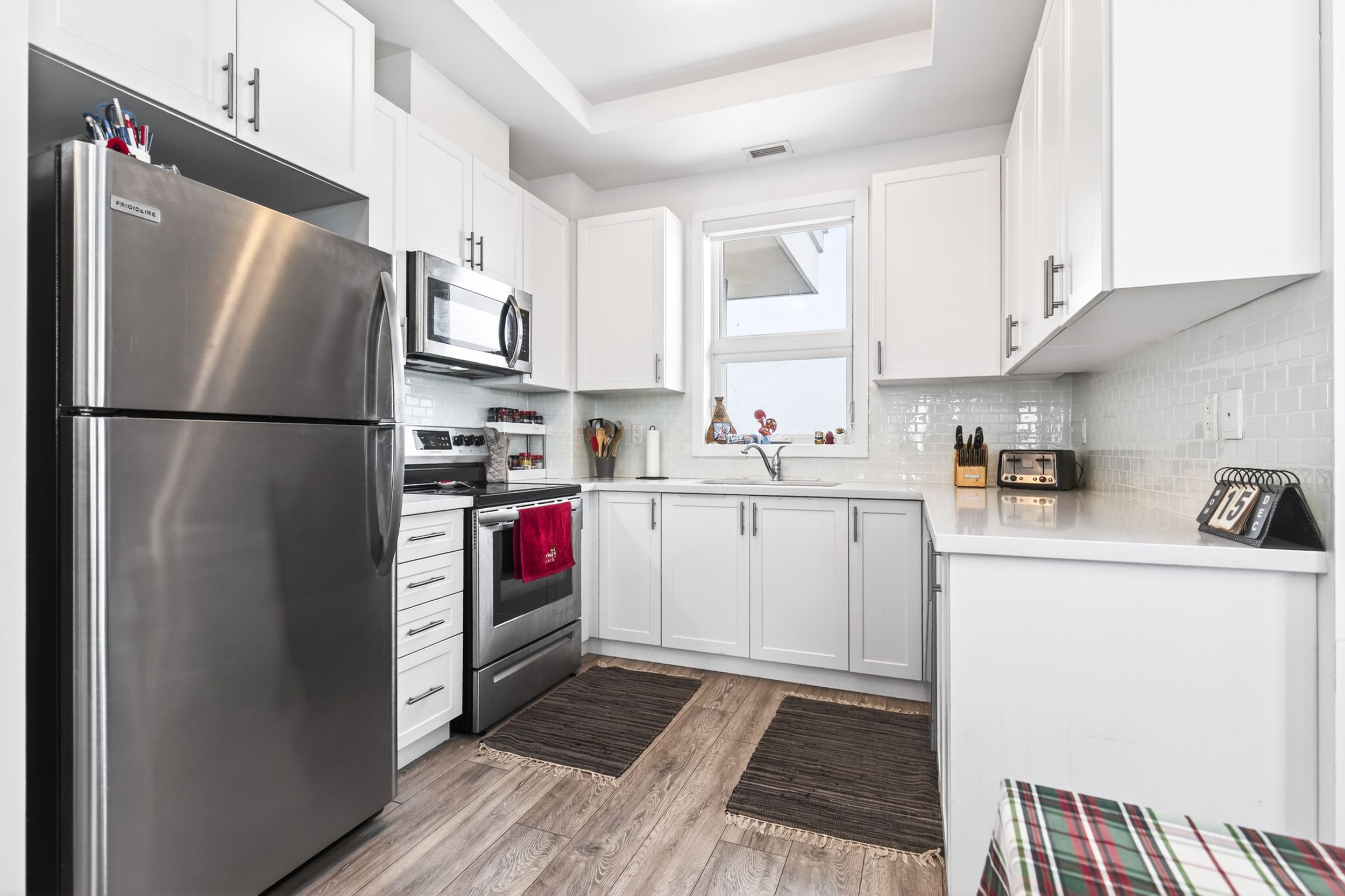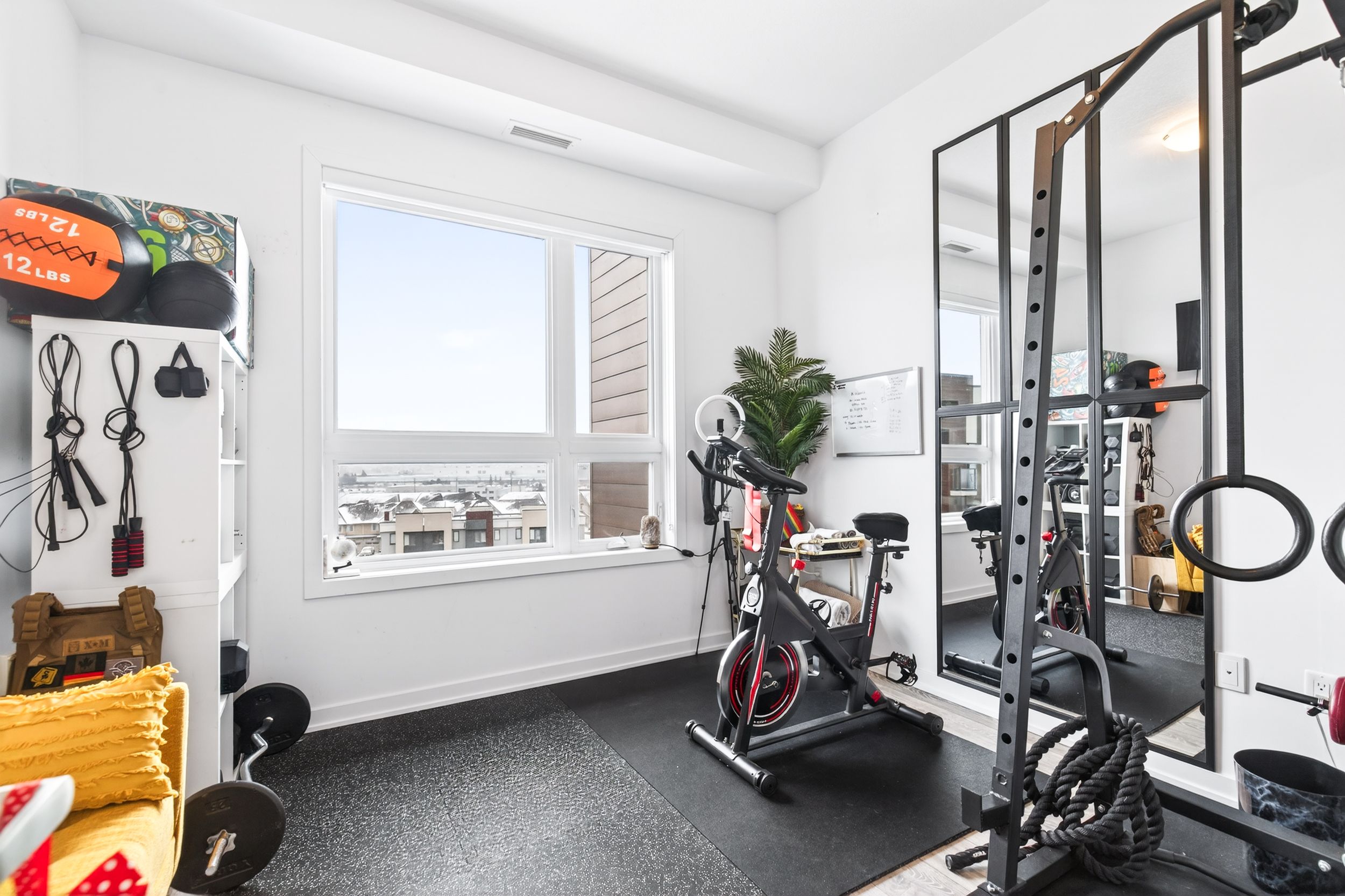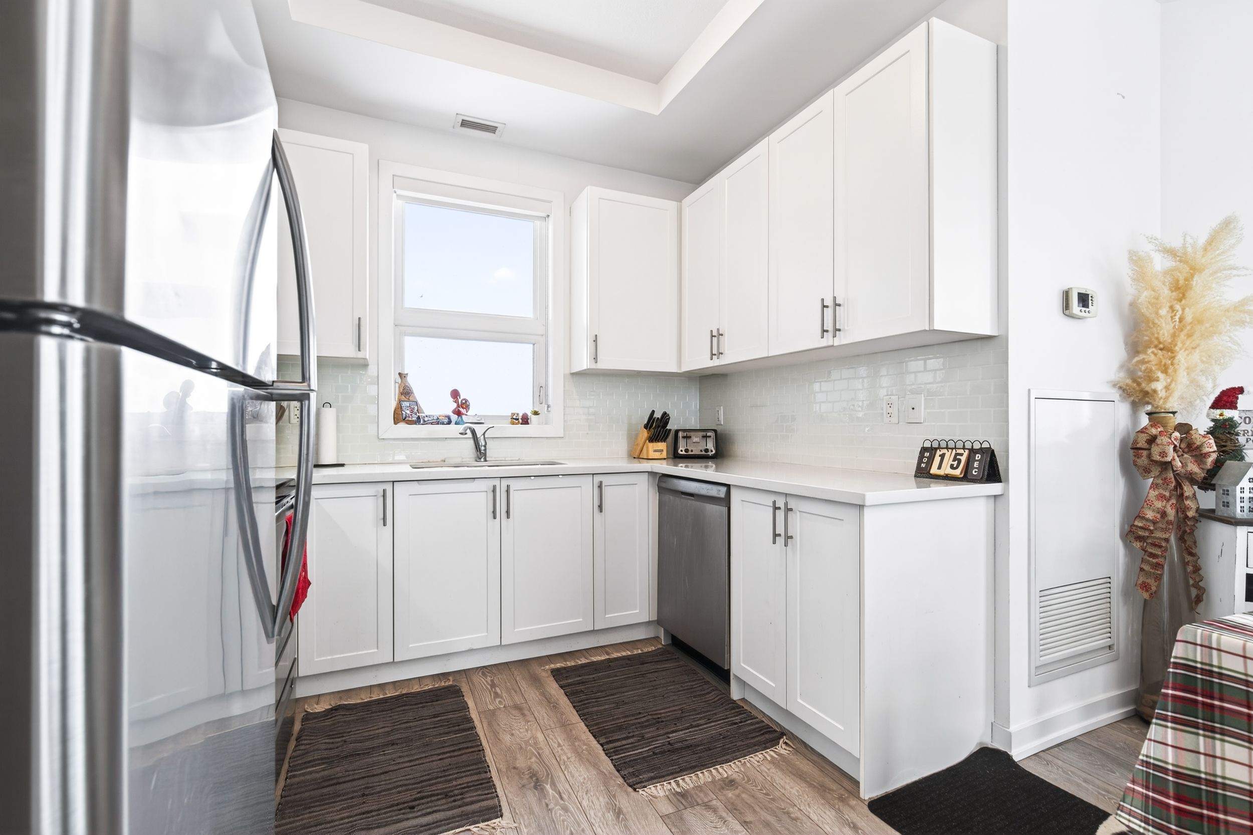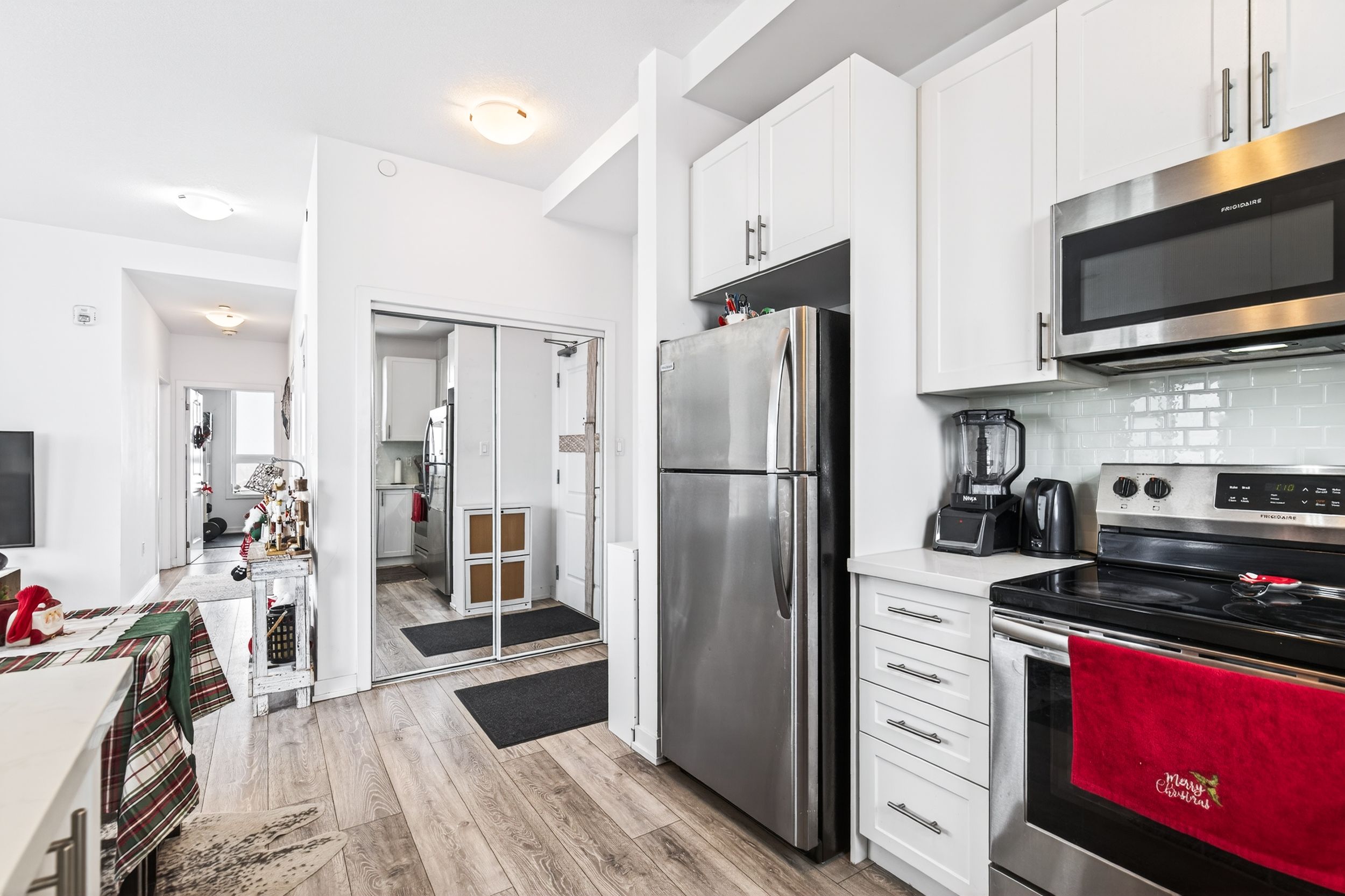 Penthouse living at the lake! Welcome to sapphire at waterfront trails, where waterfront living truly shines. This top-floor 2-bedroom, 2-bath penthouse suite offers the ultimate blend of style, comfort, and vacation-inspired living, every single day. Stunning lake views from the balcony and living areas! Soaring 10-foot ceilings and a bright open floor plan create an airy, inviting atmosphere. The modern kitchen is designed to impress with quartz countertops, stainless steel appliances, extended cabinetry, and a striking backsplash, making it perfect for both everyday living and entertaining. The spacious primary bedroom features a walk-in closet and private ensuite, while the second bedroom and full bath offer flexibility for guests, a home office, or additional living space. Contemporary vinyl flooring throughout the condo, in-suite laundry, modern blinds on all windows, and stylish finishes complete the space. Every room has a window for abundant natural light! Step outside to your private extended balcony and soak in the lake breeze, or head up to the breathtaking rooftop terrace for panoramic views of lake ontario-spectacular sunrises and sunsets included. This well-managed building offers premium amenities including a fully equipped gym, party room, bike storage, guest suites, and geo-thermal heating and cooling. Enjoy 1 underground parking space (#116) and 1 locker conveniently located on the 6th floor (locker number to be confirmed). Located steps from the waterfront trail, beach strip, and lake access, you can walk, bike, or even swim right at your doorstep. This is more than a condo-it's a lifestyle. Live where others vacation. Welcome home to sapphire.