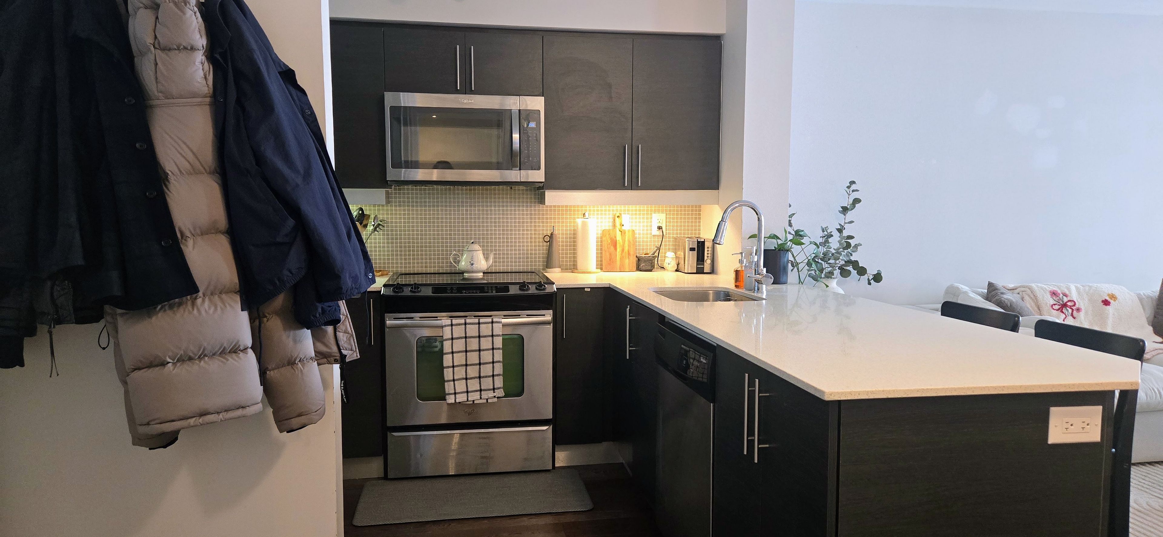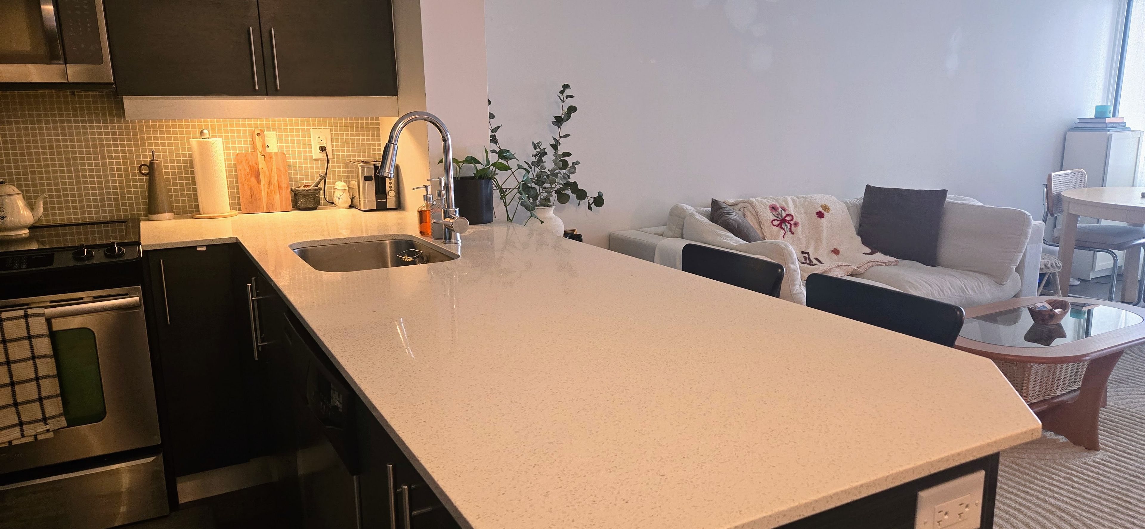 • Modern kitchen features quartz countertops and full-sized appliances.