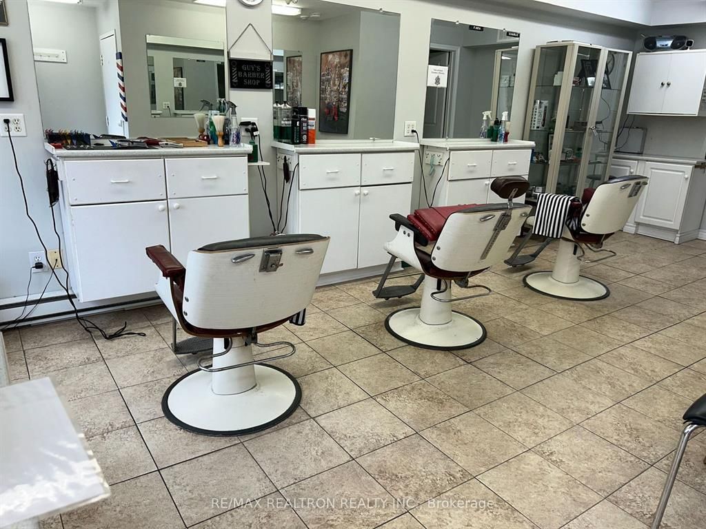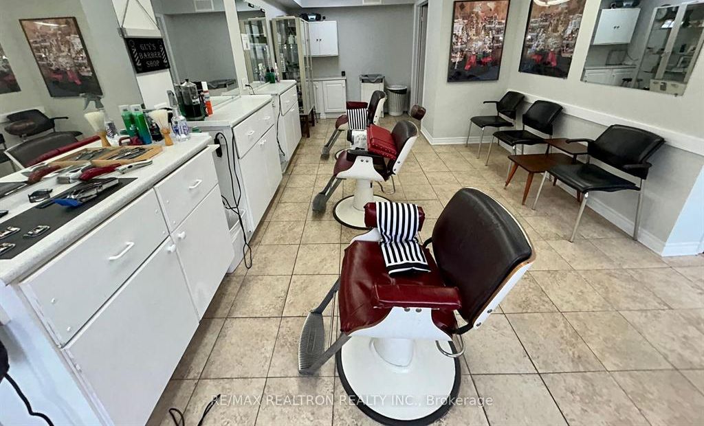 Retail / office space for lease. Presently a very well established barber shop with over 20 years in operation. 3 chair stations, 1 wash sink, large client base. Great location close to 401 & go train & high rise buildings. Street level private entrance. Tenant to pay separately metered hydro, & proportionate share of tmi.