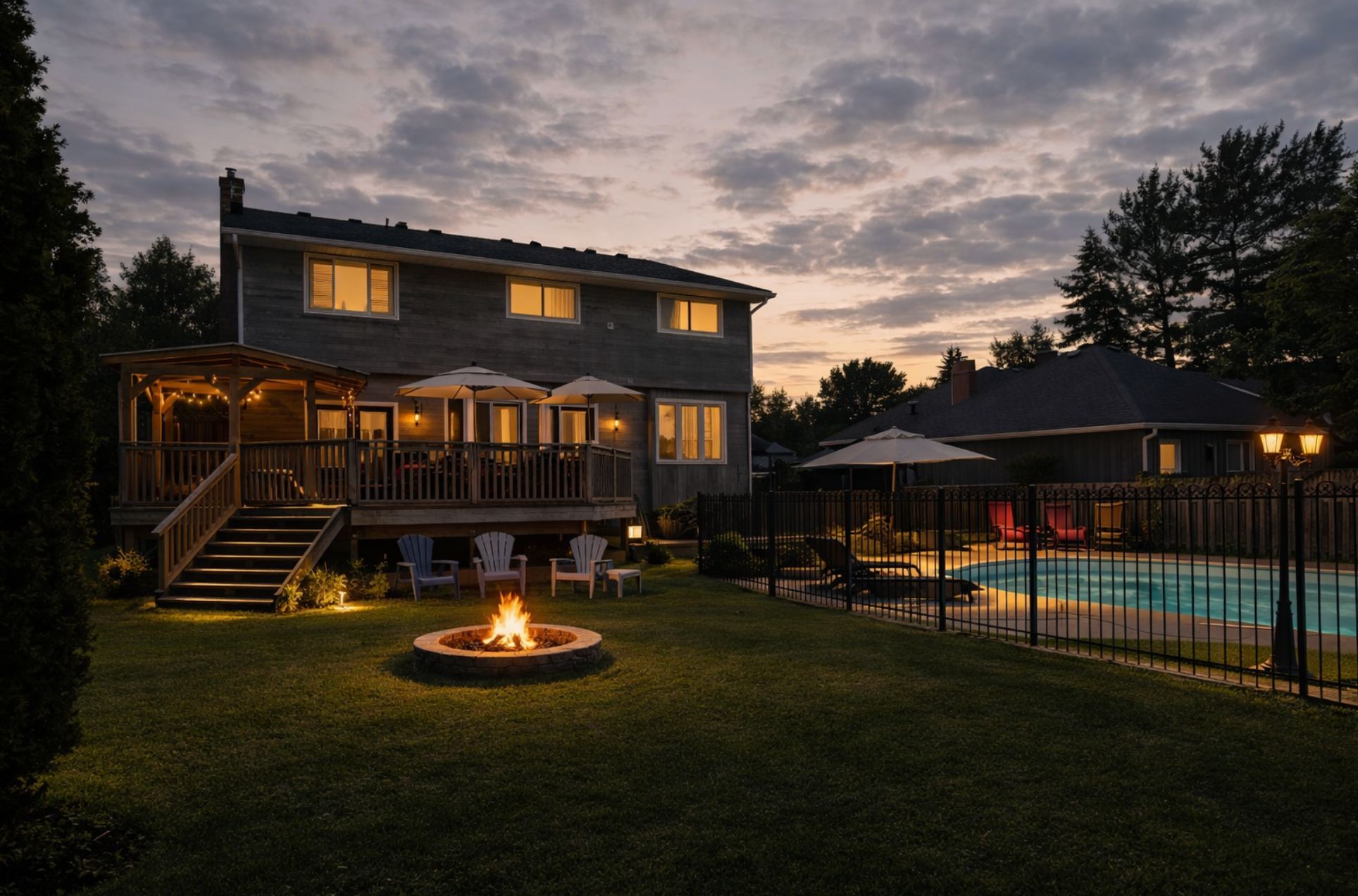 • Private backyard with in-ground pool, hot tub, and fire pit for relaxation.
