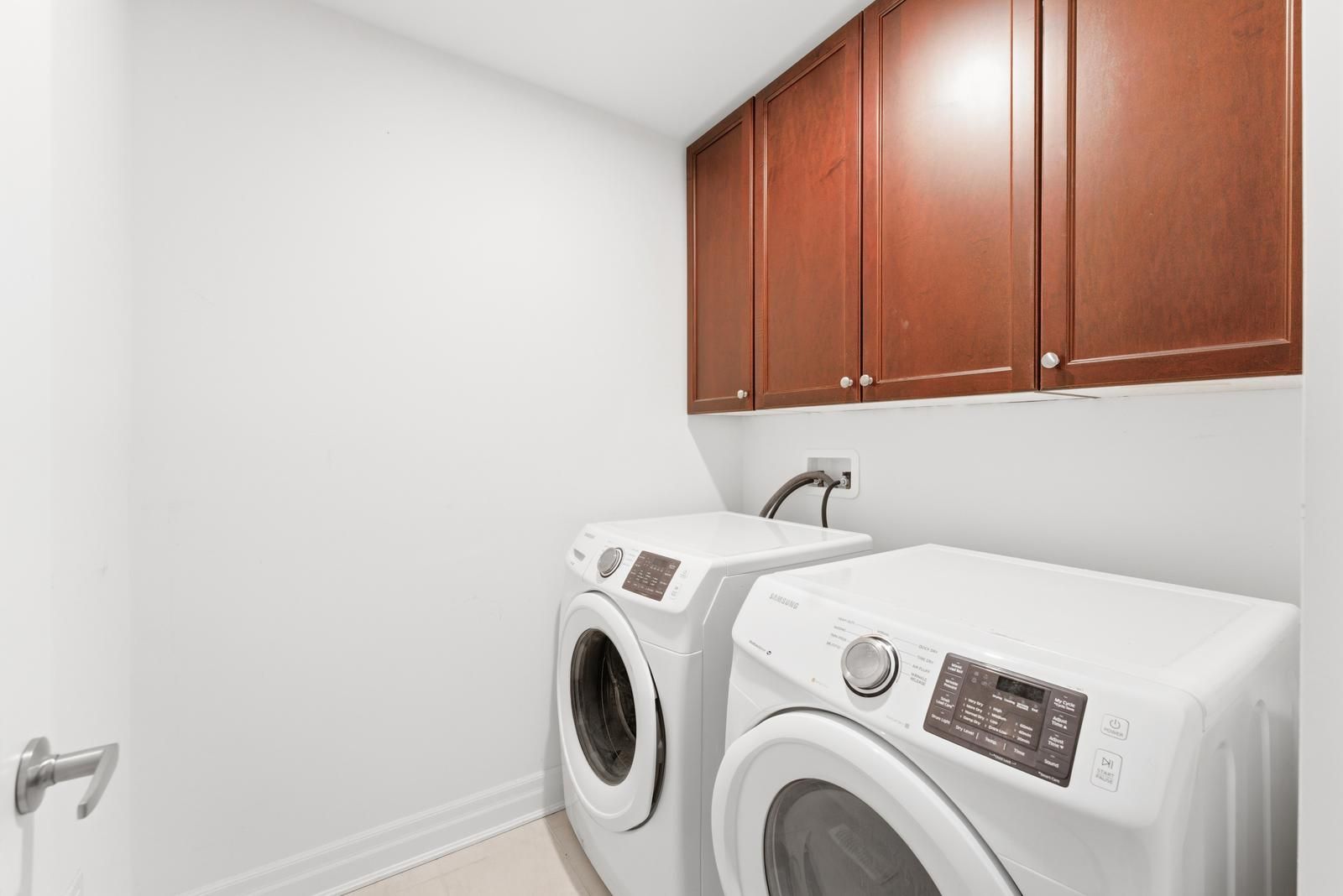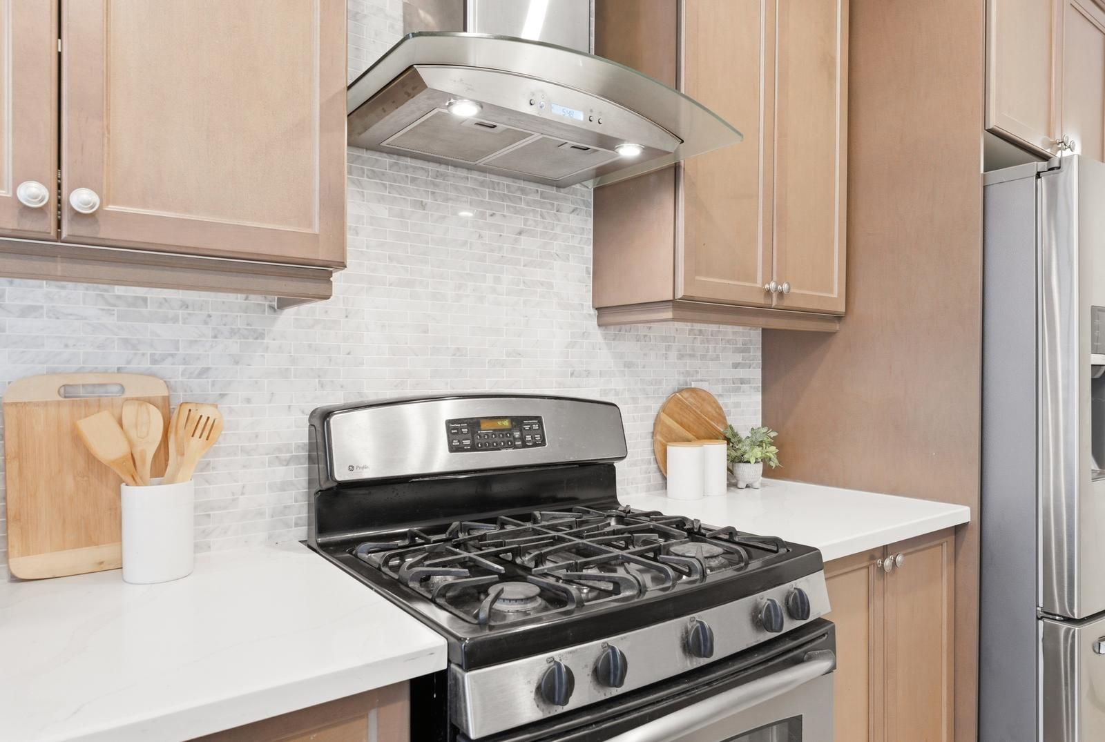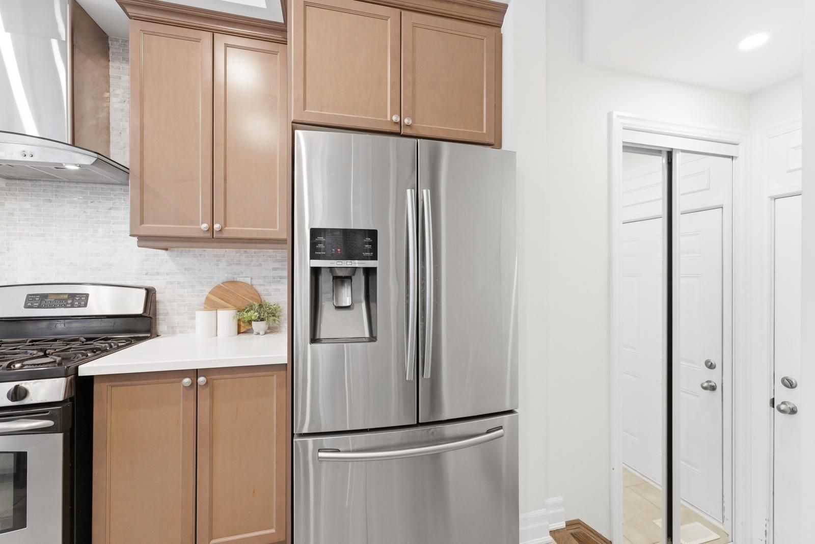 • Gourmet kitchen with stainless steel appliances and quartz countertops.