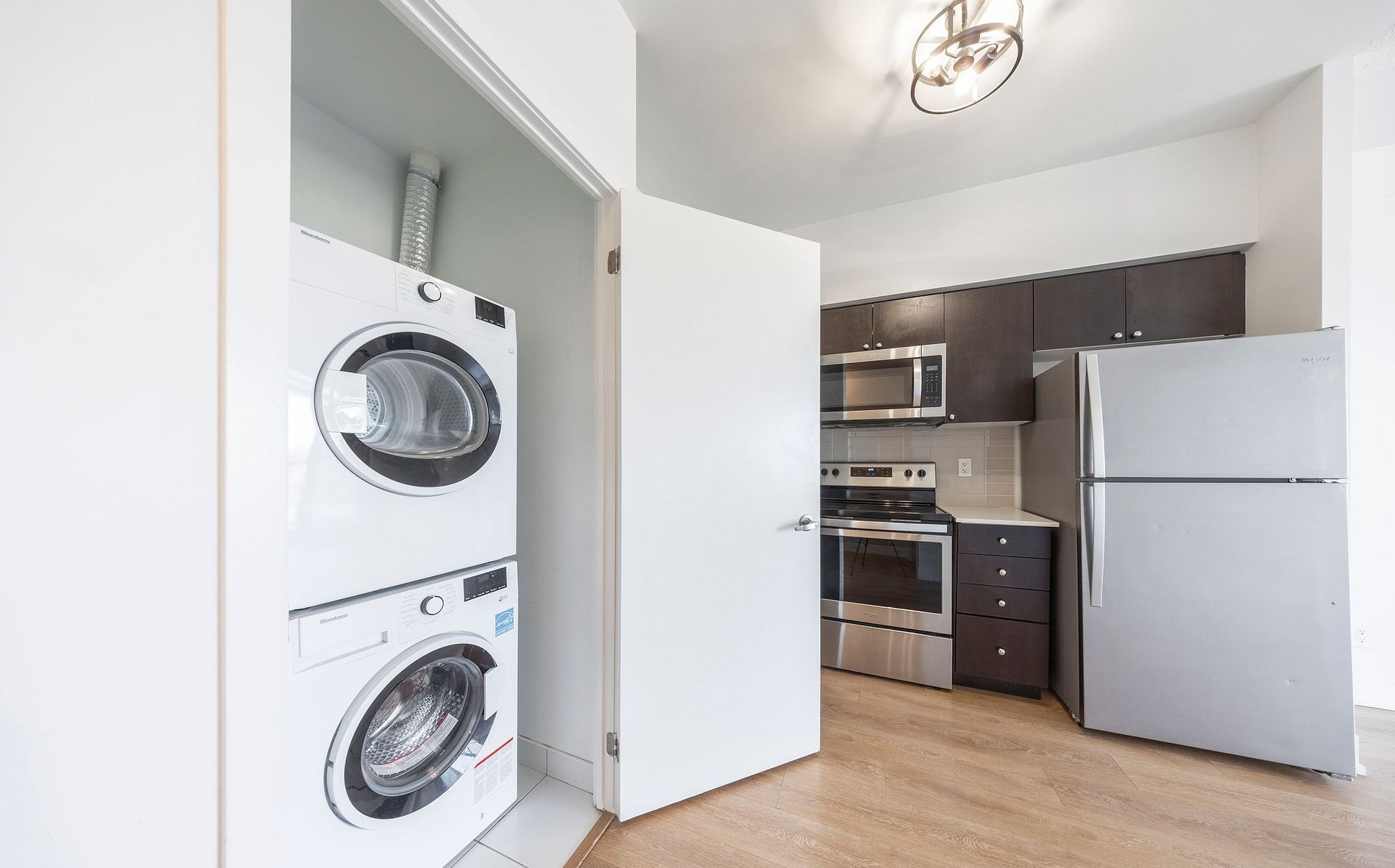 Stunning view the city! Fresh paint + new floors in bedroom. Bright and spacious 1 bed + 1bathroom comes with 1 parking for lease at 401 & liverpool! Steps away from pickering town centre, go station, 401, library, cineplex, frenchman's bay marina & grocery stores. Amenities include: 24 hr security, gym, outdoor pool, bbq, sauna, party room & visitor parking. Internet & cable included with rent. Existing fridge, stove, b/i dishwasher, stack washer anddryer.