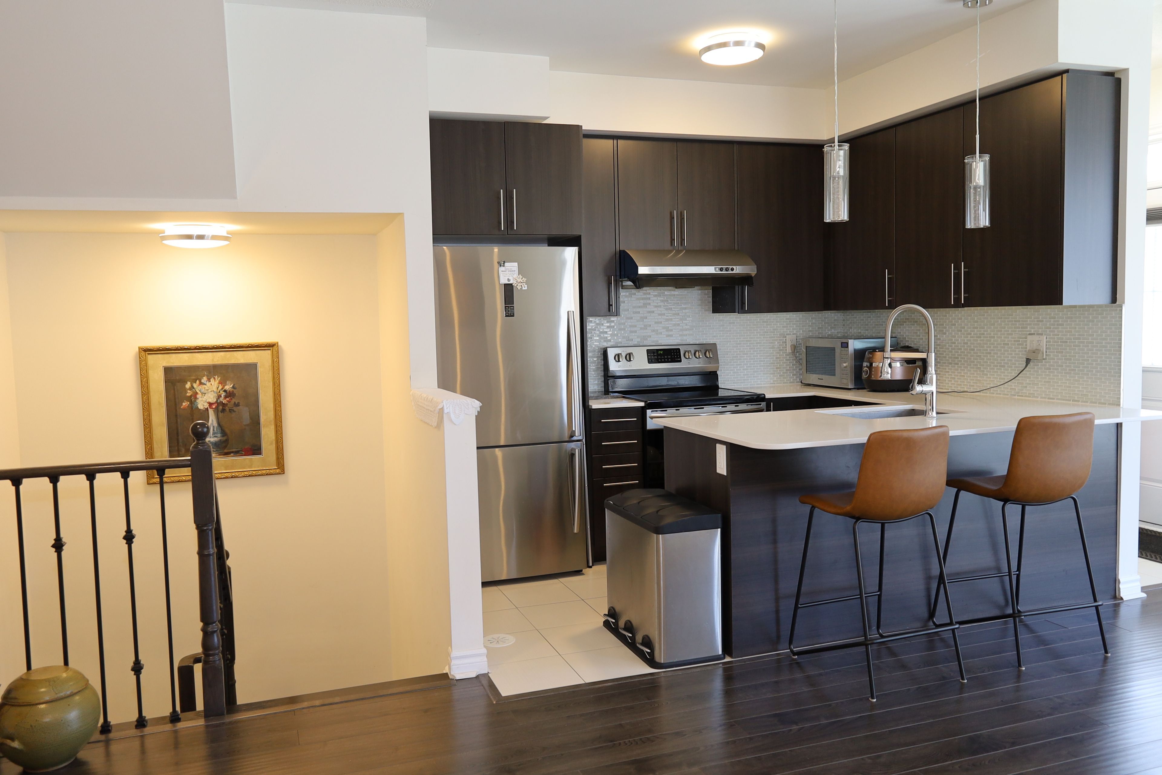 • High-end finishes with 9 ft ceilings and an upgraded kitchen.