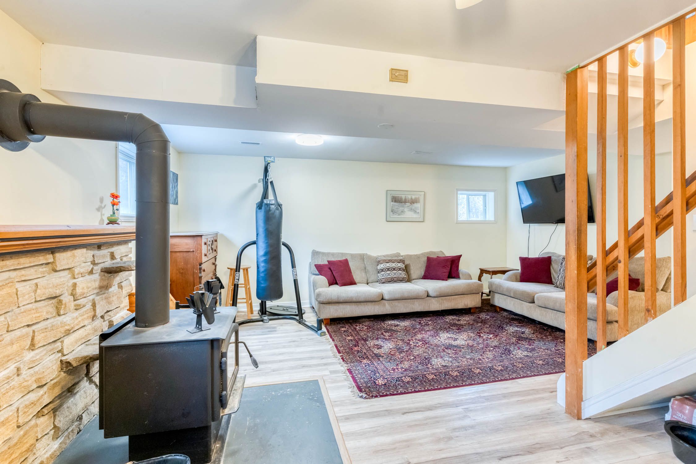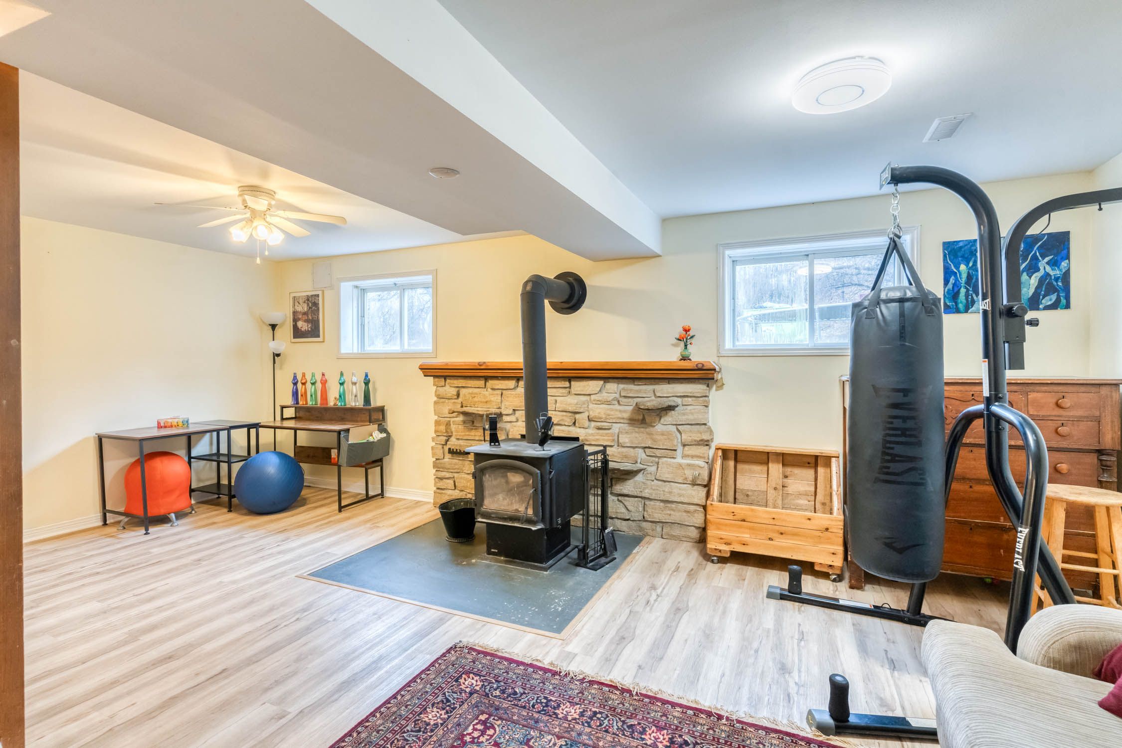 • Sun-filled lower level with cozy wood stove for winter warmth.