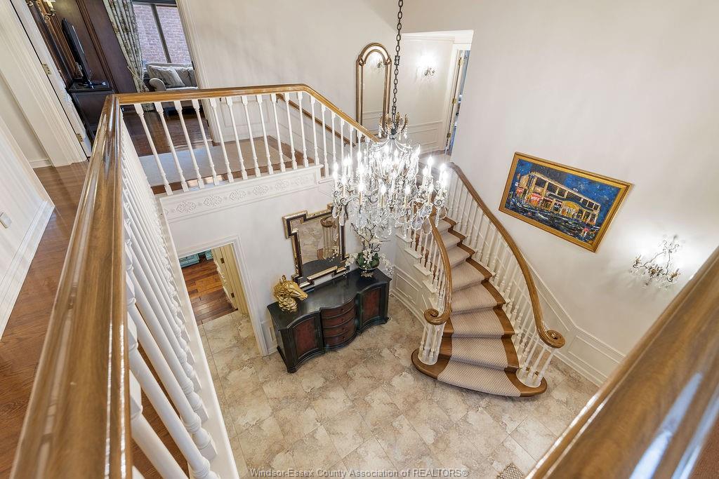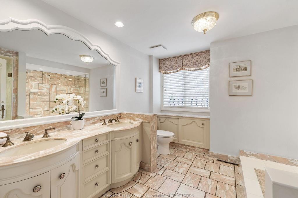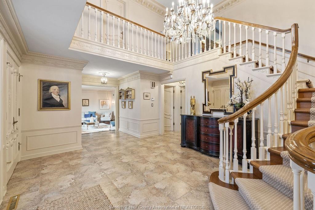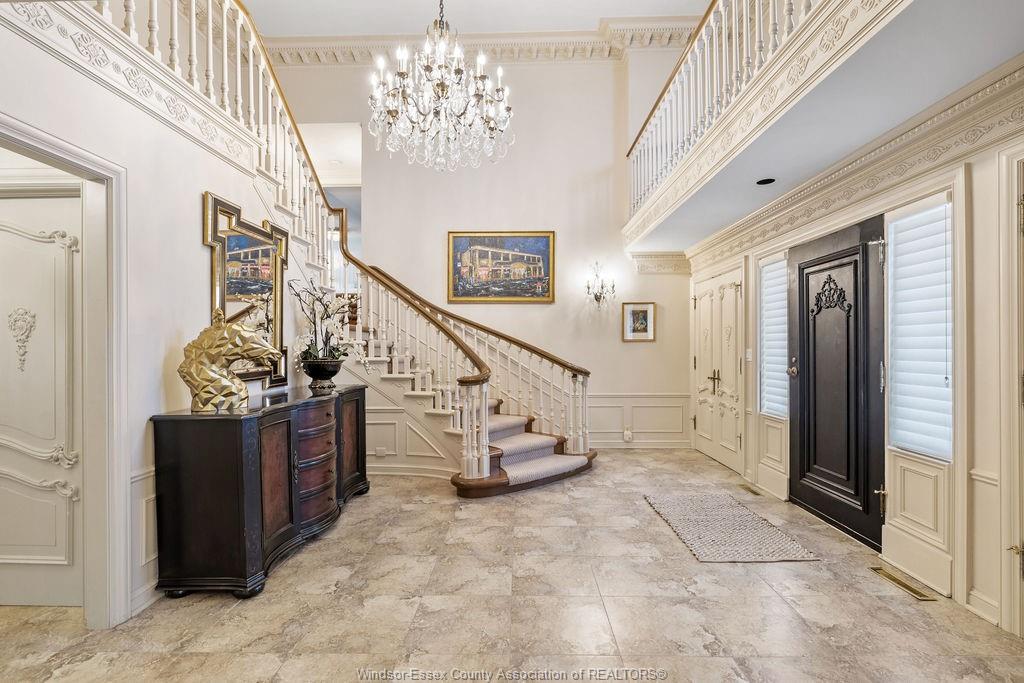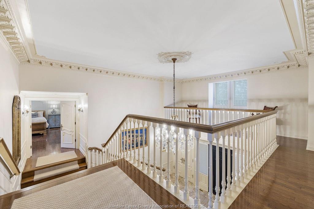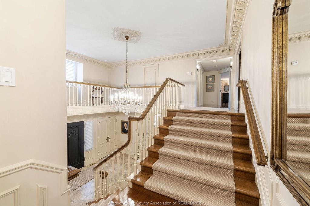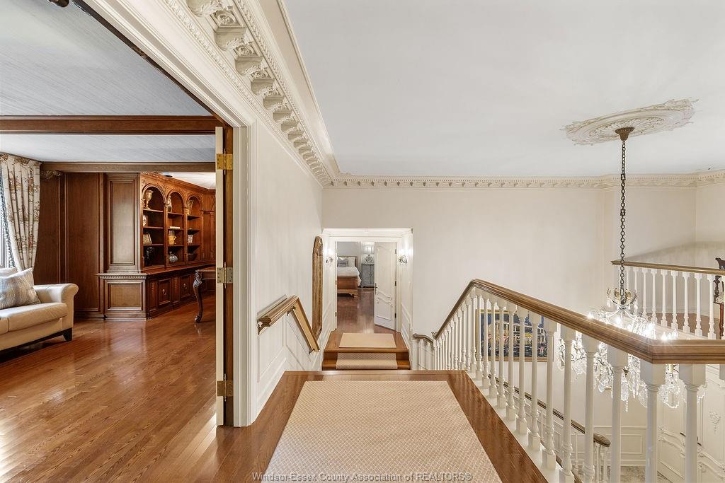 Executive estate on secluded street steps from essex golf & country club & u. S. This home features classic architecture with superb quality. Exquisite oak staircase & grand foyer welcomes you to this lavish home, every room is spacious w/numerous custom details. Sunken liv rm, formal din rm, very large open concept kitchen w/a 11ft island, separate bar area & family rm w/gas fireplace overlooking serene yard. 2nd flr provides a 800 sq ft(approx) primary suite w/walk-in clsts, ensuite w/rare marble dressing room, steps to 2 oversized bdrms or work from home in the walnut lined library/den. This private property is surrounded by 5ft brick wall & tall mature trees w/no rear neighbours & lush landscaping. Quality is evident w/all plaster construction, stacked crown mouldings, solid wood doors w/detailed carvings, rare marbles, granite/quartz; hand scraped walnut, porcelain tiles. Some updates incl: furnaces(both) '23, plumbing/electrical fixtures '23. Perfect for the most discerning buyer.