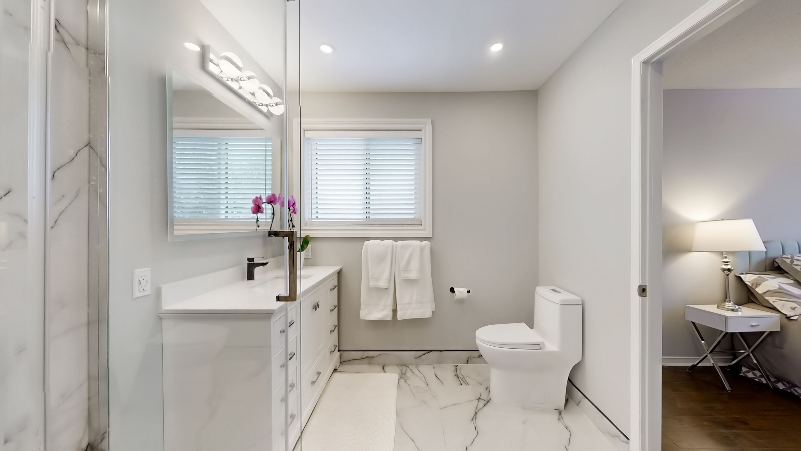 • Spacious primary bedroom features deep his and hers closets for ample storage.