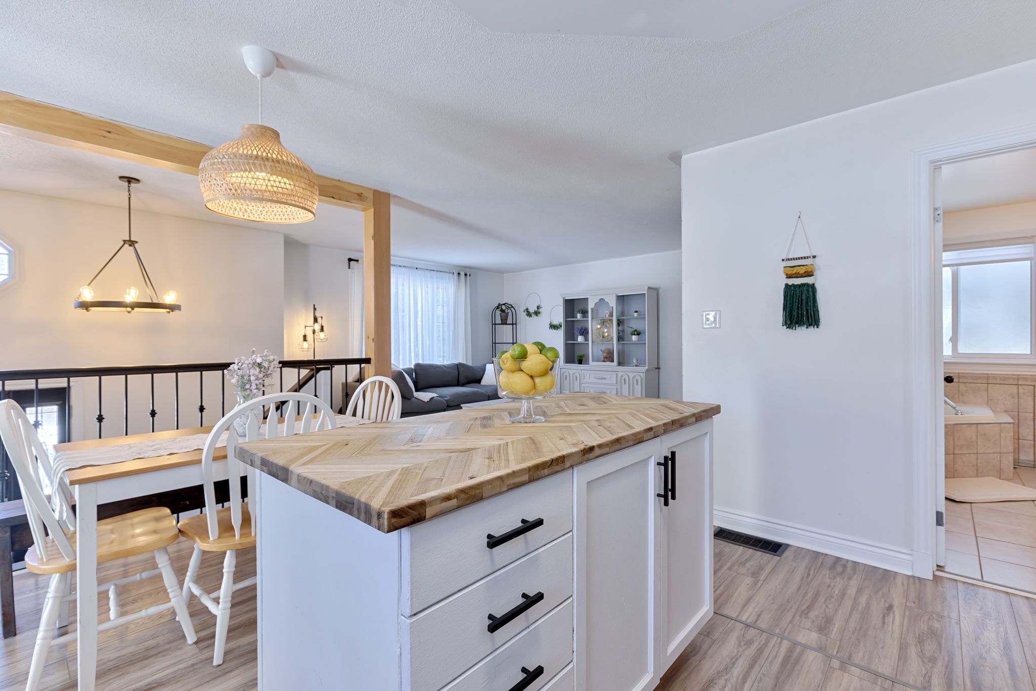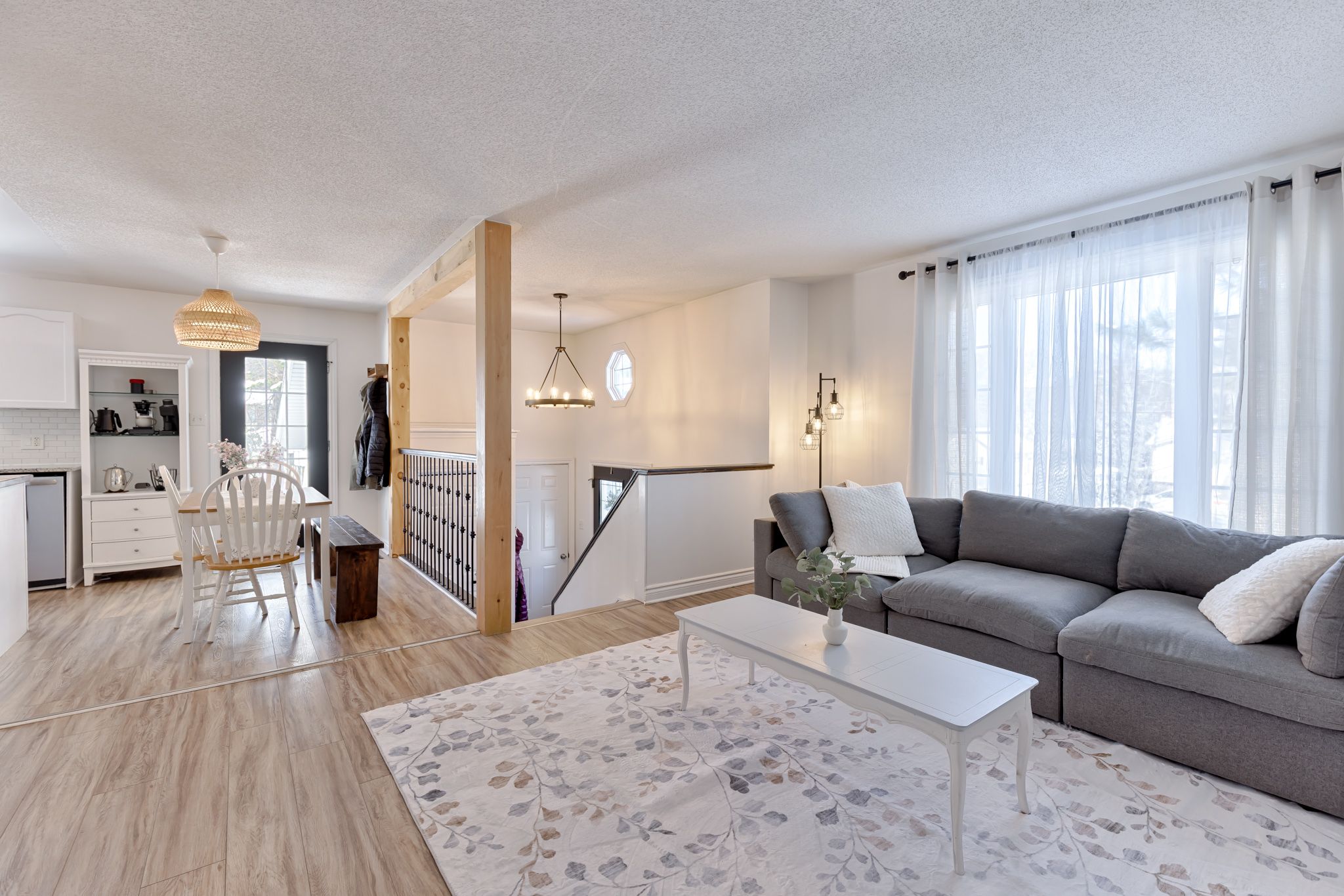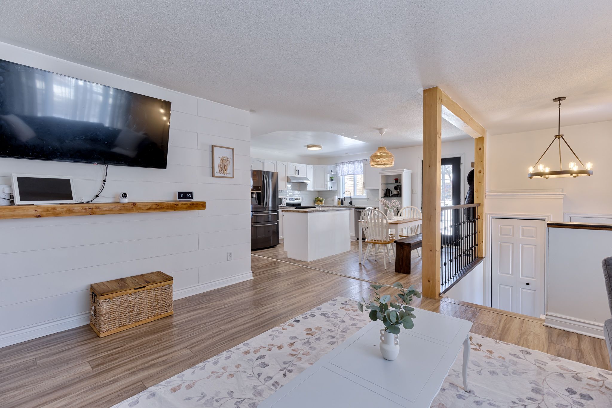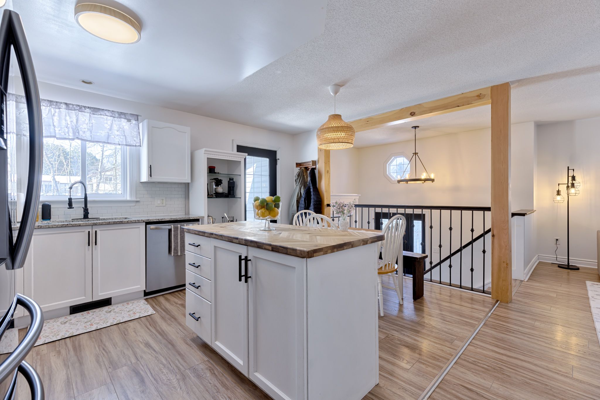 • Bright open concept layout with updated kitchen and dining area.