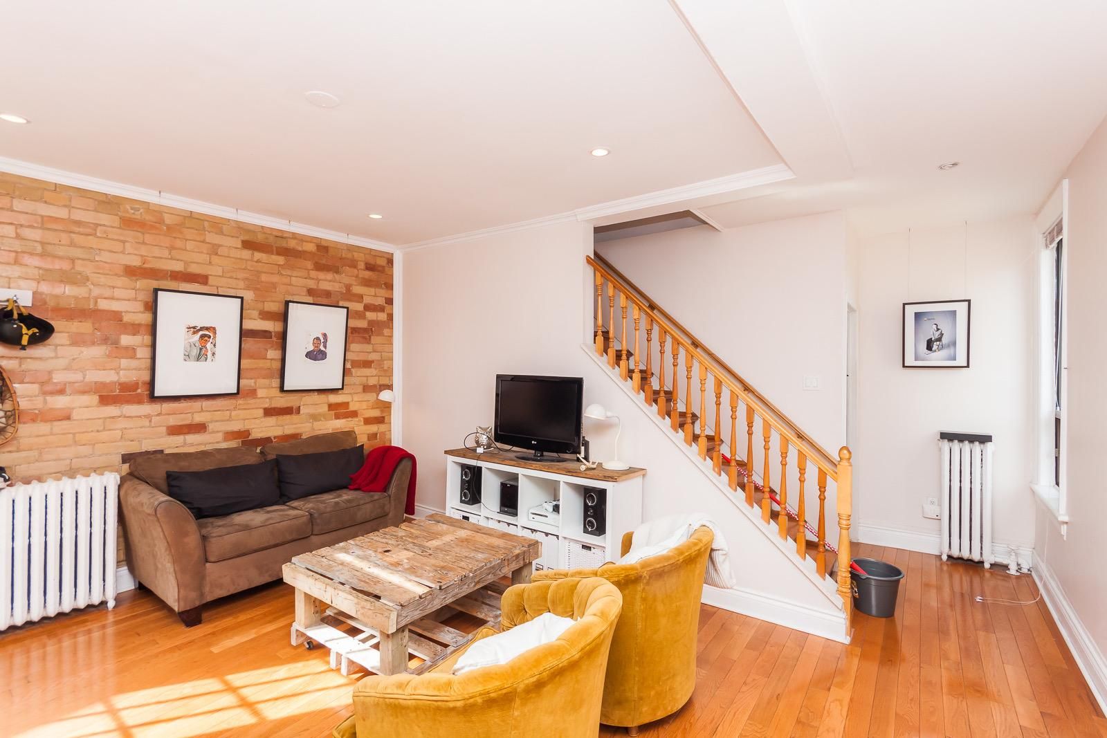 • Charming 3-bedroom unit with exposed brick walls and hardwood floors.