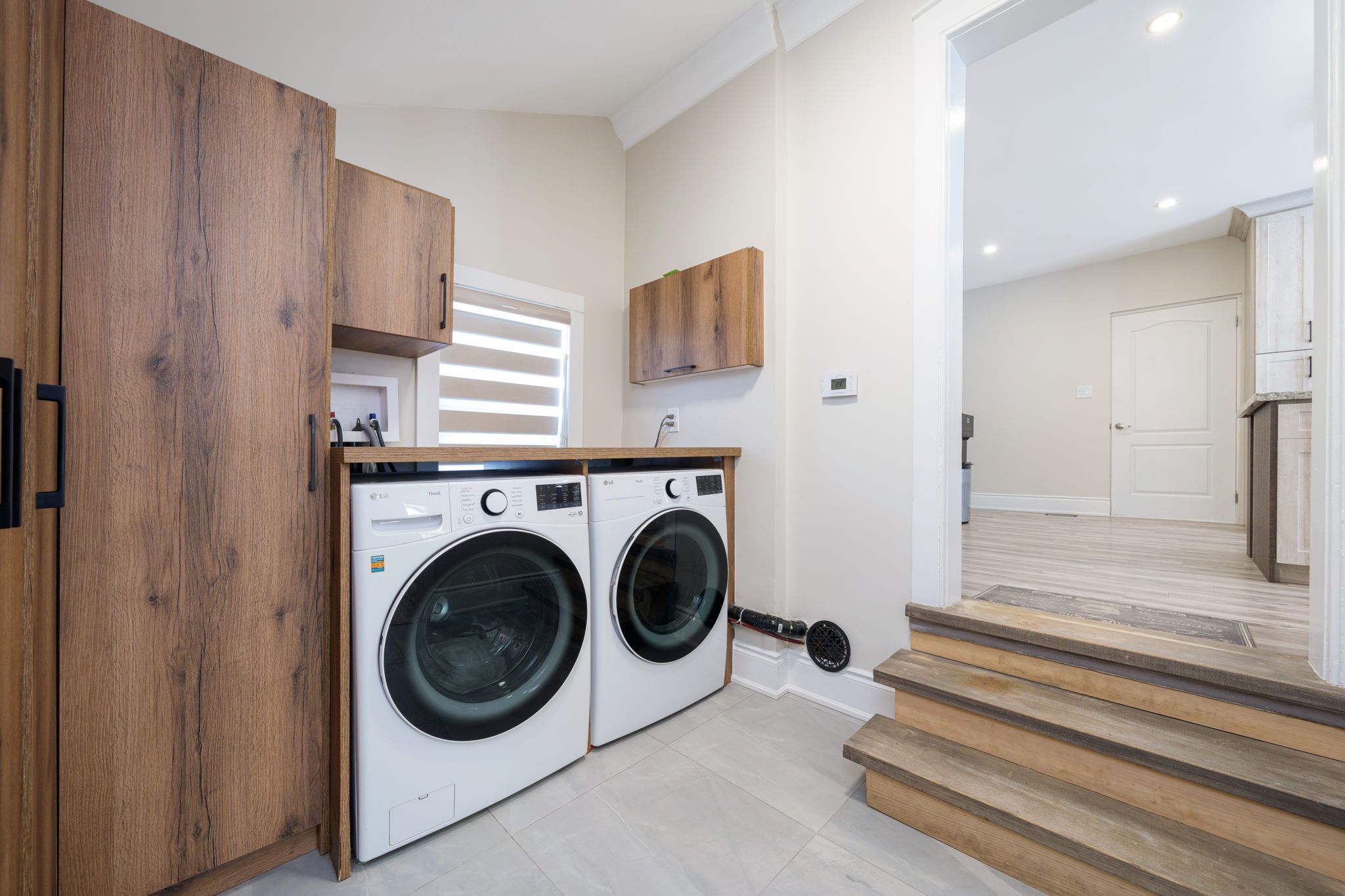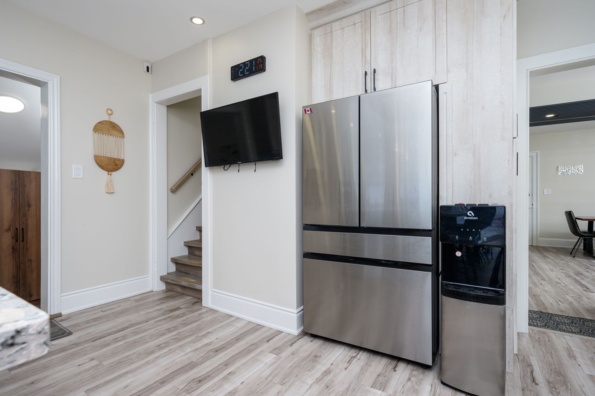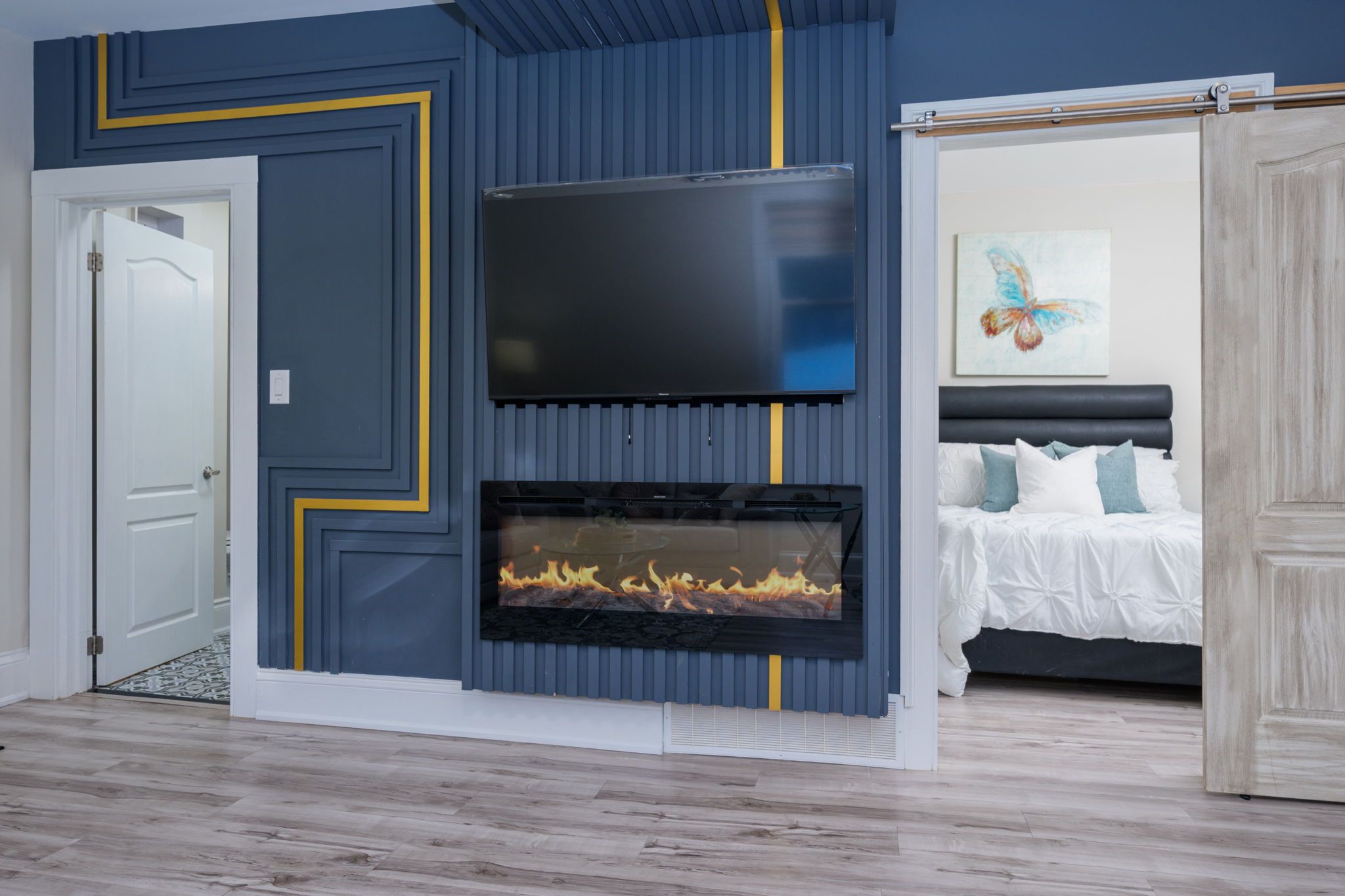 • Open-concept living and dining area with stylish flooring and electric fireplace.