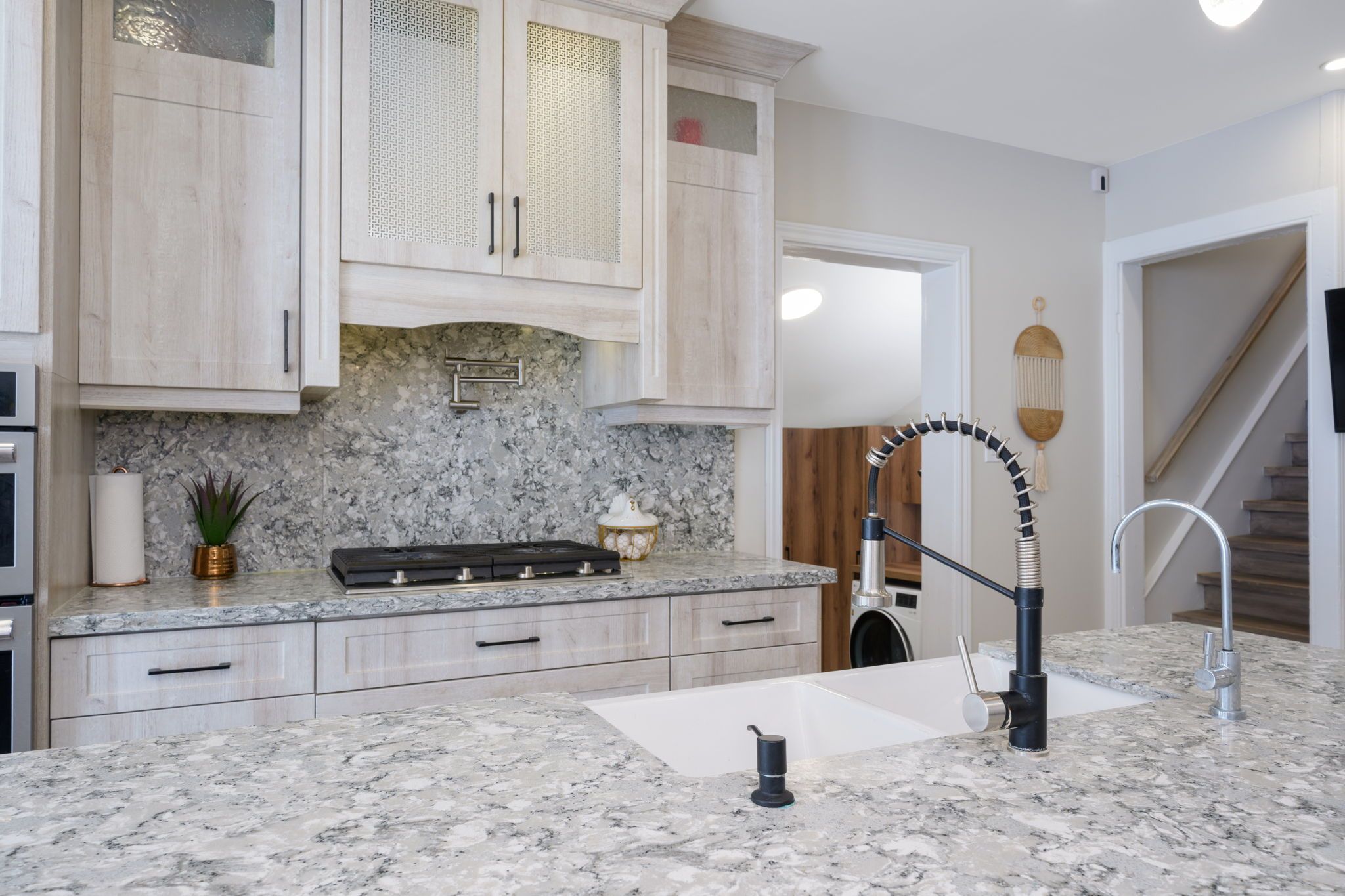 • Chef-inspired kitchen with a large island, quartz counters, and stainless appliances.
