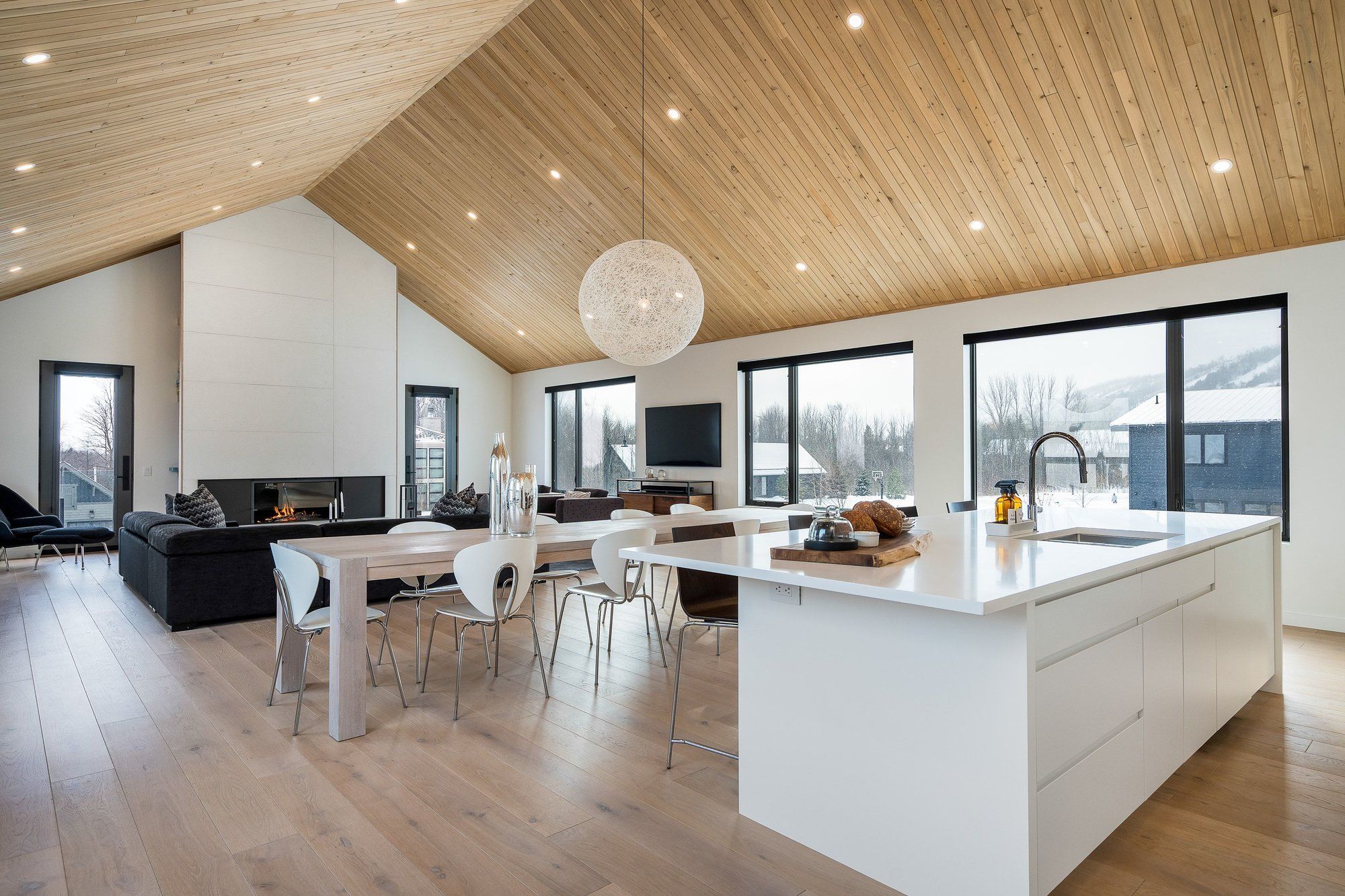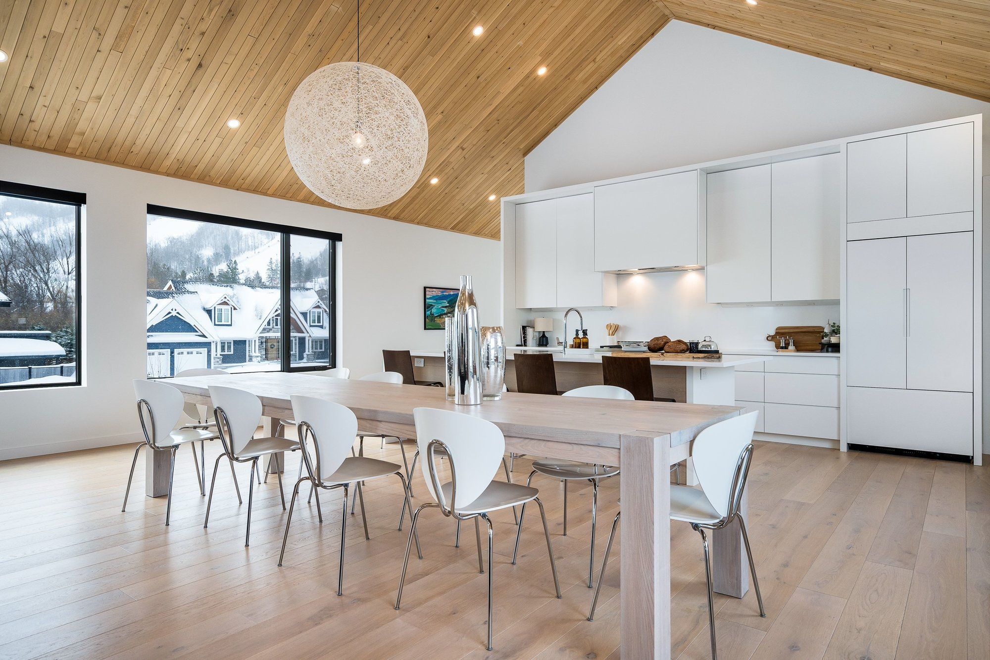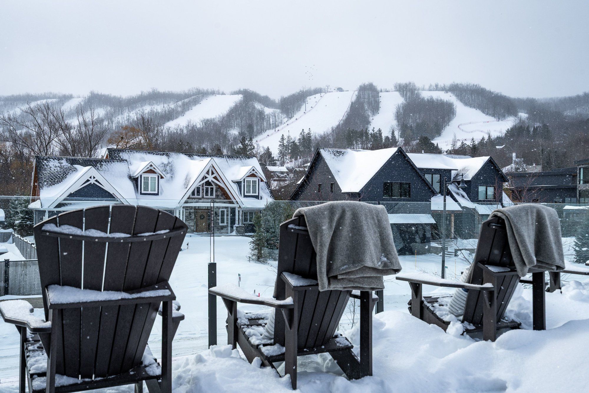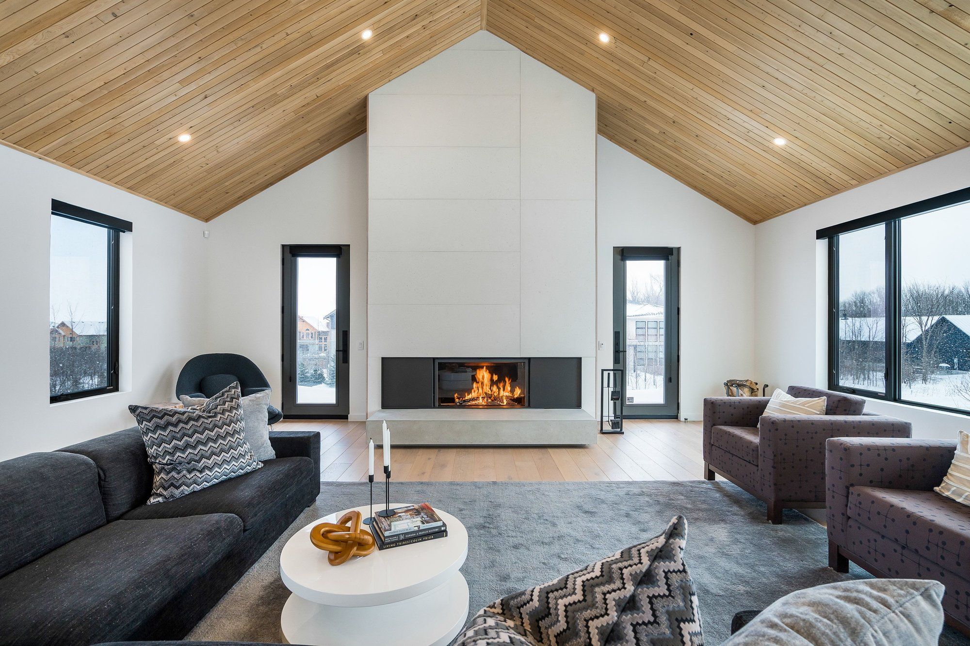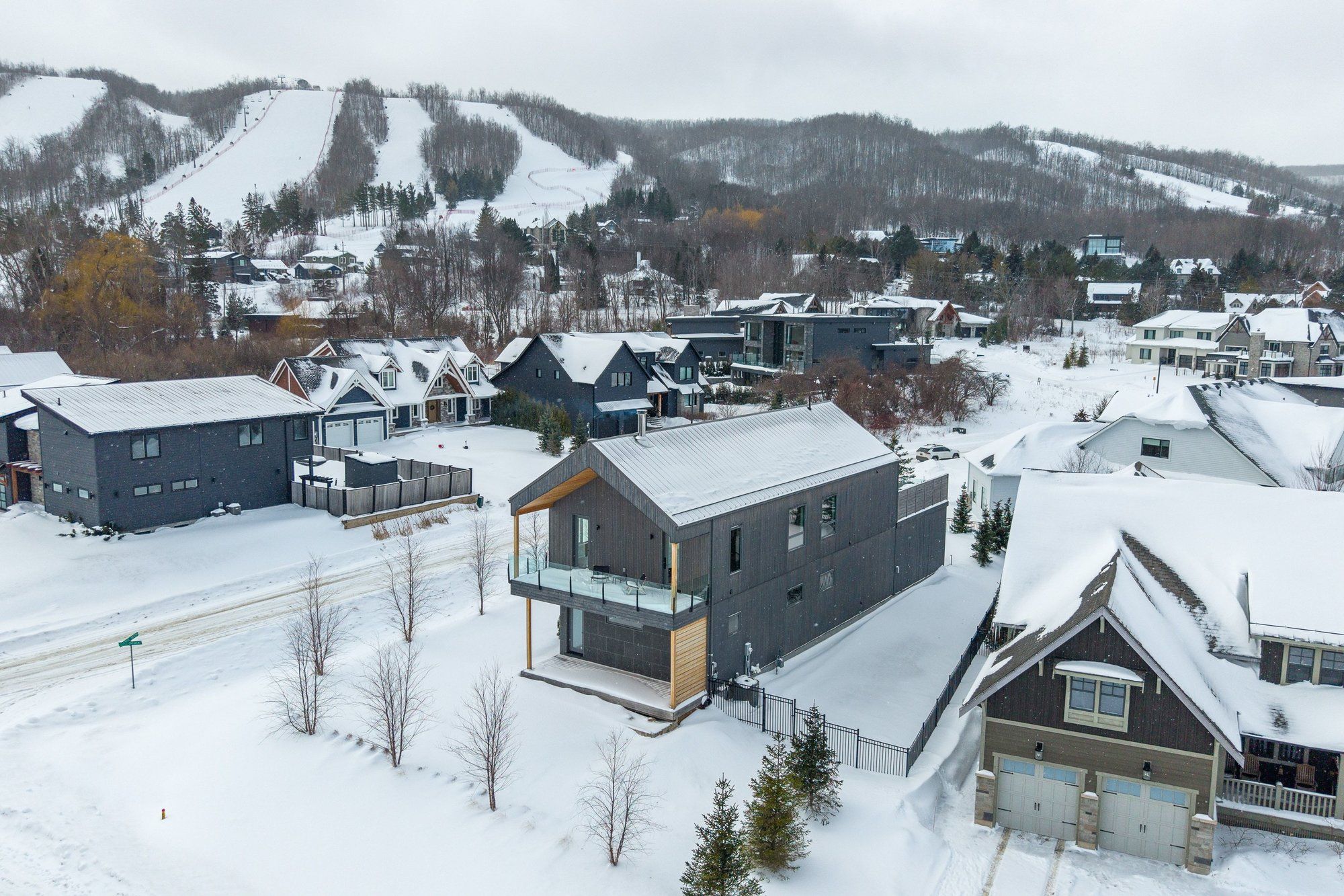 A striking contemporary ski chalet set in the heart of nipissing ridge, offering stunning, unobstructed views of the ski hills and georgian bay from the great room and multiple decks. Designed and built by higher ground building corp., this thoughtfully crafted 5-bedroom, 4-bath custom home is made for après-ski gatherings and relaxed mountain living, seamlessly blending modern architecture with classic chalet warmth. The open-concept upper level is designed for entertaining, featuring a showpiece custom kitchen with a dramatic 10-ft quartz island, walk-in pantry ,wet bar, and walk-out to a generous 23' x 23' deck. The great room is anchored by a stÛv wood-burning fireplace and soaring cathedral ceilings clad in vertical ontario white cedar. Two walk-outs lead to a covered deck and hot tub-perfect for soaking in the hill views by day and the glow of the slopes by night. The main-floor primary suite offers wall-to-wall closet space and a spa-inspired 5-piece ensuite, alongside main-floor laundry and two additional bedrooms, all with heated floors for year-round comfort. The fully finished lower level features polished, radiant in-floor heated concrete throughout, a spacious family and media room ideal for post-ski movie nights, and two additional bedrooms-perfect for family and guests. Located just minutes from craigleith and alpine ski clubs, northwinds beach, blue mountain village, dining, and shopping, this is a rare opportunity to enjoy a true four-season chalet lifestyle in one of the area's most sought-after neighborhoods.