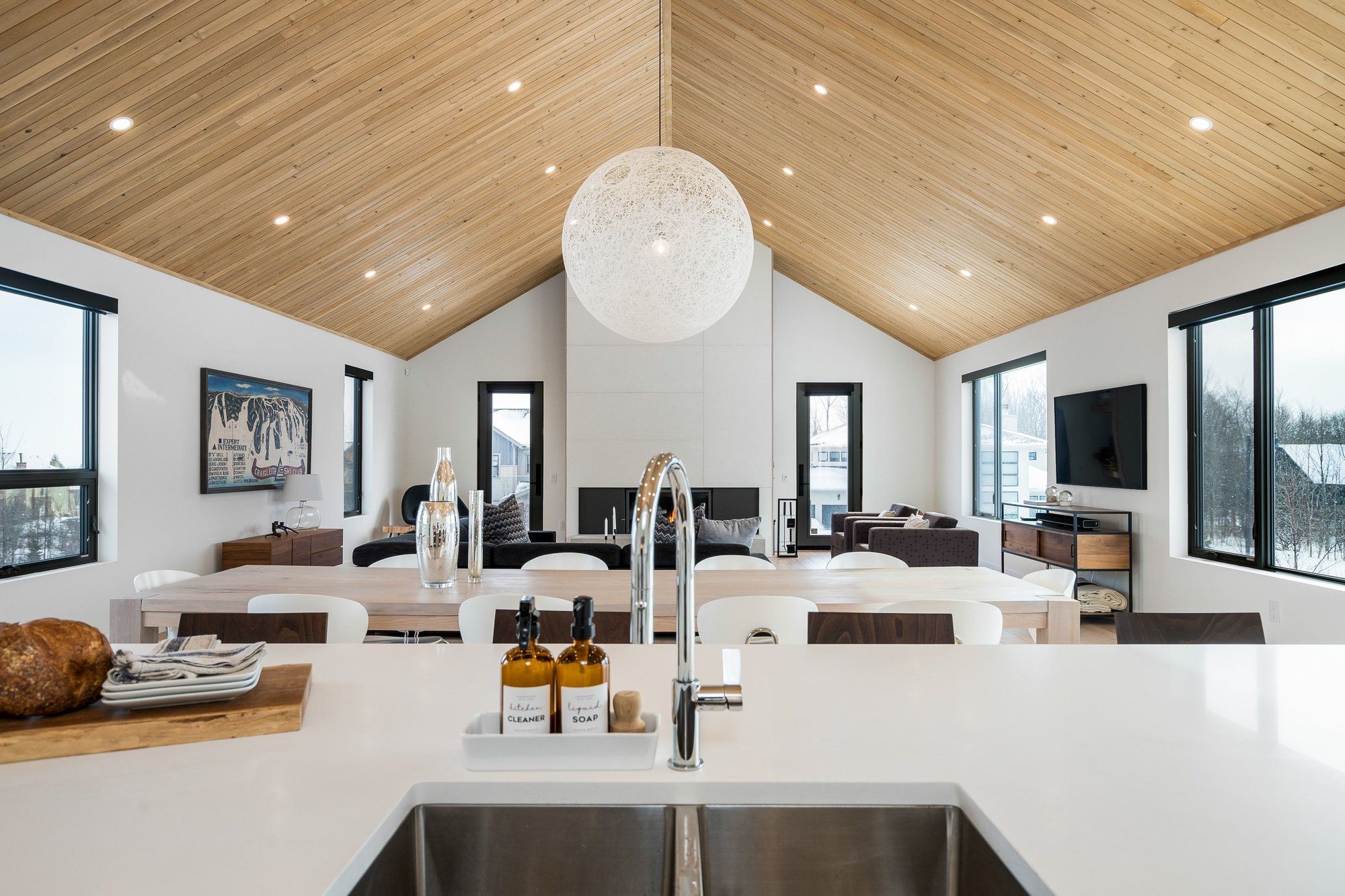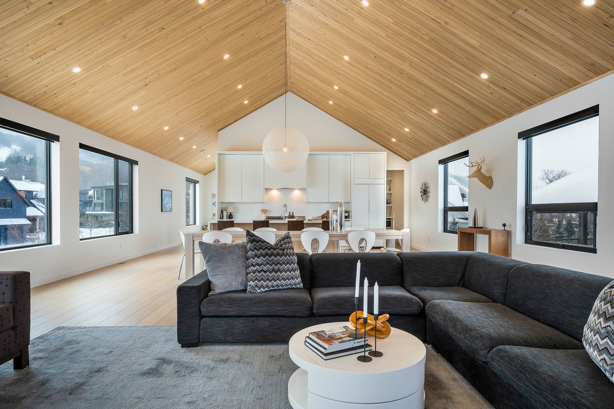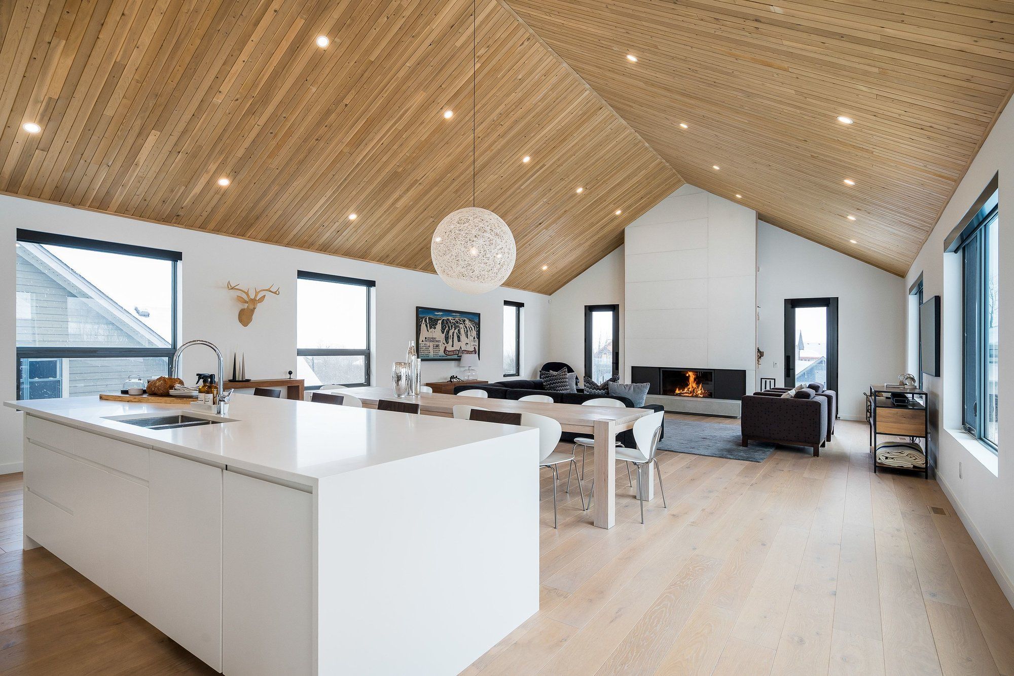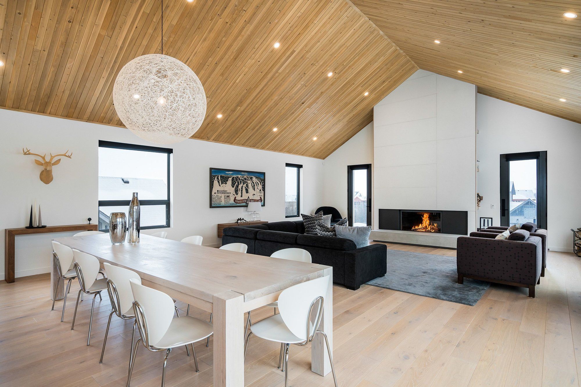 A striking contemporary ski chalet set in the heart of nipissing ridge, offering stunning, unobstructed views of the ski hills and georgian bay from the great room and multiple decks. Designed and built by higher ground building corp., this thoughtfully crafted 5-bedroom, 4-bath custom home is made for après-ski gatherings and relaxed mountain living, seamlessly blending modern architecture with classic chalet warmth. The open-concept upper level is designed for entertaining, featuring a showpiece custom kitchen with a dramatic 10-ft quartz island, walk-in pantry ,wet bar, and walk-out to a generous 23' x 23' deck. The great room is anchored by a stÛv wood-burning fireplace and soaring cathedral ceilings clad in vertical ontario white cedar. Two walk-outs lead to a covered deck and hot tub-perfect for soaking in the hill views by day and the glow of the slopes by night. The main-floor primary suite offers wall-to-wall closet space and a spa-inspired 5-piece ensuite, alongside main-floor laundry and two additional bedrooms, all with heated floors for year-round comfort. The fully finished lower level features polished, radiant in-floor heated concrete throughout, a spacious family and media room ideal for post-ski movie nights, and two additional bedrooms-perfect for family and guests. Located just minutes from craigleith and alpine ski clubs, northwinds beach, blue mountain village, dining, and shopping, this is a rare opportunity to enjoy a true four-season chalet lifestyle in one of the area's most sought-after neighborhoods.