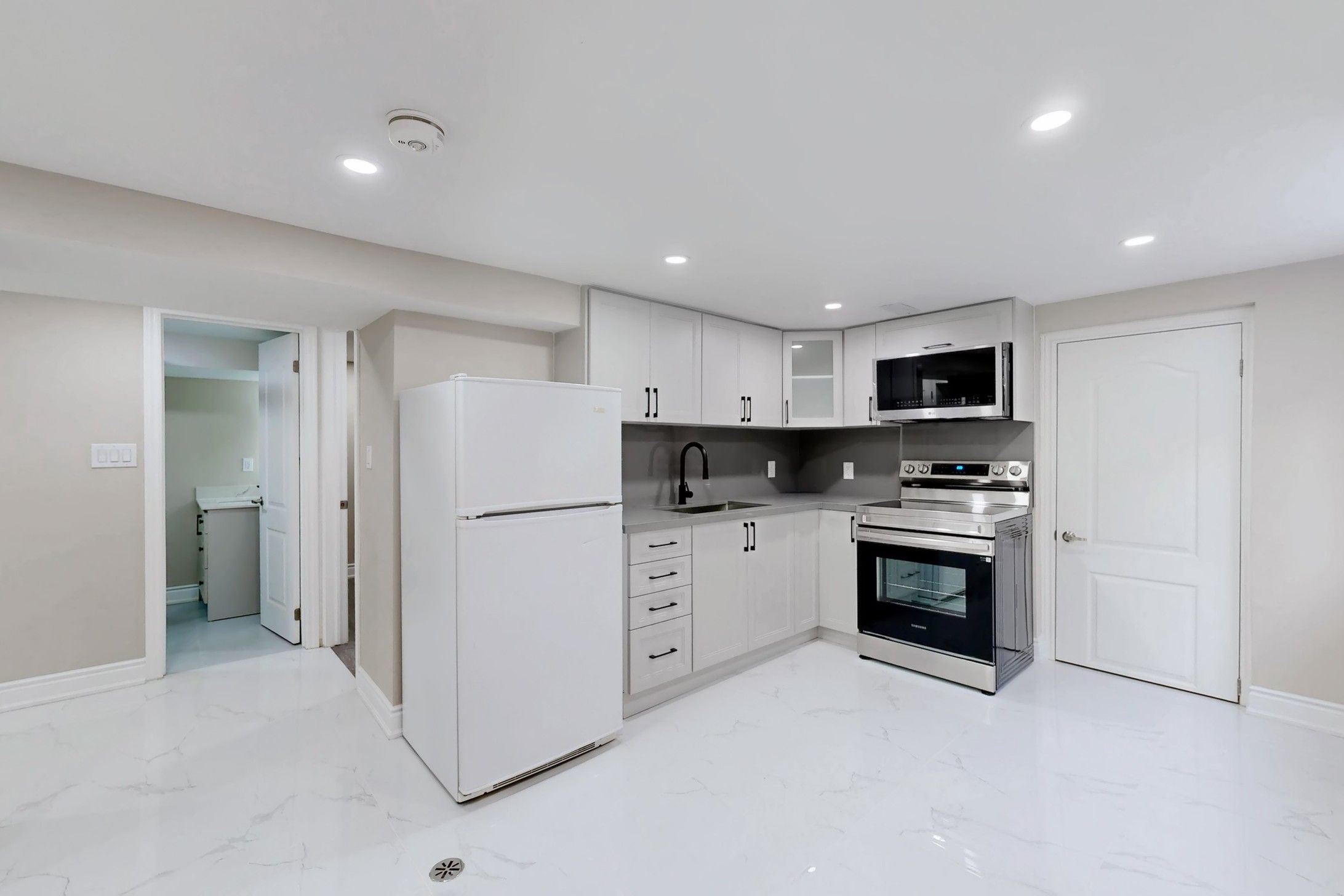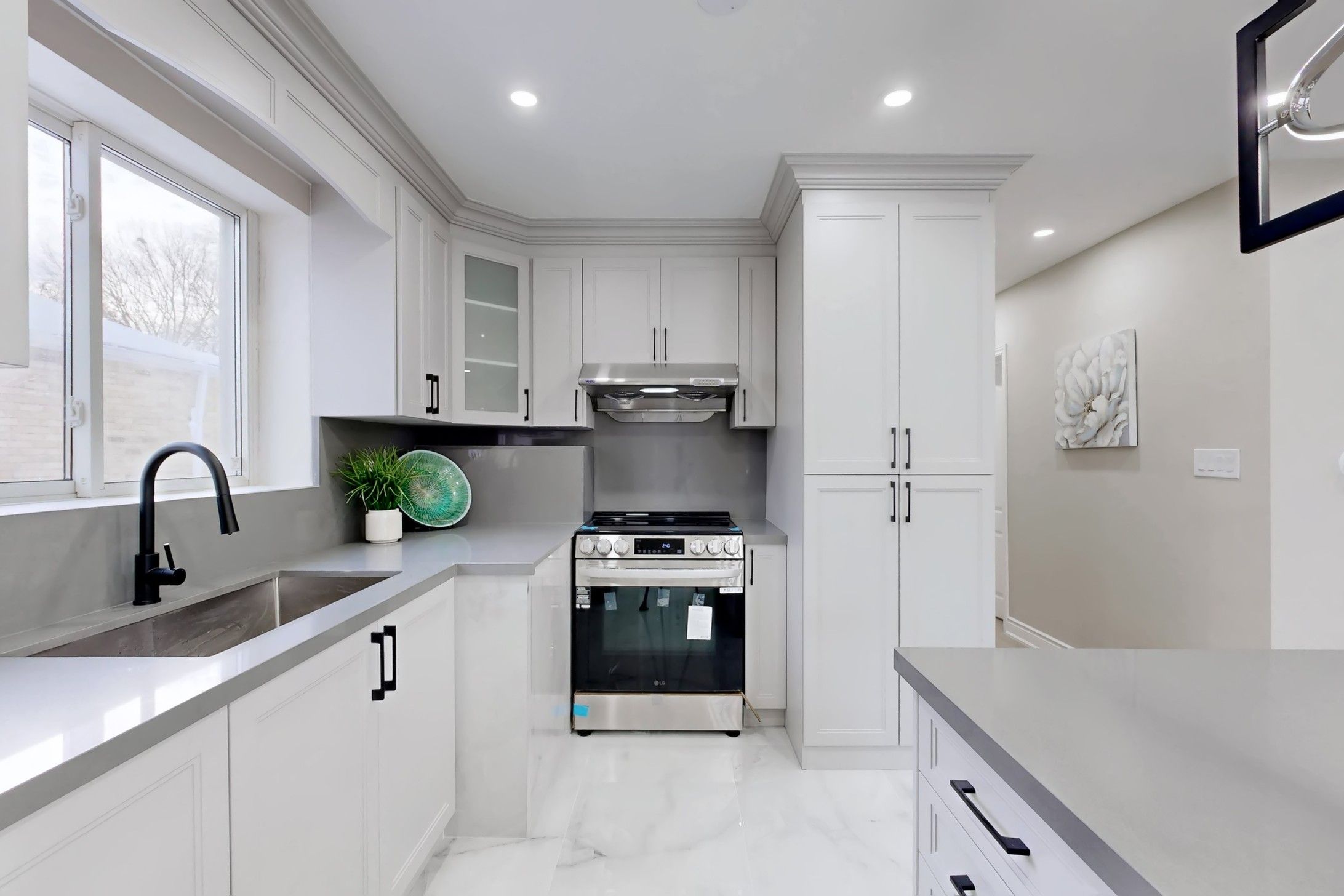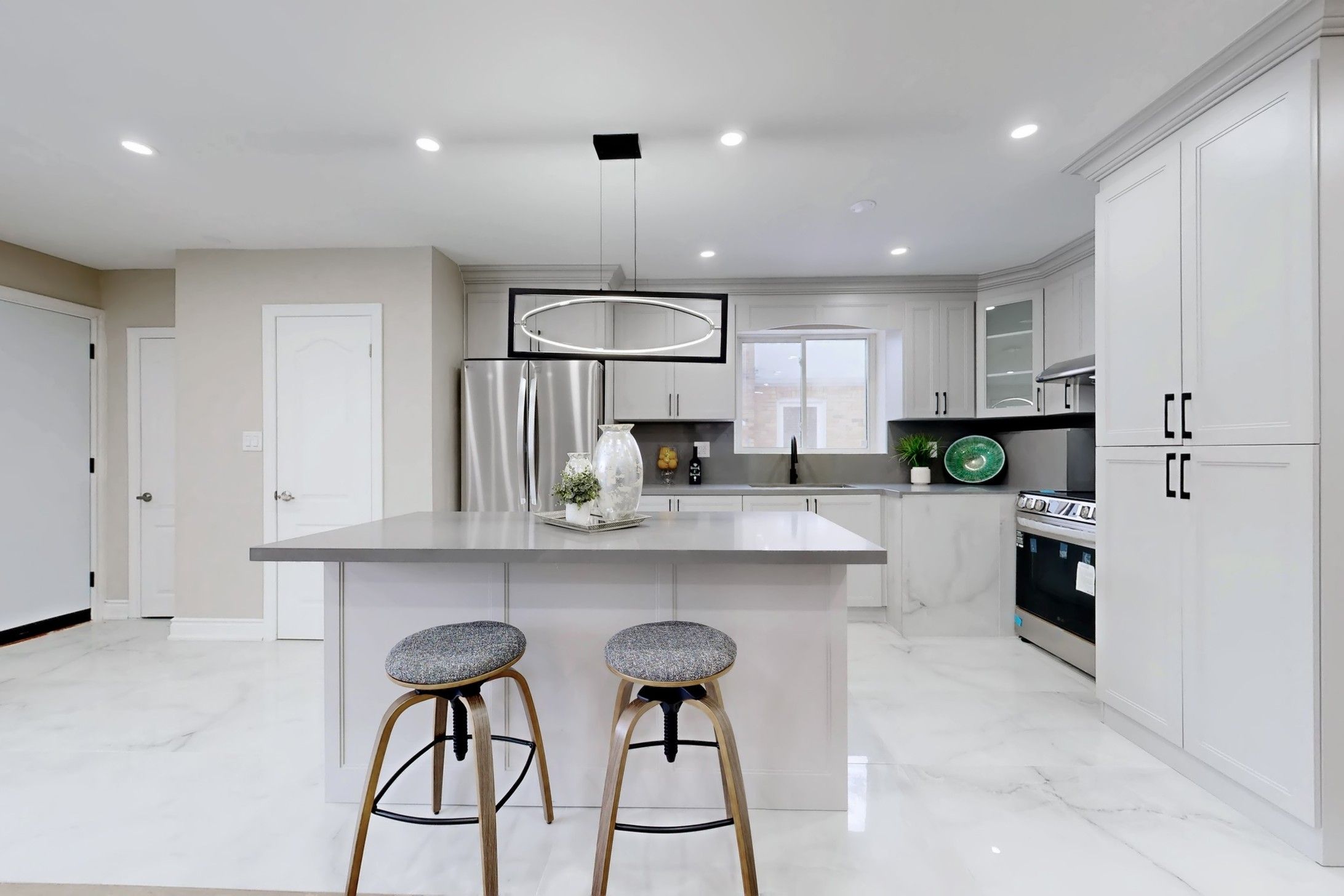 • Modern kitchen with quartz countertops and spacious living areas.