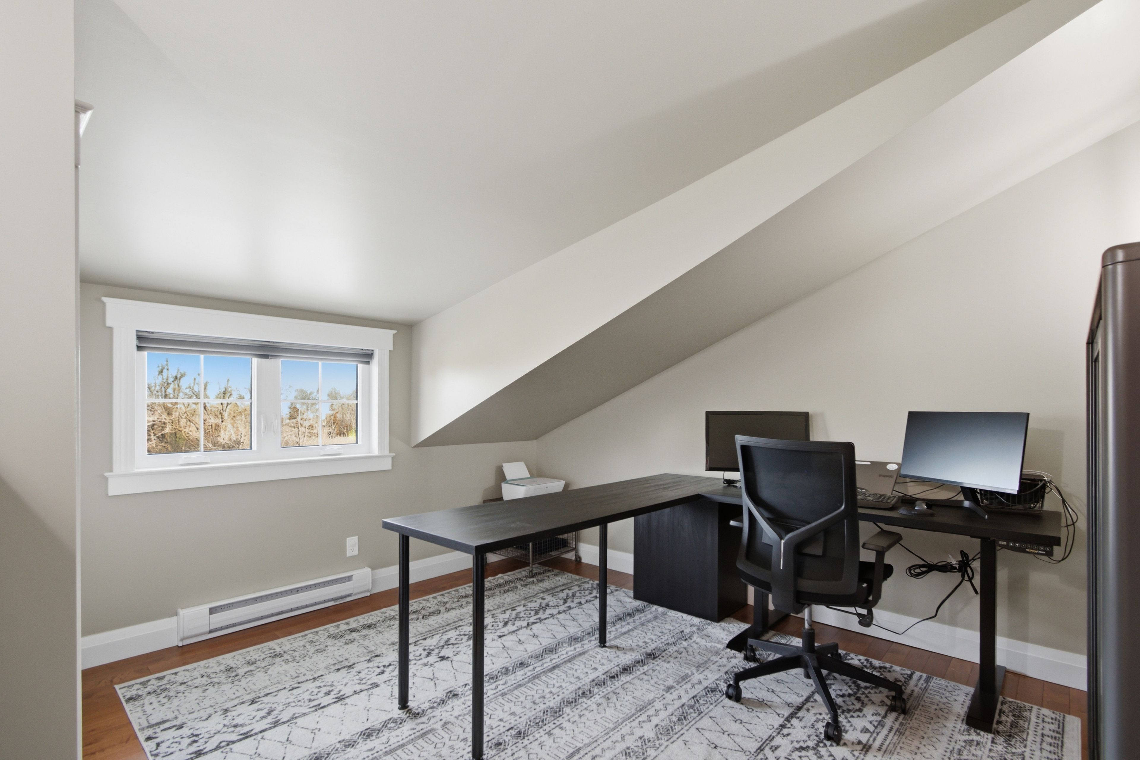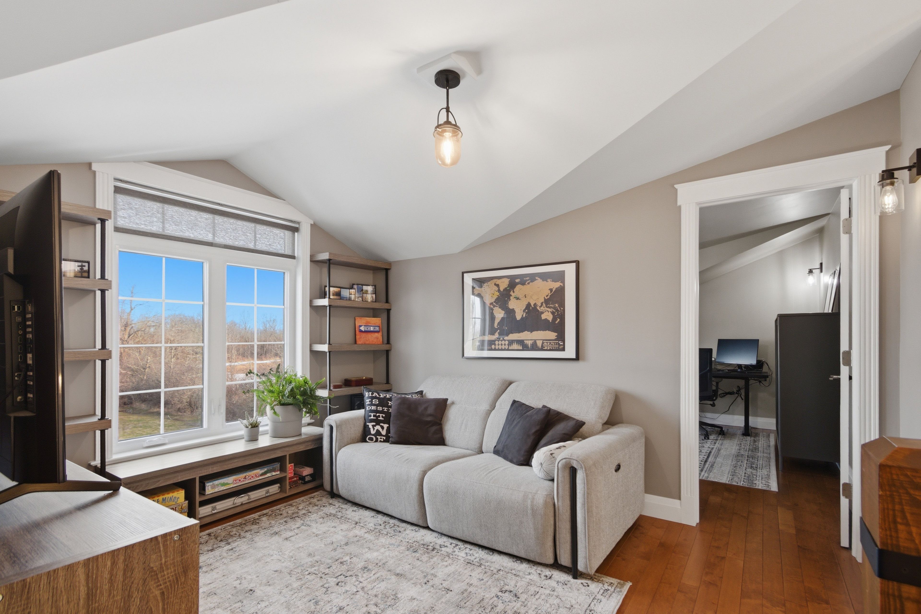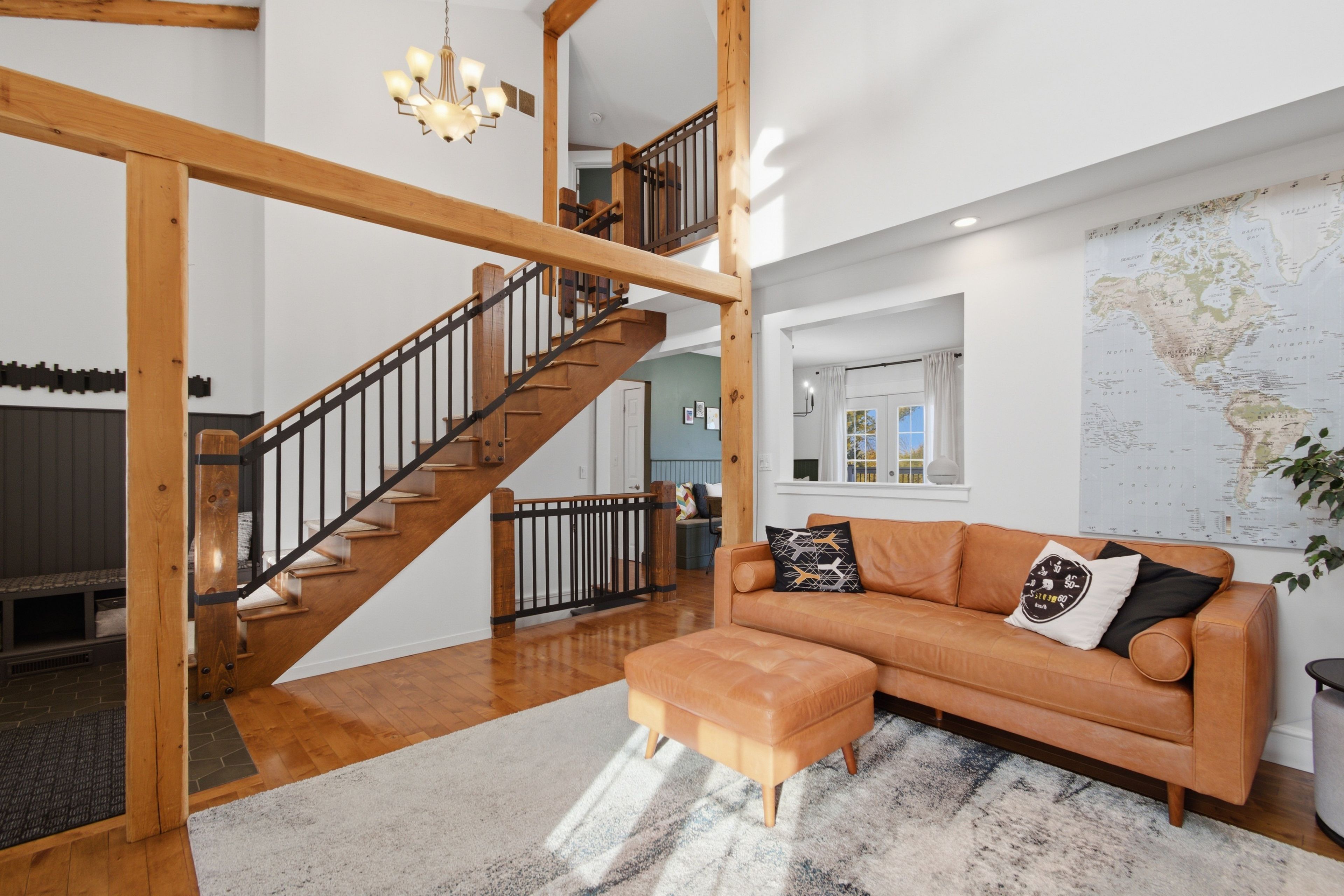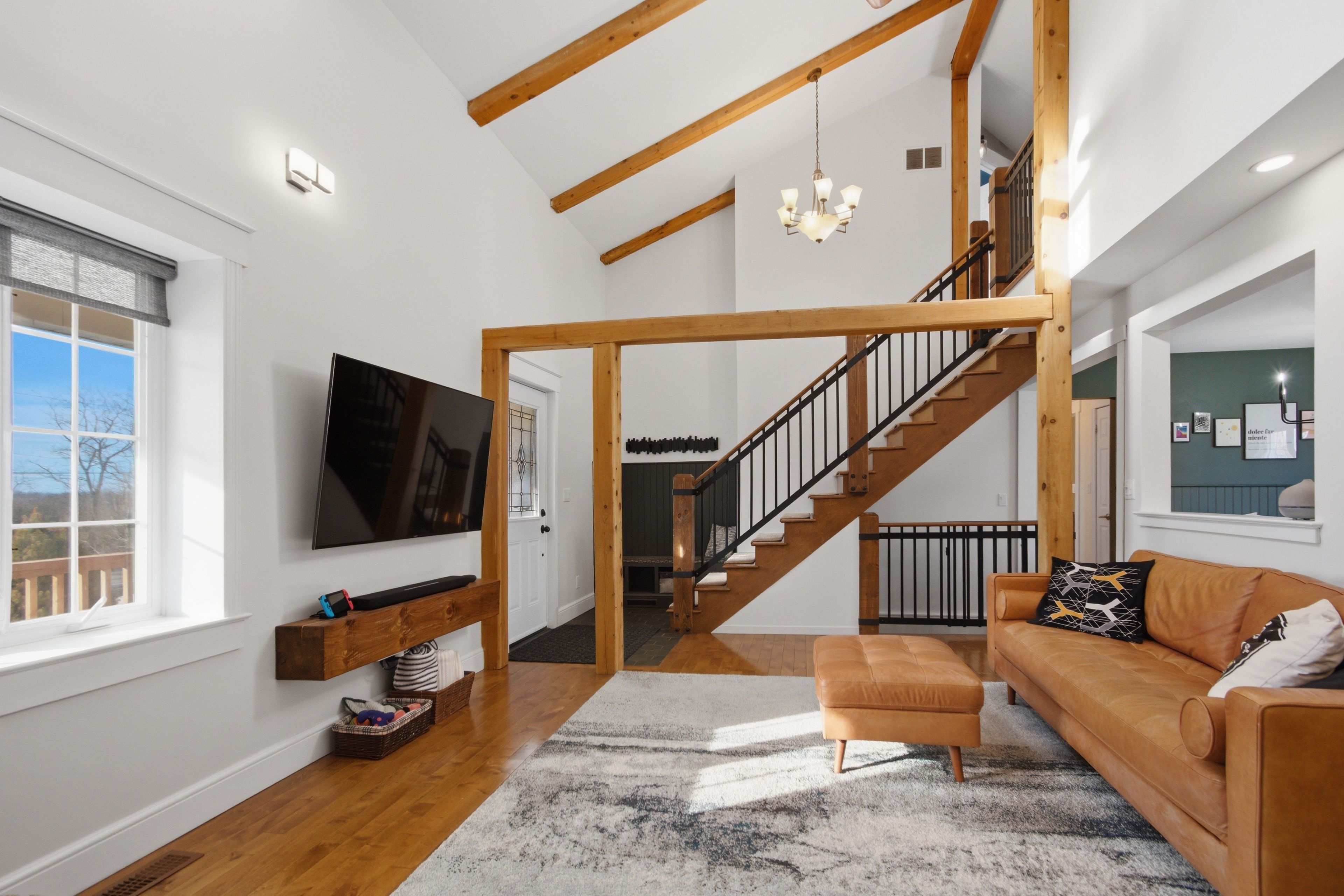 • Living room boasts vaulted ceilings and a cozy fireplace.