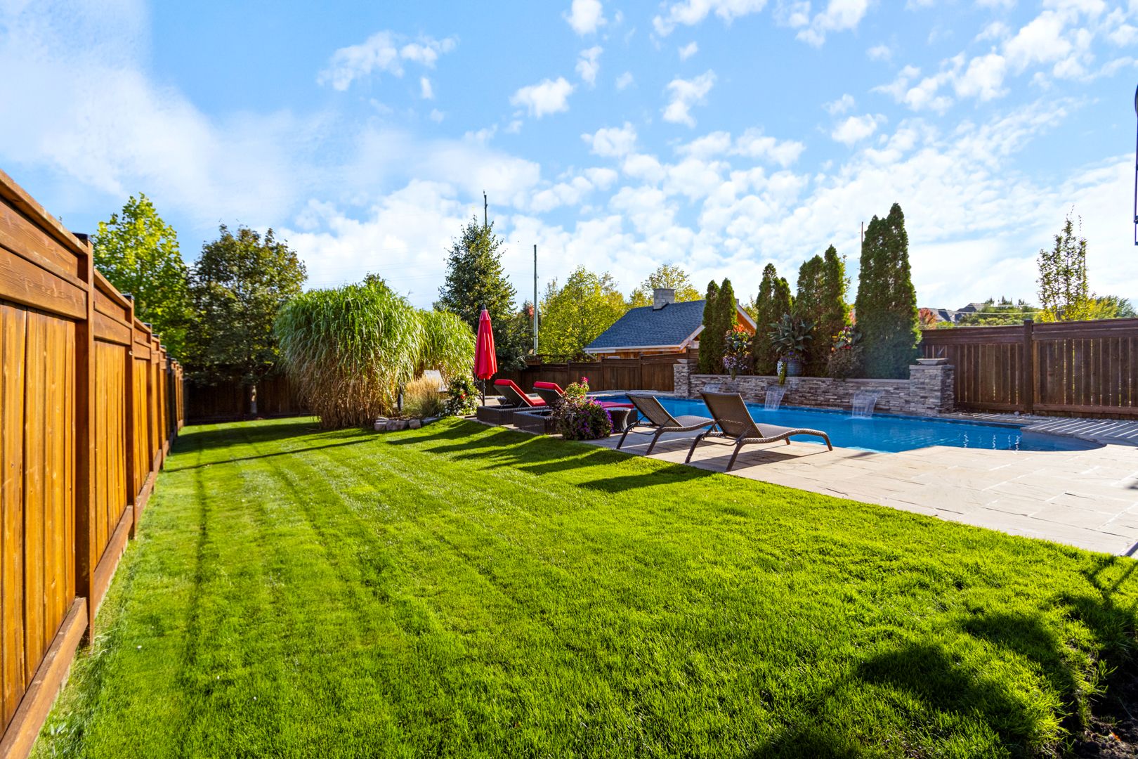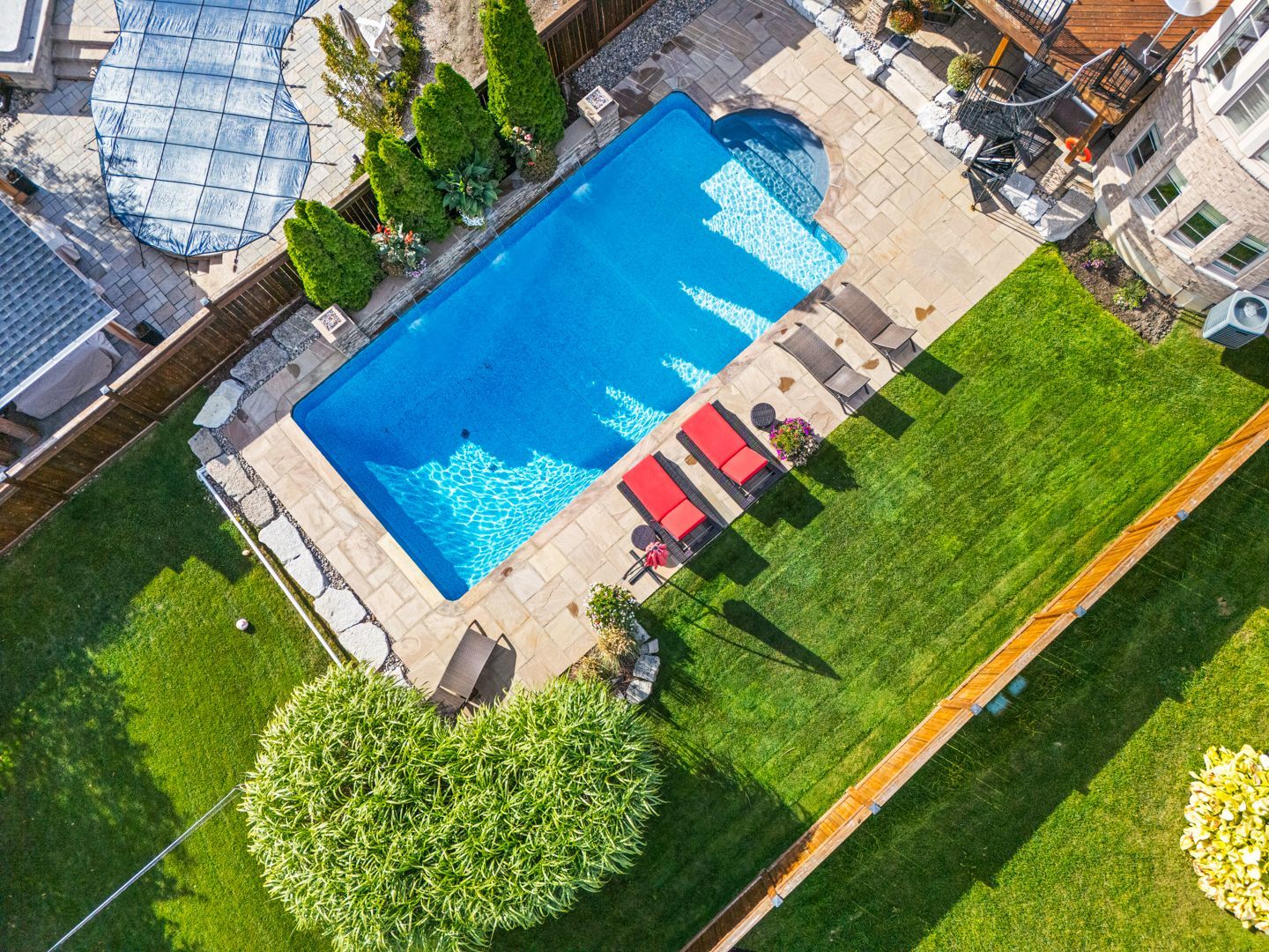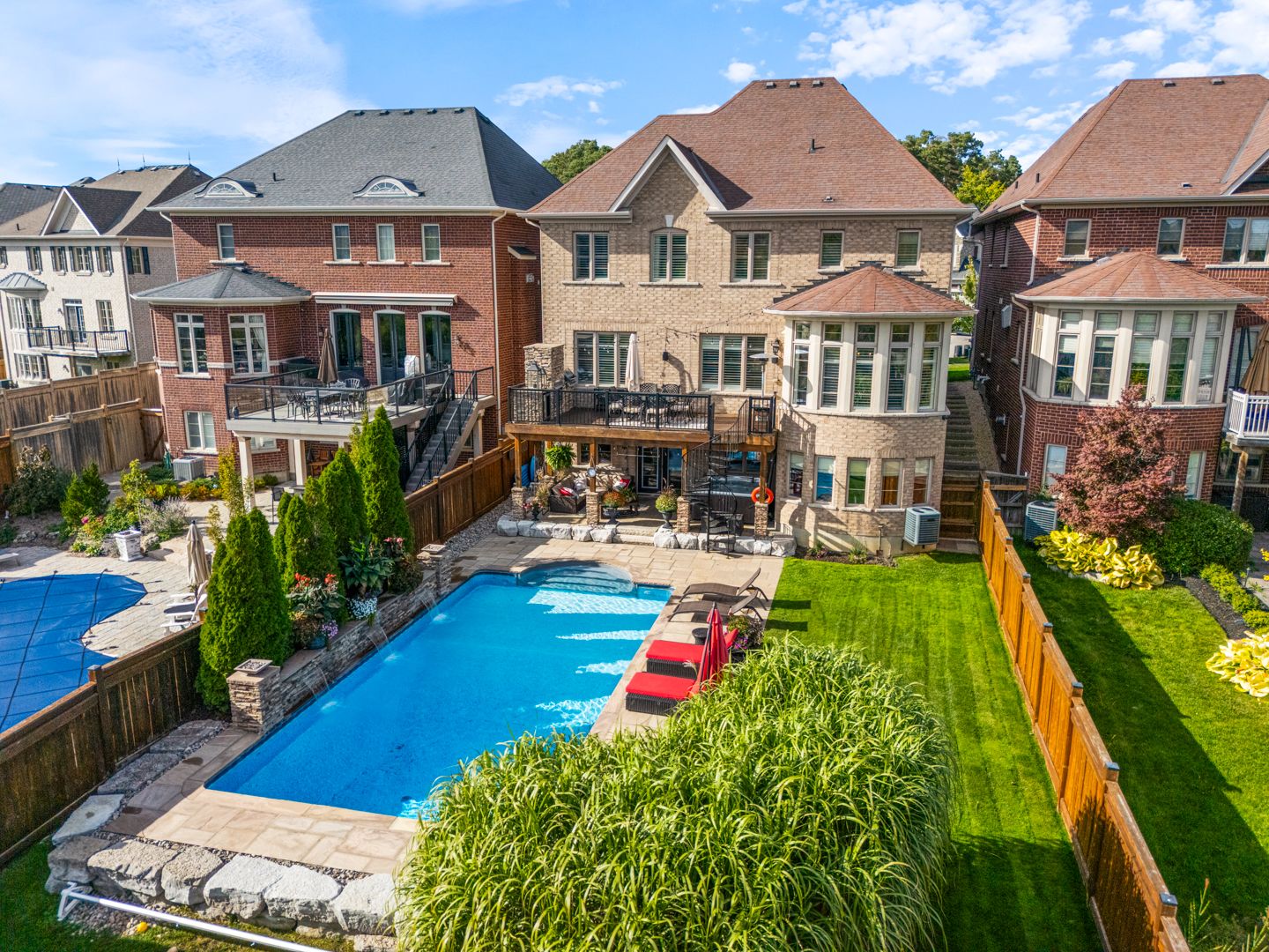 Resort-style living in south aurora's prestigious grand chateaus. Built by genview homes, this exclusive and highly sought-after community is known for its quality-built homes, elegant streetscape, and proximity to top private schools. This exceptional residence is designed for those who value craftsmanship, comfort, and refined living. Set on a premium south-facing lot, the home offers abundant natural light and a beautifully landscaped backyard featuring a saltwater in-ground pool, natural flagstone, fire features, and multiple seating areas, creating a peaceful and private outdoor environment. The main level offers a spacious and well-balanced layout with formal living and dining rooms, leading to an open-concept kitchen and large dining area overlooking the backyard. The family room features custom built-ins and a fireplace, creating a warm and inviting gathering space. A custom-designed deck extends the living space outdoors, complete with a built-in bbq, stone fireplace wall, and dedicated dining area- perfect for hosting and everyday enjoyment. Upstairs offers a luxurious primary suite with spa-inspired ensuite, a custom home office with built-in cabinetry, and 2 additional bedrooms. The fully finished walkout basement provides excellent additional living space, including a family room with fireplace, bar, games area, fitness space, bedroom, and bath. Direct access leads to a covered outdoor lounge with hot tub and easy access to the backyard and pool, well-suited for extended family or guests. Additional features include a rare tandem three-car garage, 8-foot solid core doors throughout, interlock driveway and landscaped walkway, integrated security and speaker systems, and meticulous upkeep throughout. Located minutes from st. Andrew's college, st. Anne's school, magna golf club, parks, and premium amenities. A refined home offering comfort, quality, and an exceptional lifestyle in one of aurora's most desirable communities.
