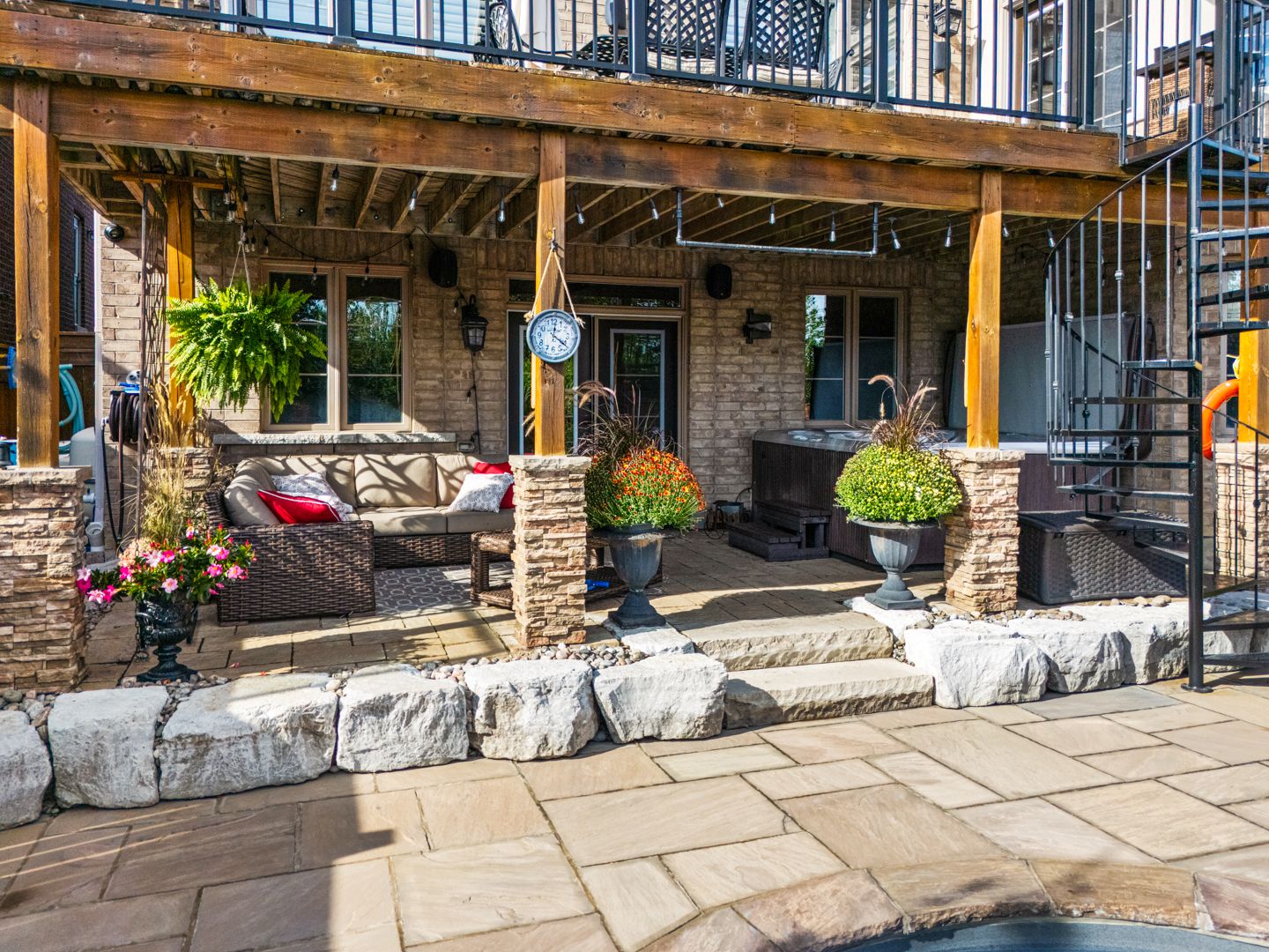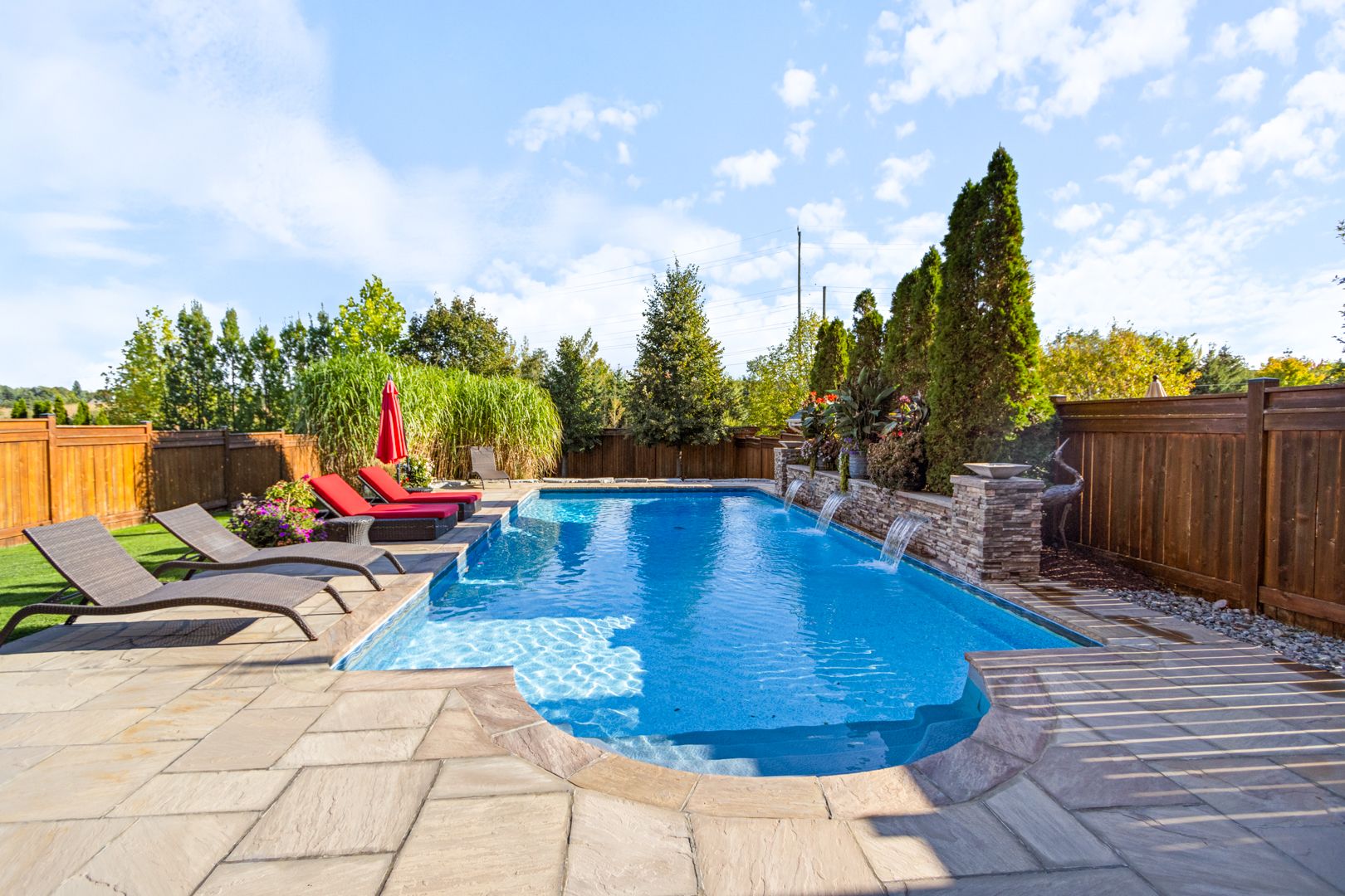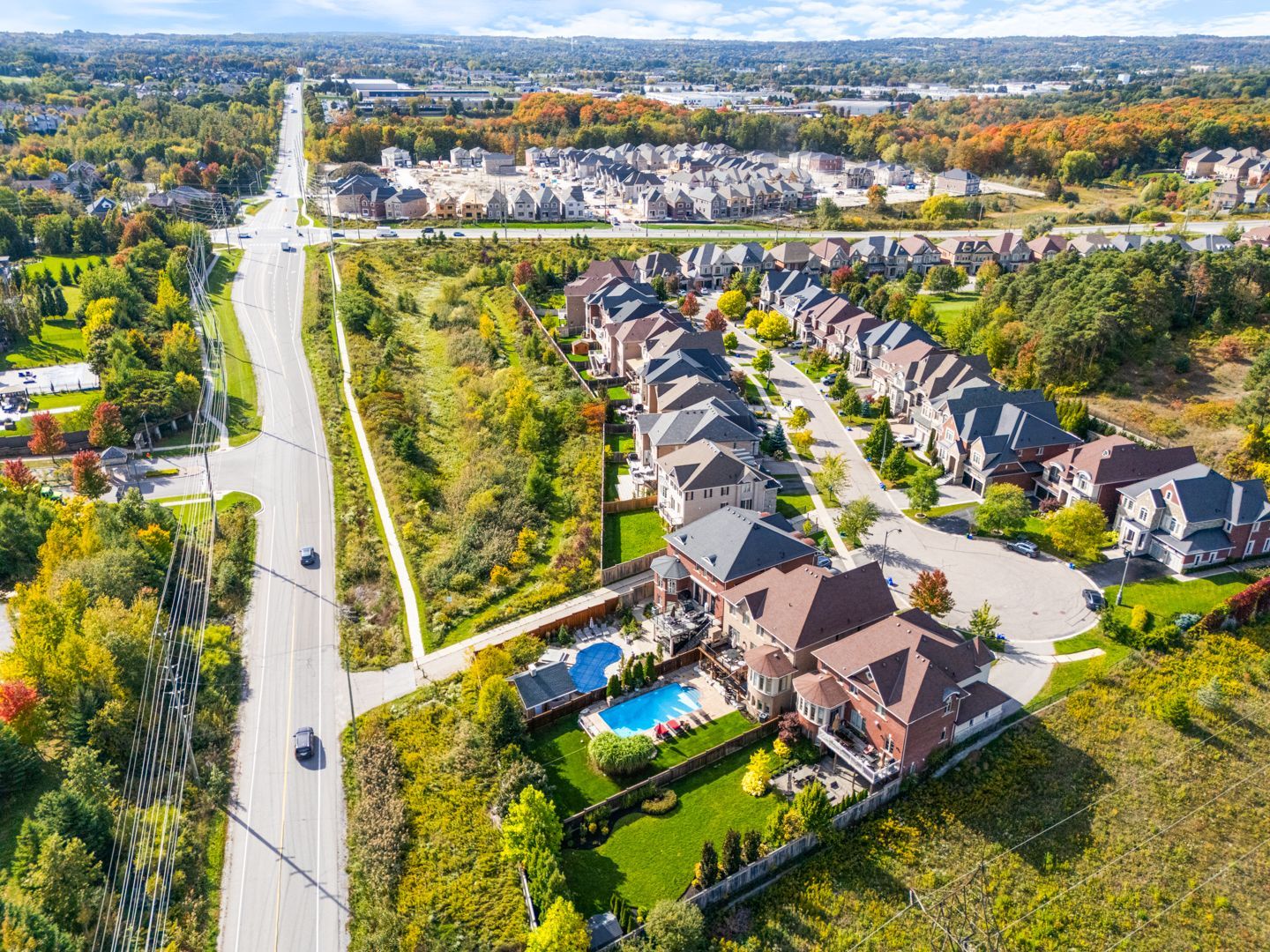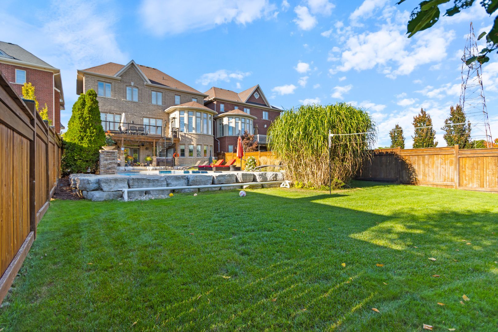 Resort-style living in south aurora's prestigious grand chateaus. Built by genview homes, this exclusive and highly sought-after community is known for its quality-built homes, elegant streetscape, and proximity to top private schools. This exceptional residence is designed for those who value craftsmanship, comfort, and refined living. Set on a premium south-facing lot, the home offers abundant natural light and a beautifully landscaped backyard featuring a saltwater in-ground pool, natural flagstone, fire features, and multiple seating areas, creating a peaceful and private outdoor environment. The main level offers a spacious and well-balanced layout with formal living and dining rooms, leading to an open-concept kitchen and large dining area overlooking the backyard. The family room features custom built-ins and a fireplace, creating a warm and inviting gathering space. A custom-designed deck extends the living space outdoors, complete with a built-in bbq, stone fireplace wall, and dedicated dining area- perfect for hosting and everyday enjoyment. Upstairs offers a luxurious primary suite with spa-inspired ensuite, a custom home office with built-in cabinetry, and 2 additional bedrooms. The fully finished walkout basement provides excellent additional living space, including a family room with fireplace, bar, games area, fitness space, bedroom, and bath. Direct access leads to a covered outdoor lounge with hot tub and easy access to the backyard and pool, well-suited for extended family or guests. Additional features include a rare tandem three-car garage, 8-foot solid core doors throughout, interlock driveway and landscaped walkway, integrated security and speaker systems, and meticulous upkeep throughout. Located minutes from st. Andrew's college, st. Anne's school, magna golf club, parks, and premium amenities. A refined home offering comfort, quality, and an exceptional lifestyle in one of aurora's most desirable communities.