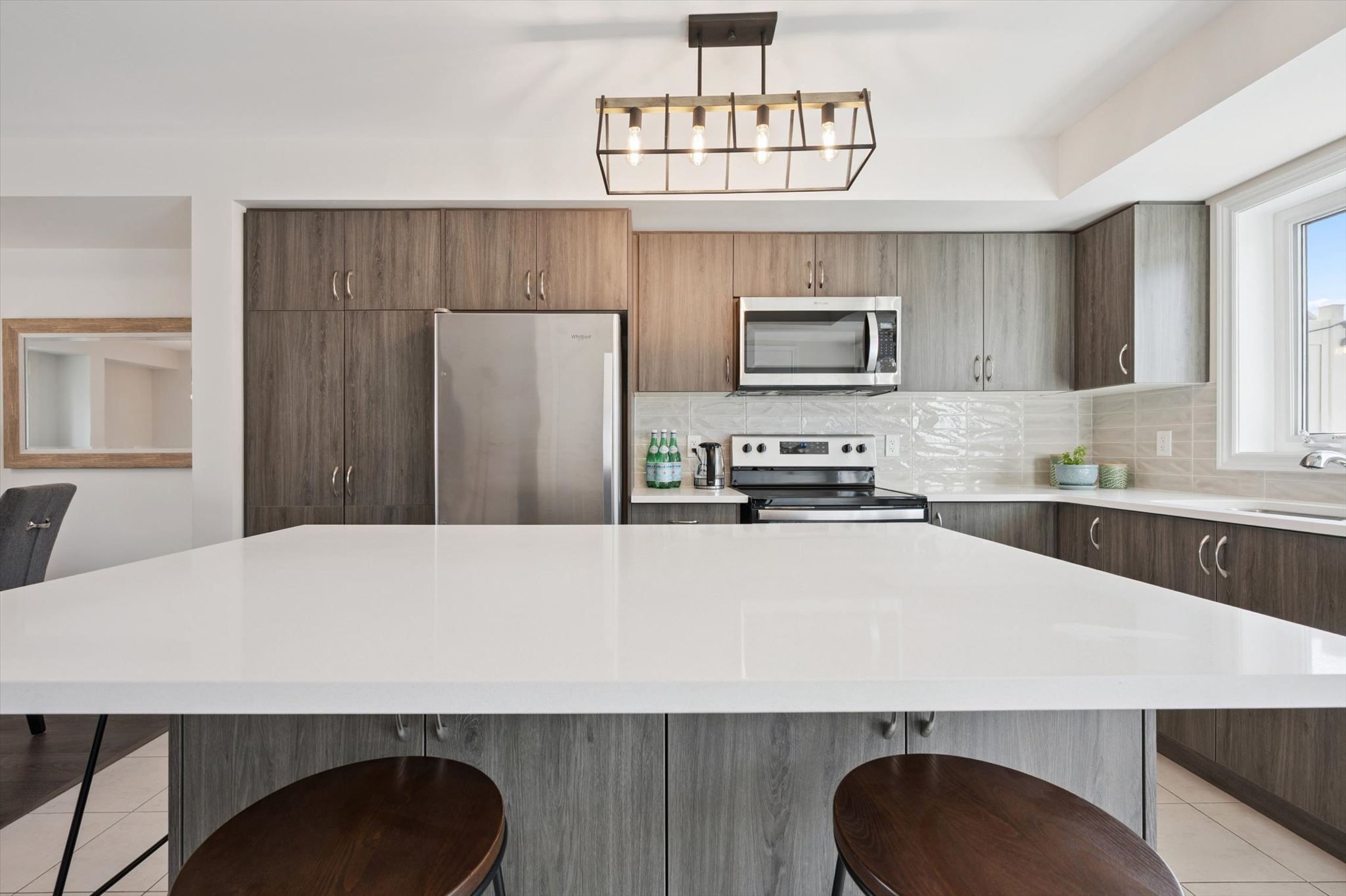 • Contemporary kitchen featuring quartz counters and a massive island for seating.