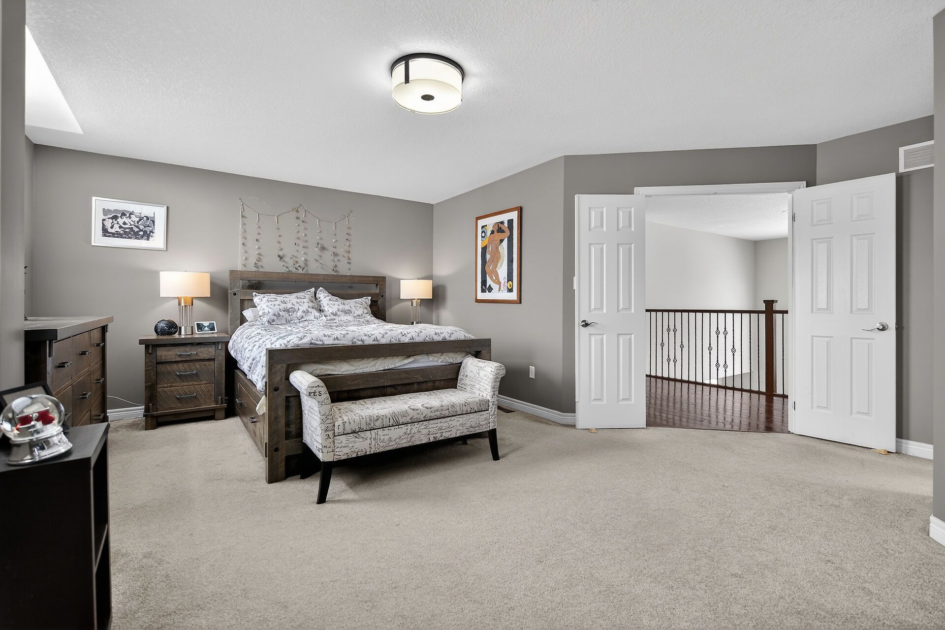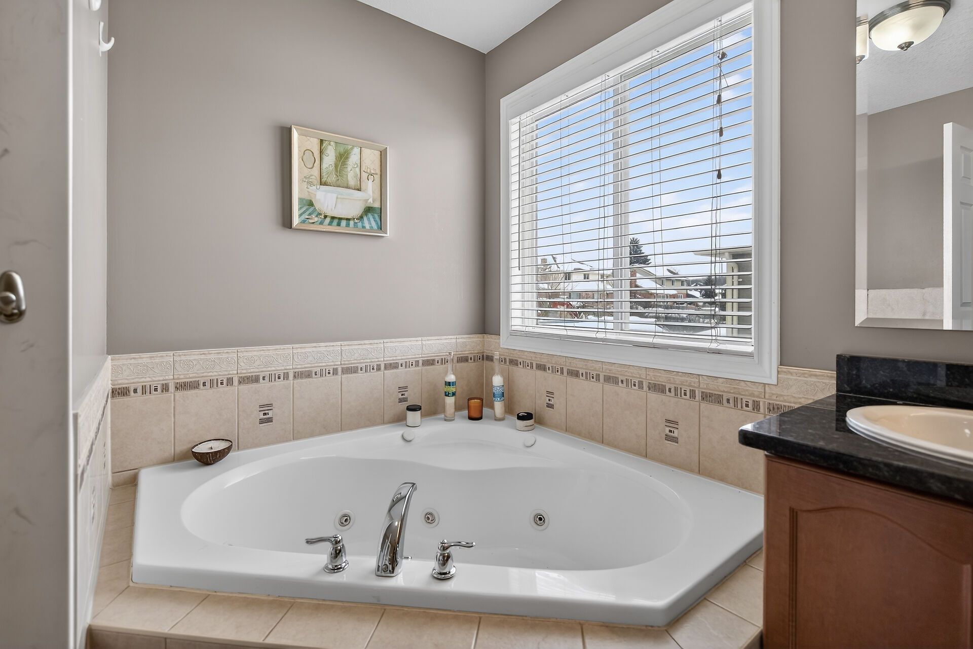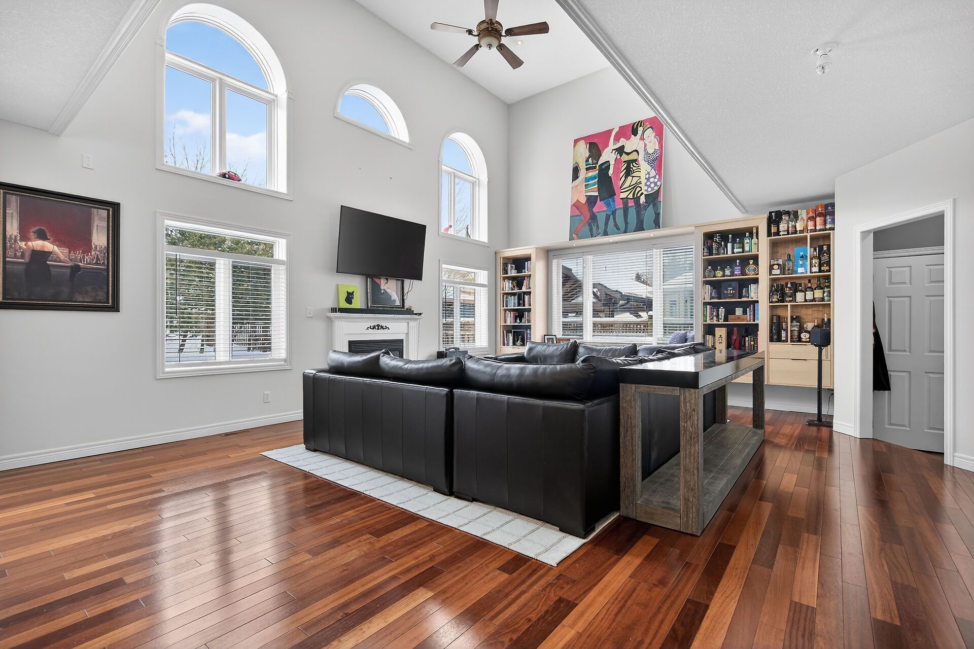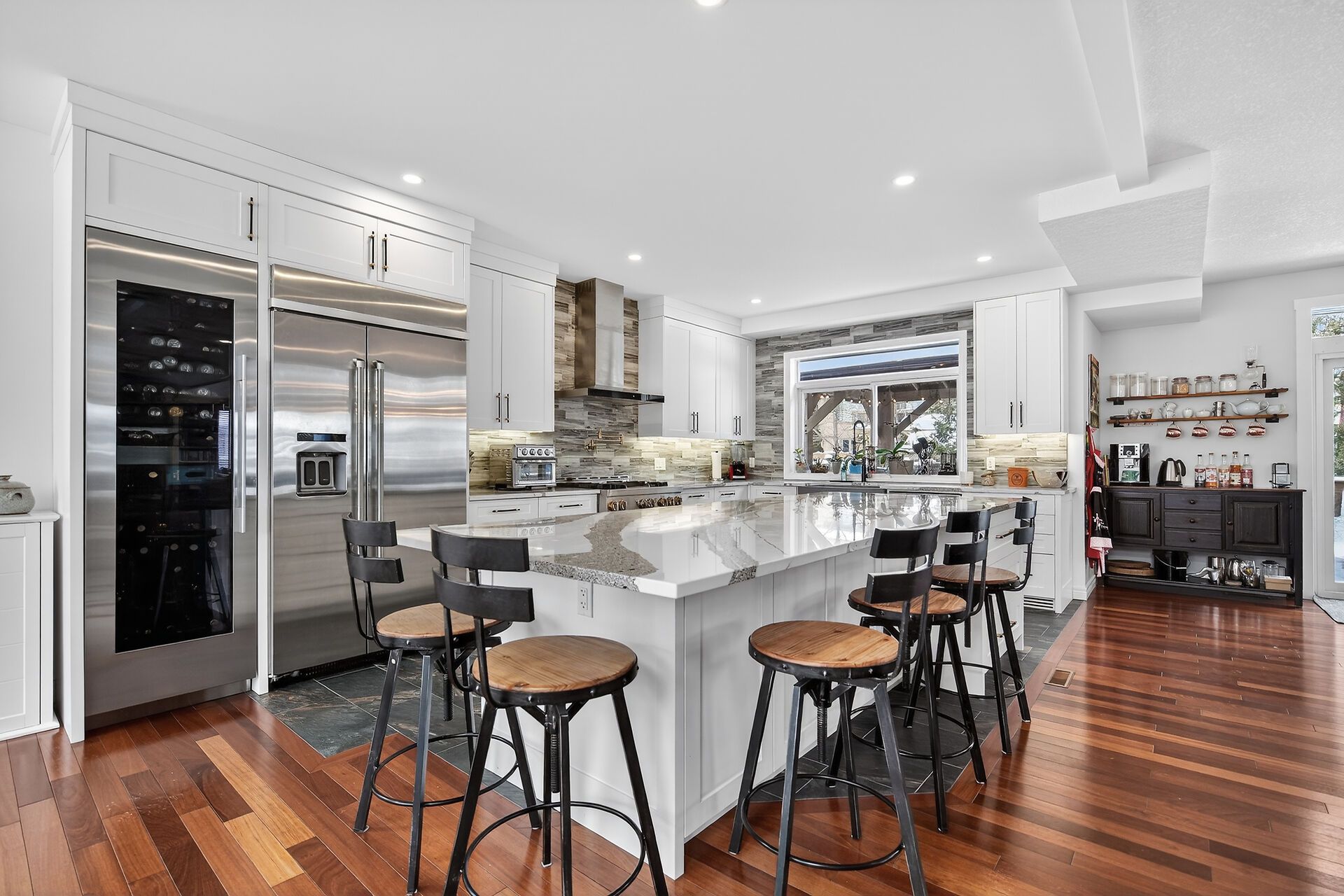 Beautifully updated and meticulously designed, this exceptional executive home offers the perfect balance of luxury finishes and everyday functionality. Outstanding curb appeal begins with a striking cut stone façade, complemented by elegant round-top and transom windows. Triple-car garage with automatic door openers adds convenience and practicality. Inside, soaring high ceilings throughout the main floor create a bright, open atmosphere, enhanced by dimmable pot lighting in the kitchen and front foyer. A dramatic juliette hallway overlooking the great room adds architectural elegance and a sense of grandeur to the living space. The showstopping 2021 chef's kitchen, completed with a $100,000 renovation, is designed for both entertaining and daily living. It features premium jenn air appliances, a dual-temperature wine fridge, gas range with pot filler, drawer microwave, quartz farmhouse sink, and a breathtaking cambria quartz island crafted from a single slab. Thoughtful custom storage includes deep double drawers, slide-out corner cabinetry, and built-in utensil organizers. A unique pass-through window opens directly to the patio, creating seamless indoor-outdoor flow. The backyard is a private entertainer's retreat, highlighted by a 16' x 12' cedar gazebo (2024) with café lighting, built-in buffet shelf, roll-down privacy blind, fire pit with wood storage, and a bullfrog hot tub featuring interchangeable seating and adjustable jets. Additional custom touches include a hutton bielmann sycamore built-in bookshelf and bar with integrated led lighting in the living room, and a beautifully designed custom closet in the primary suite complete with sensor lighting and specialty racks. Further highlights include a 240v ev charger (2021). Extensive custom craftsmanship throughout.