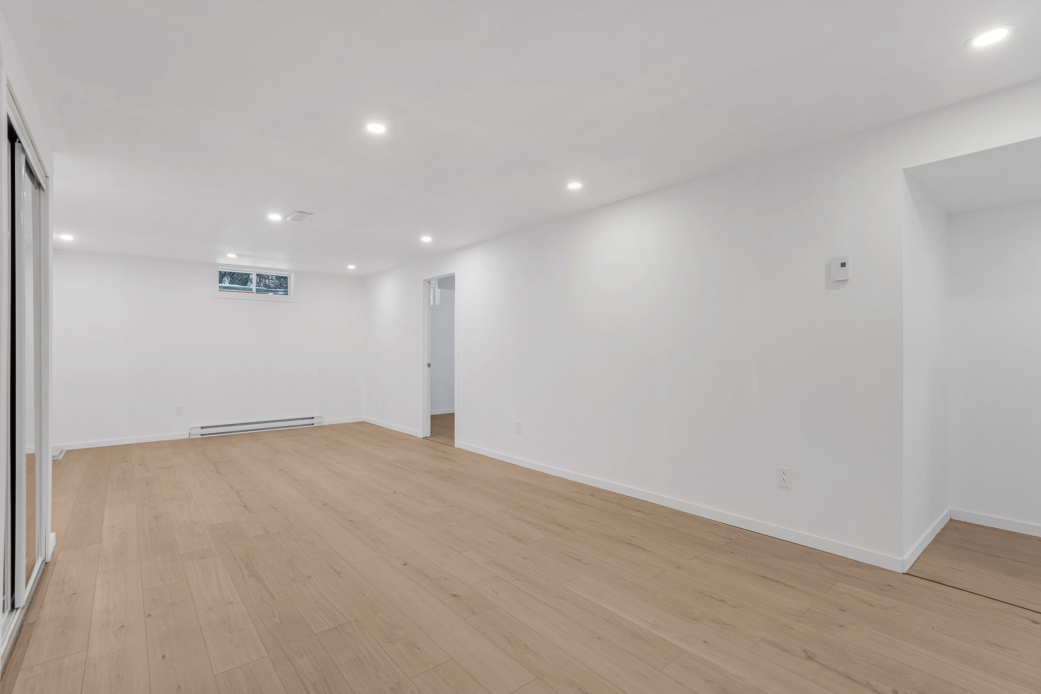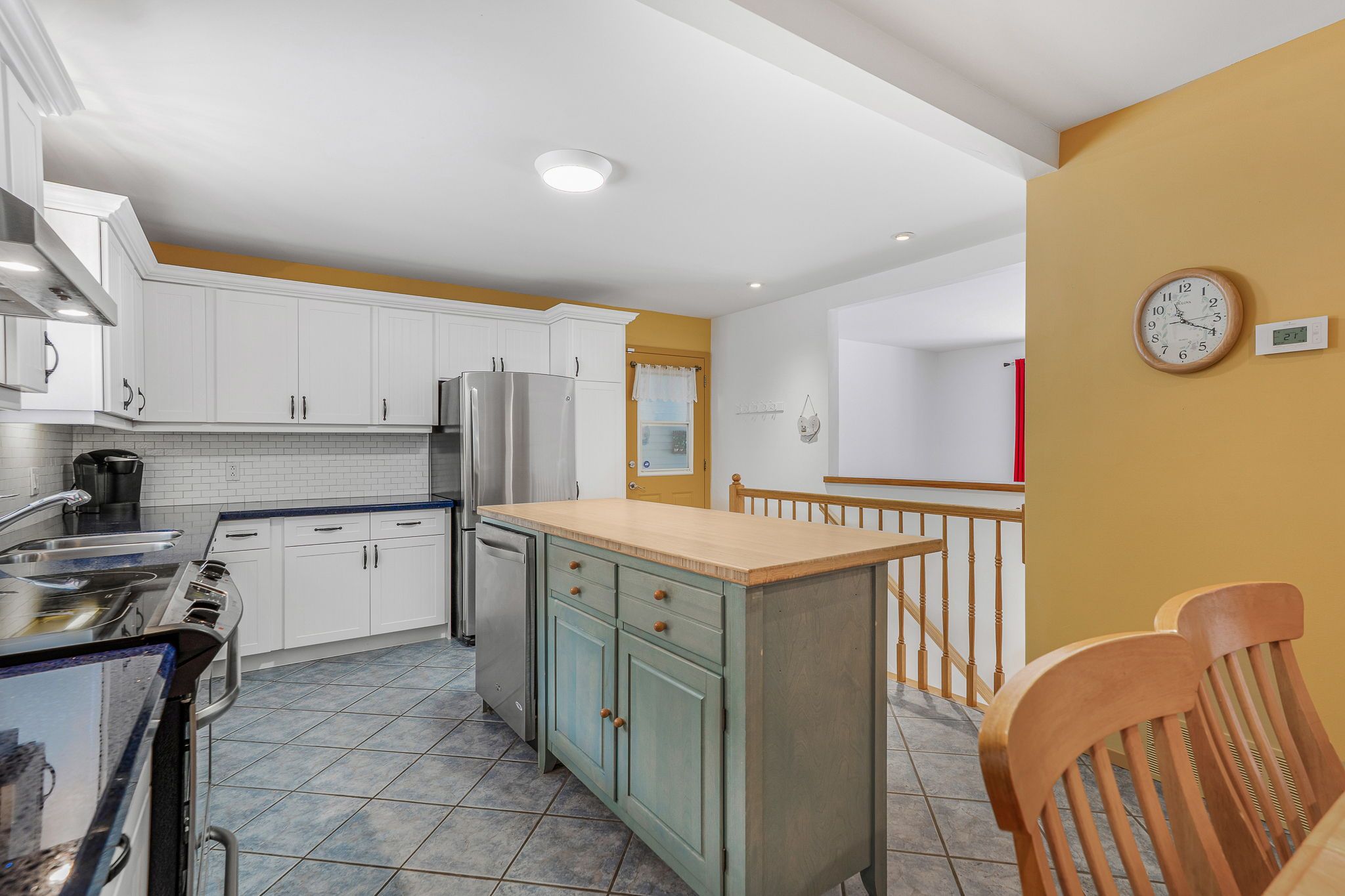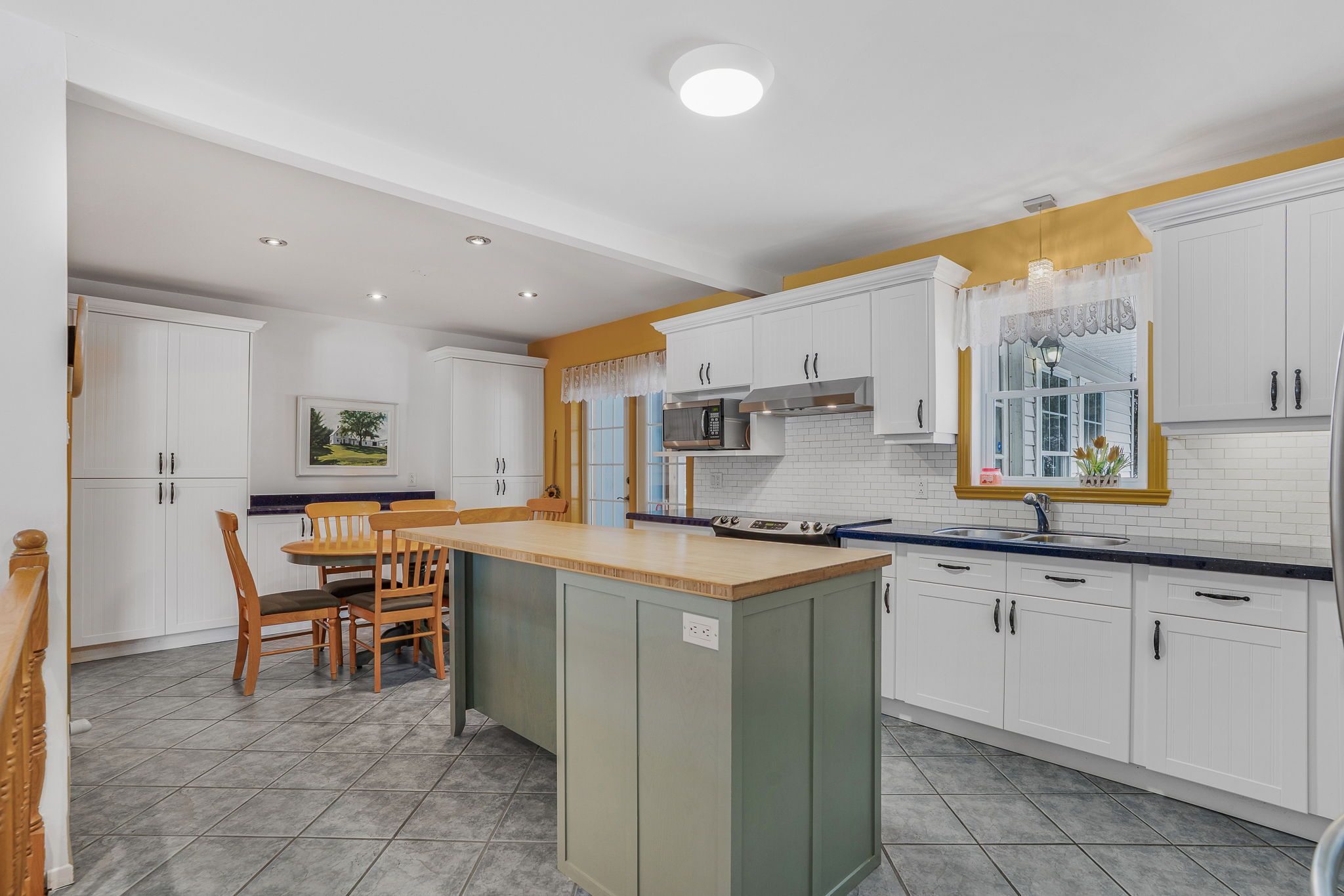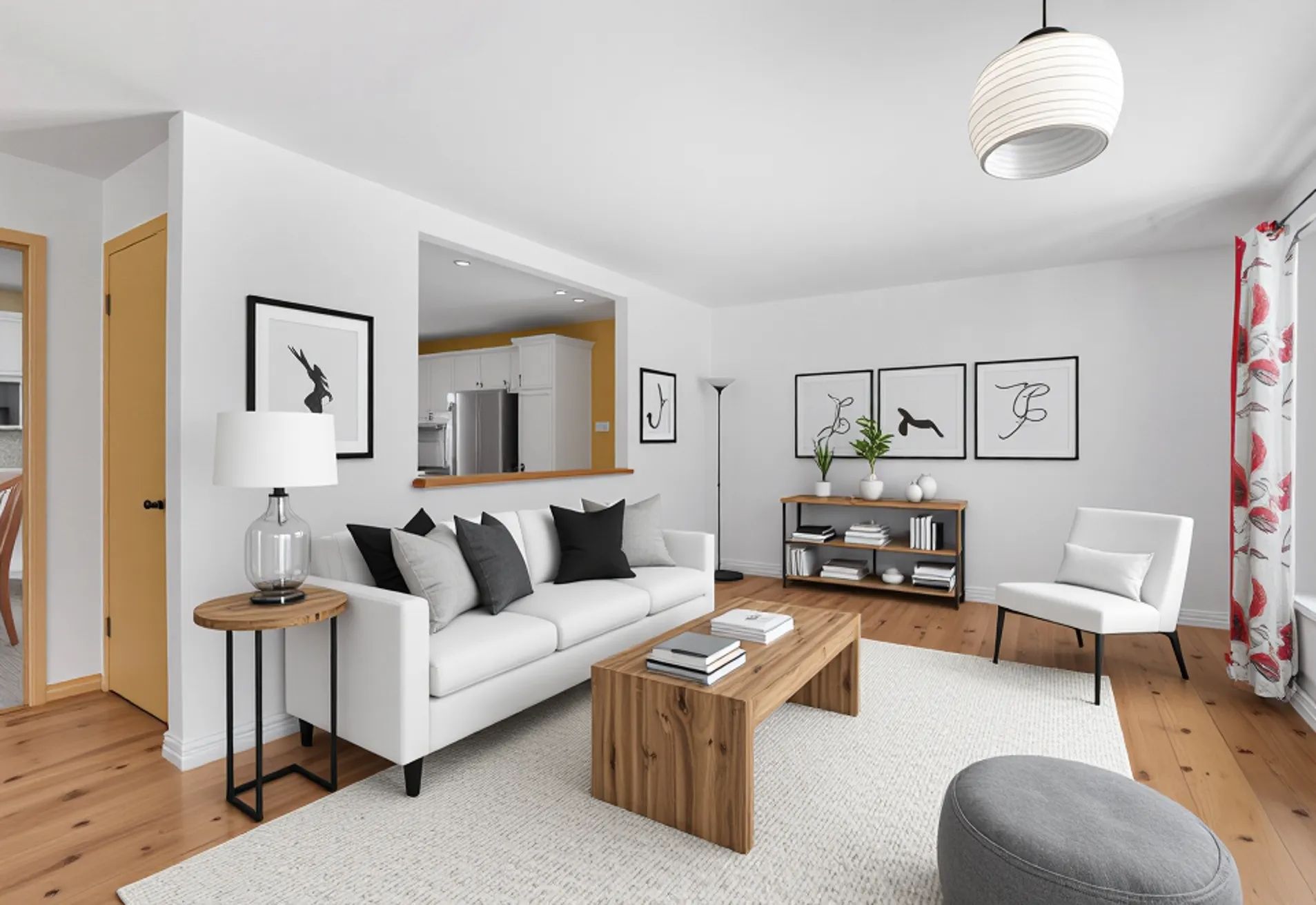 • Bright living room and inviting eat-in kitchen with quartz countertops.