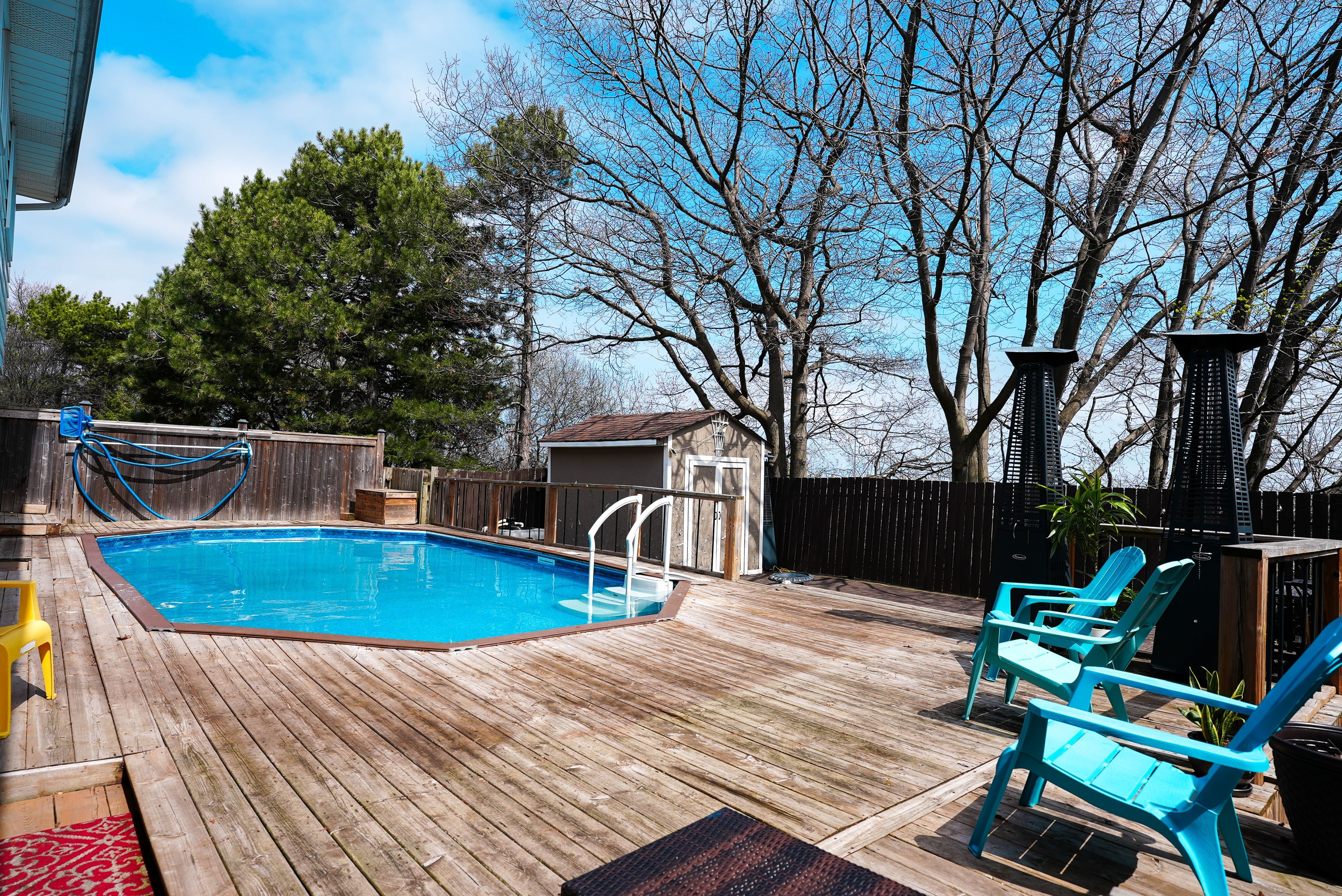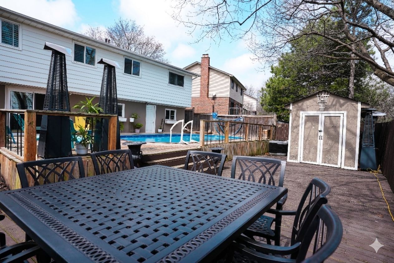 Nestled on a quiet, family-friendly street in desirable falgarwood, this beautifully maintained back-split offers over 1,800 sq. Ft. Of living space plus a fully finished basement. The renovated kitchen opens into a bright, welcoming living room featuring a cozy fireplace and custom built-ins-perfect for everyday living and entertaining. The spacious lower-level family room includes a gas fireplace and walkout to a private backyard retreat. Upstairs, you'll find a generous primary bedroom along with two additional bedrooms, while the lower level offers a fourth bedroom which can be used as an office. The finished basement adds even more flexibility with an additional bedroom and den. Set on a premium ravine lot, the backyard is a true oasis complete with a pool featuring a heat pump as well as a new liner (updated 2025), bi-level decks, gazebo, and shed, all surrounded by mature, professional landscaping. Additional recent upgrades include a new air conditioner installed in 2025, offering added comfort and peace of mind. Conveniently located close to top-rated schools, beautiful walk-in trails, shopping, and with easy highway access, this home combines comfort, space, and an unbeatable setting.