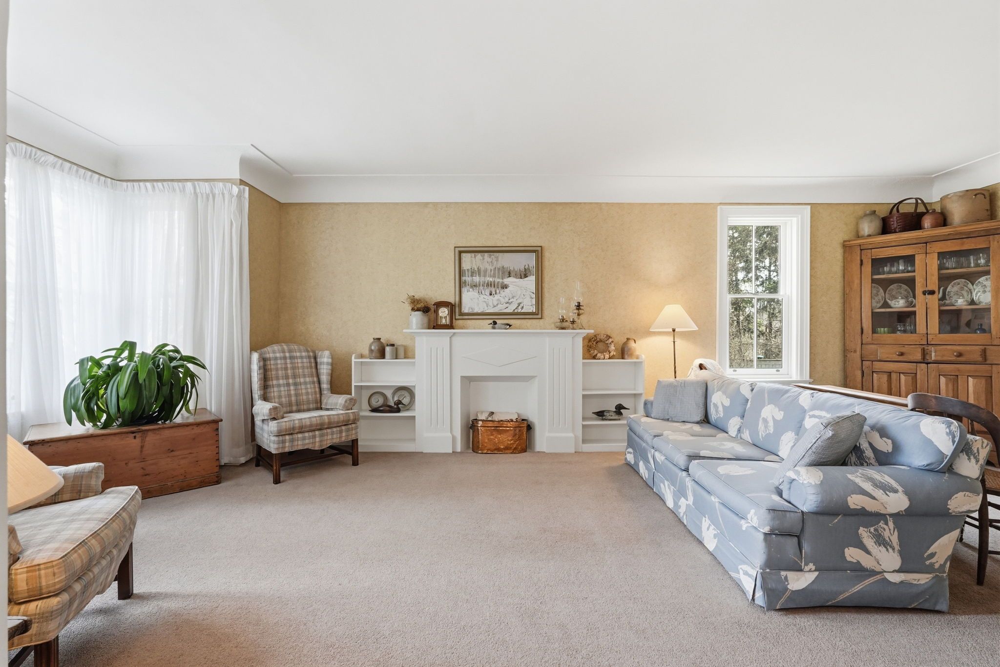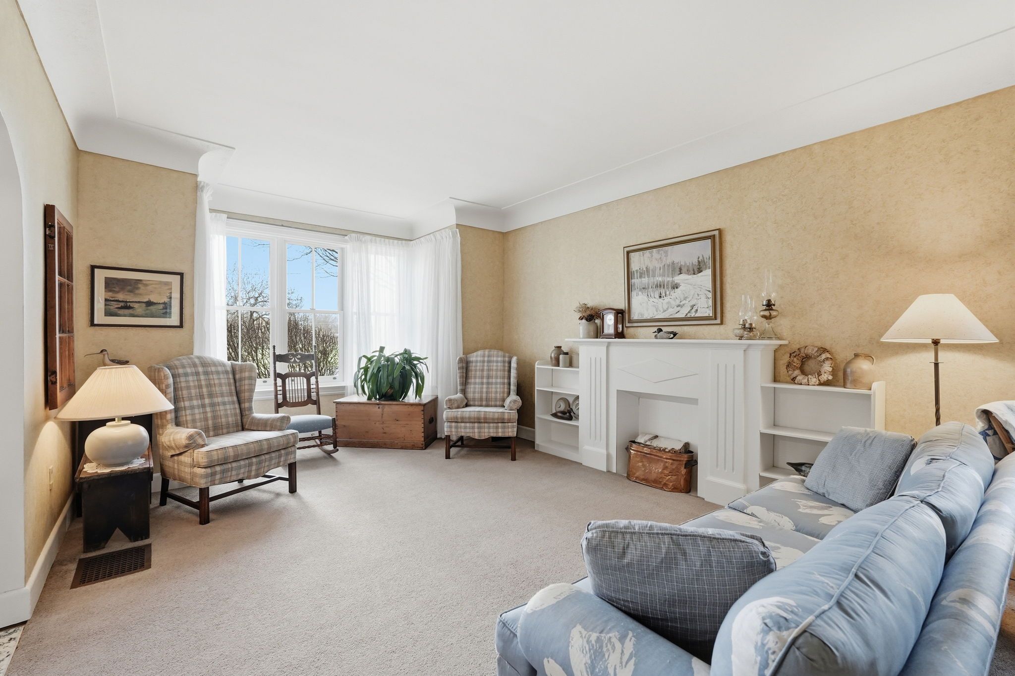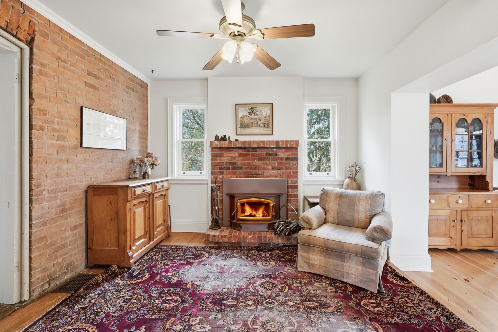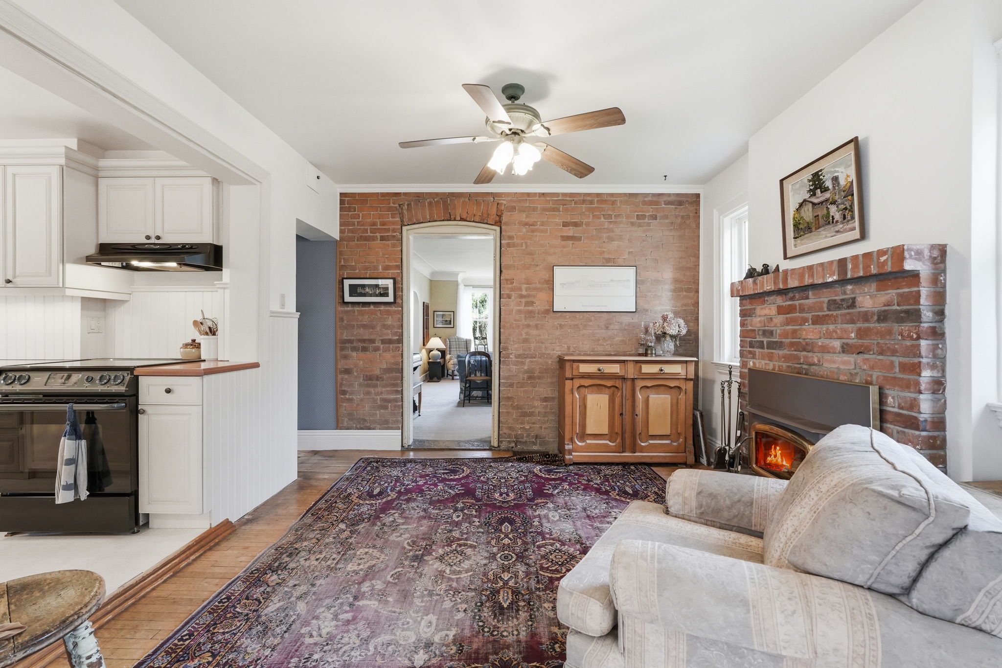 • Main floor features cove ceilings and a cozy wood burning fireplace.