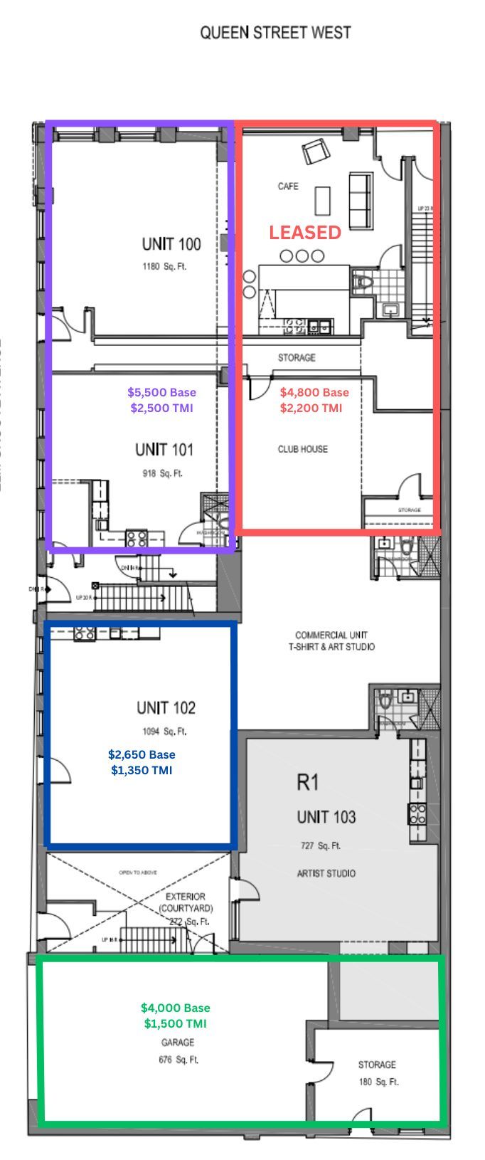 Corner retail unit on queen st w with signage potential on both queen st w and elm grove. High ceilings, open layout, and space can be demised with drywall to create separate areas. Clear glass door to be installed on queen st w upon possession; currently has side-door access with potential for two entrances. Option to lease additional space at an adjusted rate. Tmi is a monthly rate.