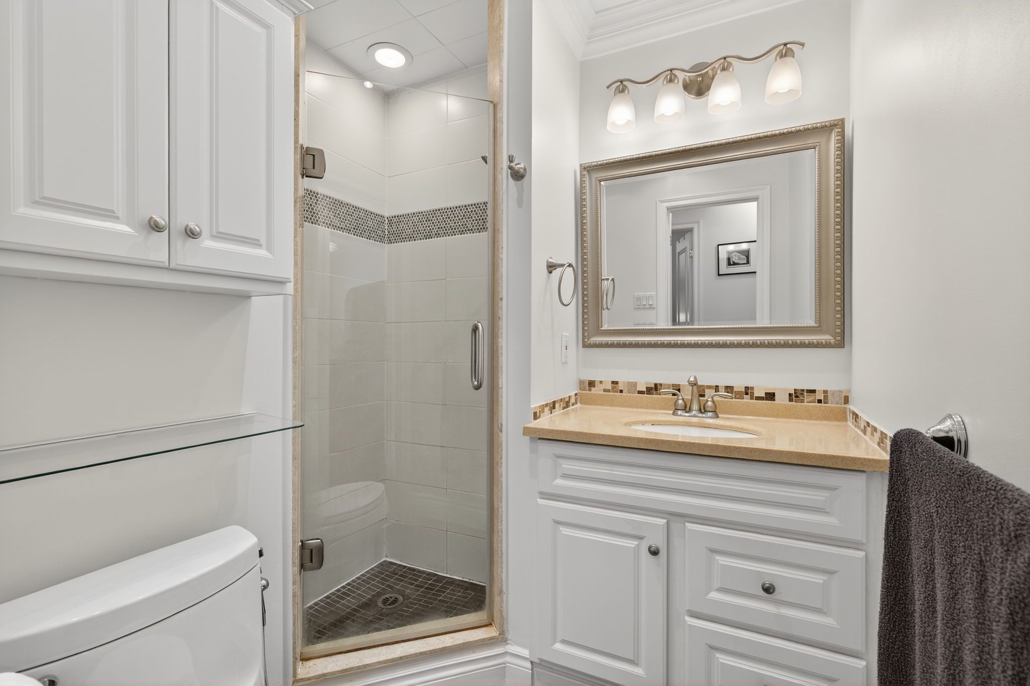 • Modern kitchen with stainless steel appliances and under cabinet lighting.