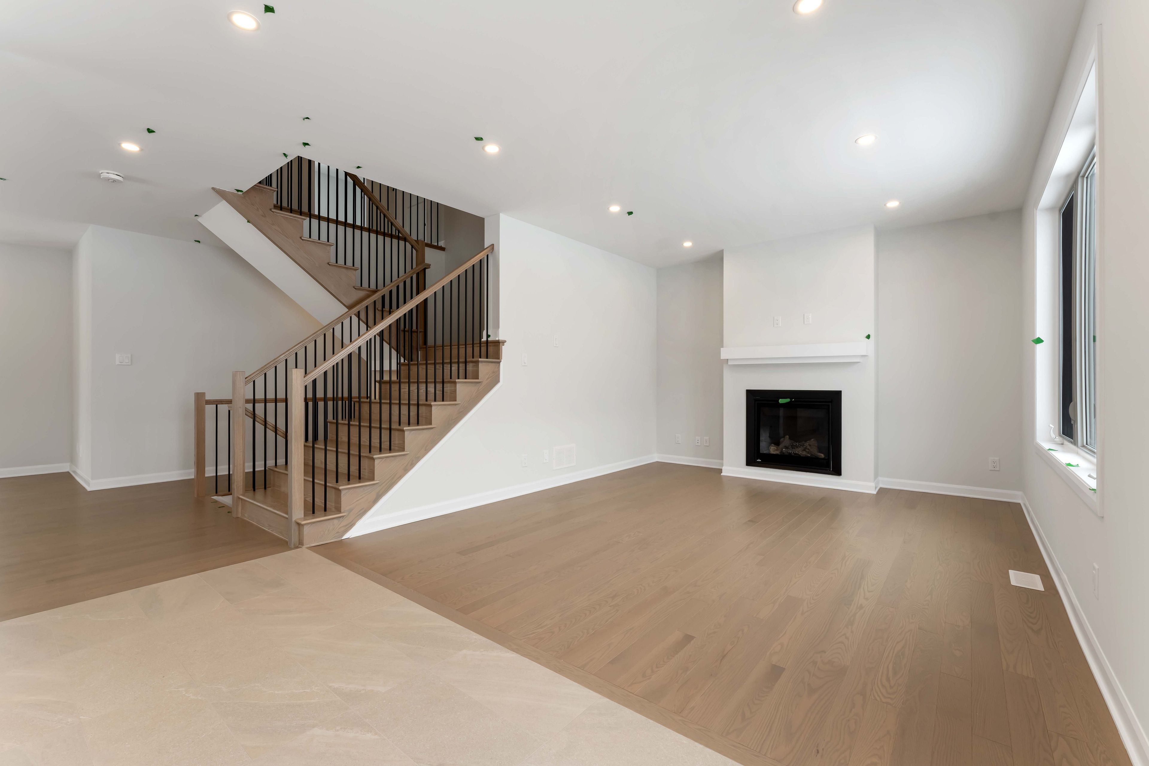 • Open-concept main floor with fireplace and gourmet kitchen upgrades.