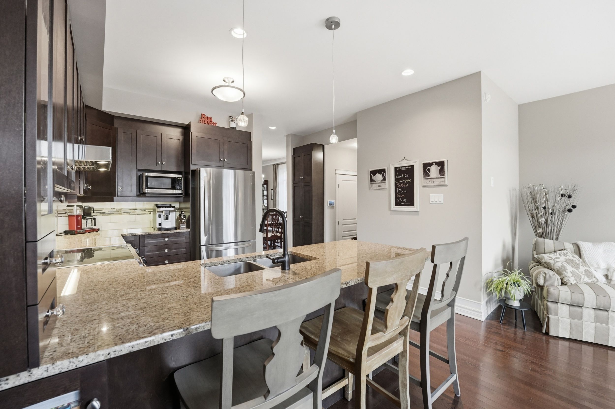 • Open concept kitchen featuring granite countertops and upgraded cabinetry.