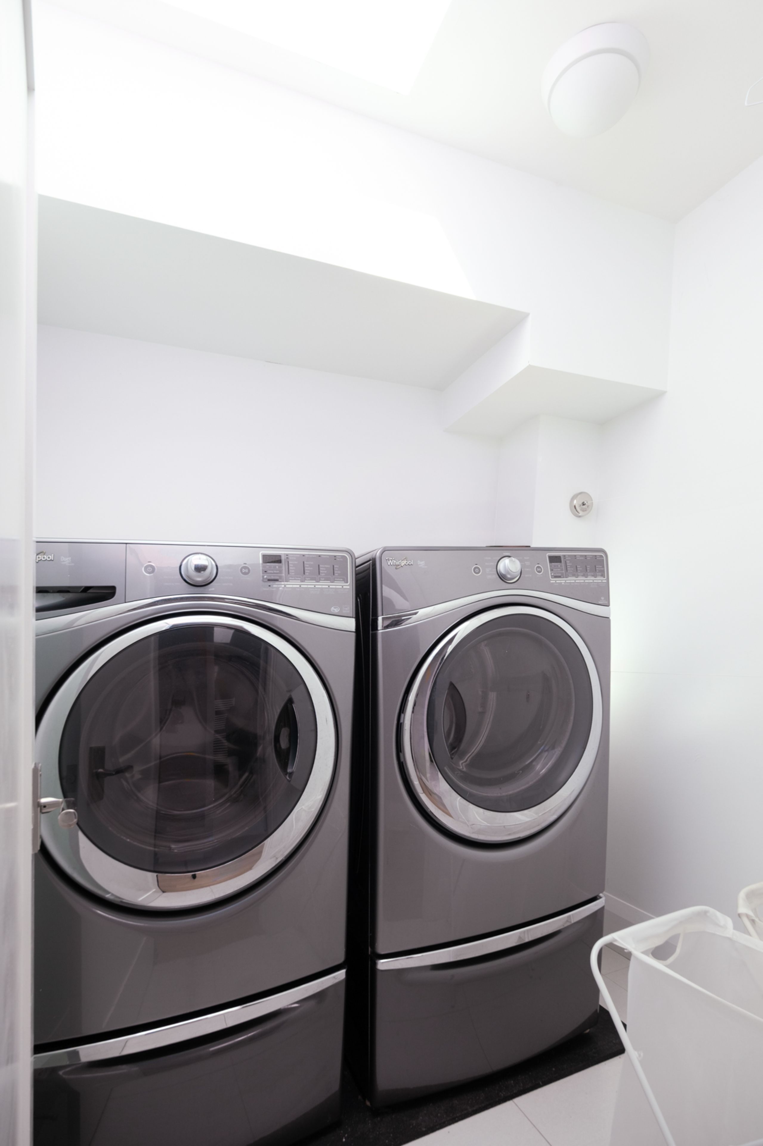 • Large kitchen features high-end Miele appliances and a walk-in pantry.