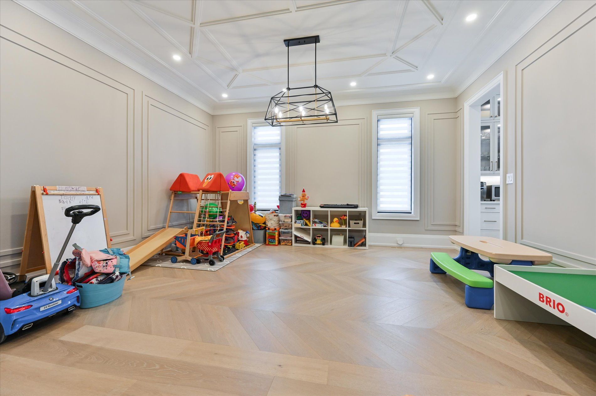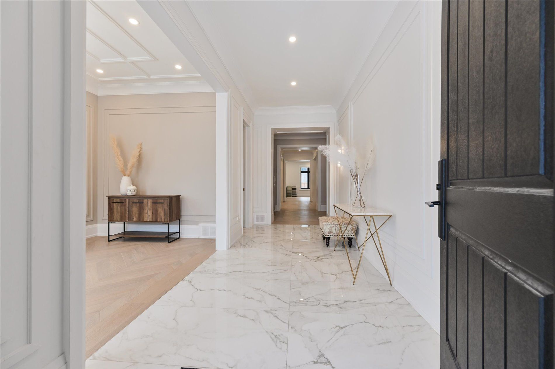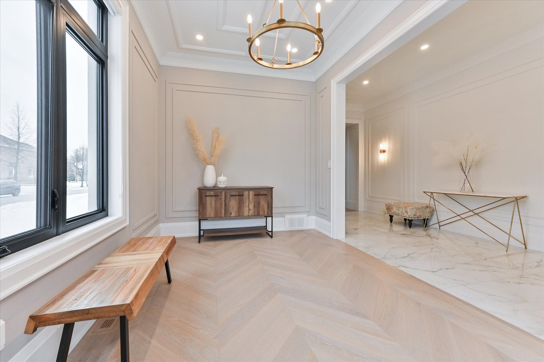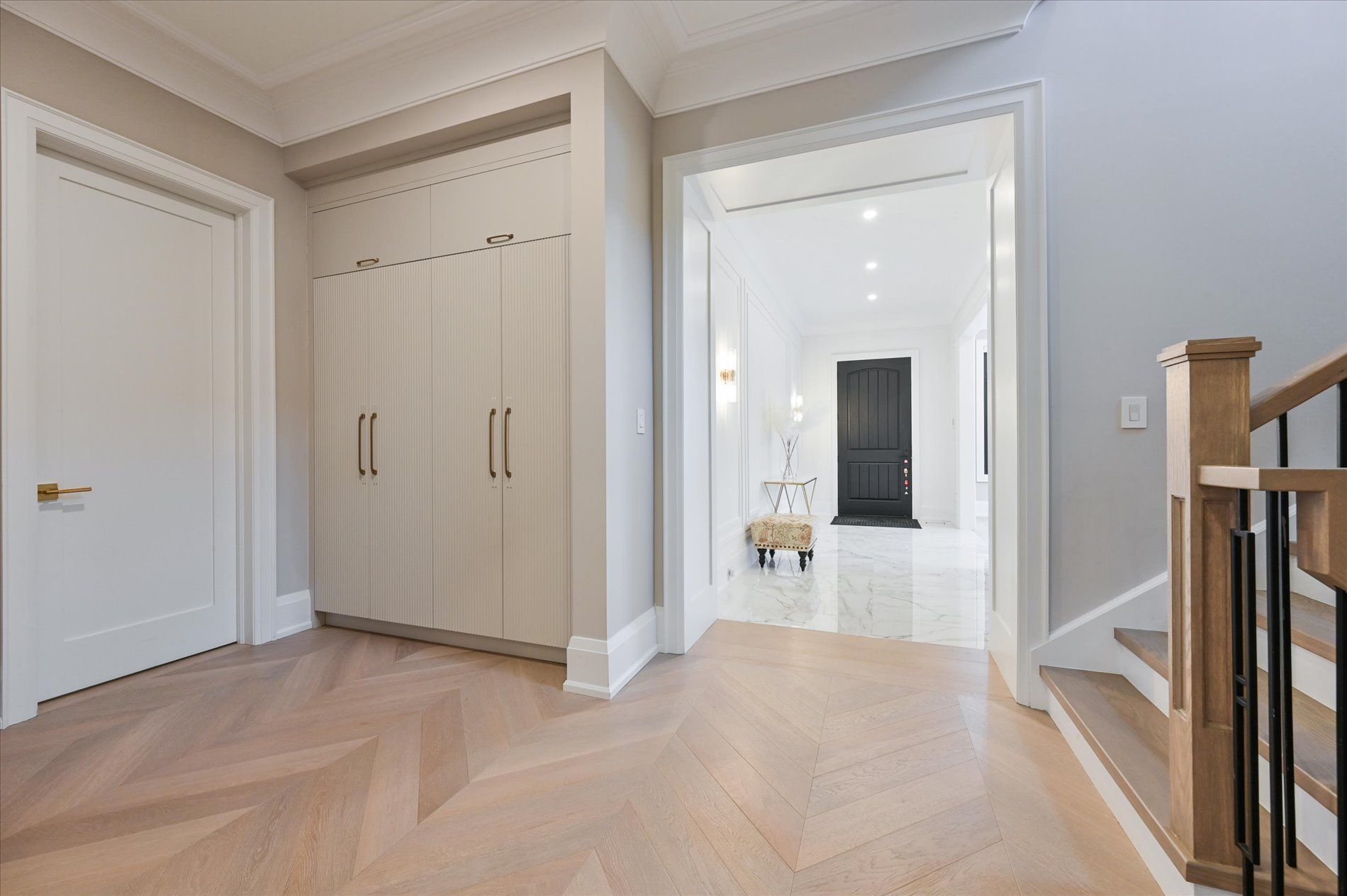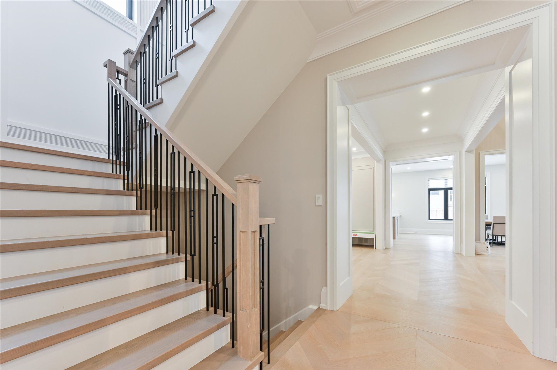 • Spacious main floor with elegant herringbone hardwood flooring.