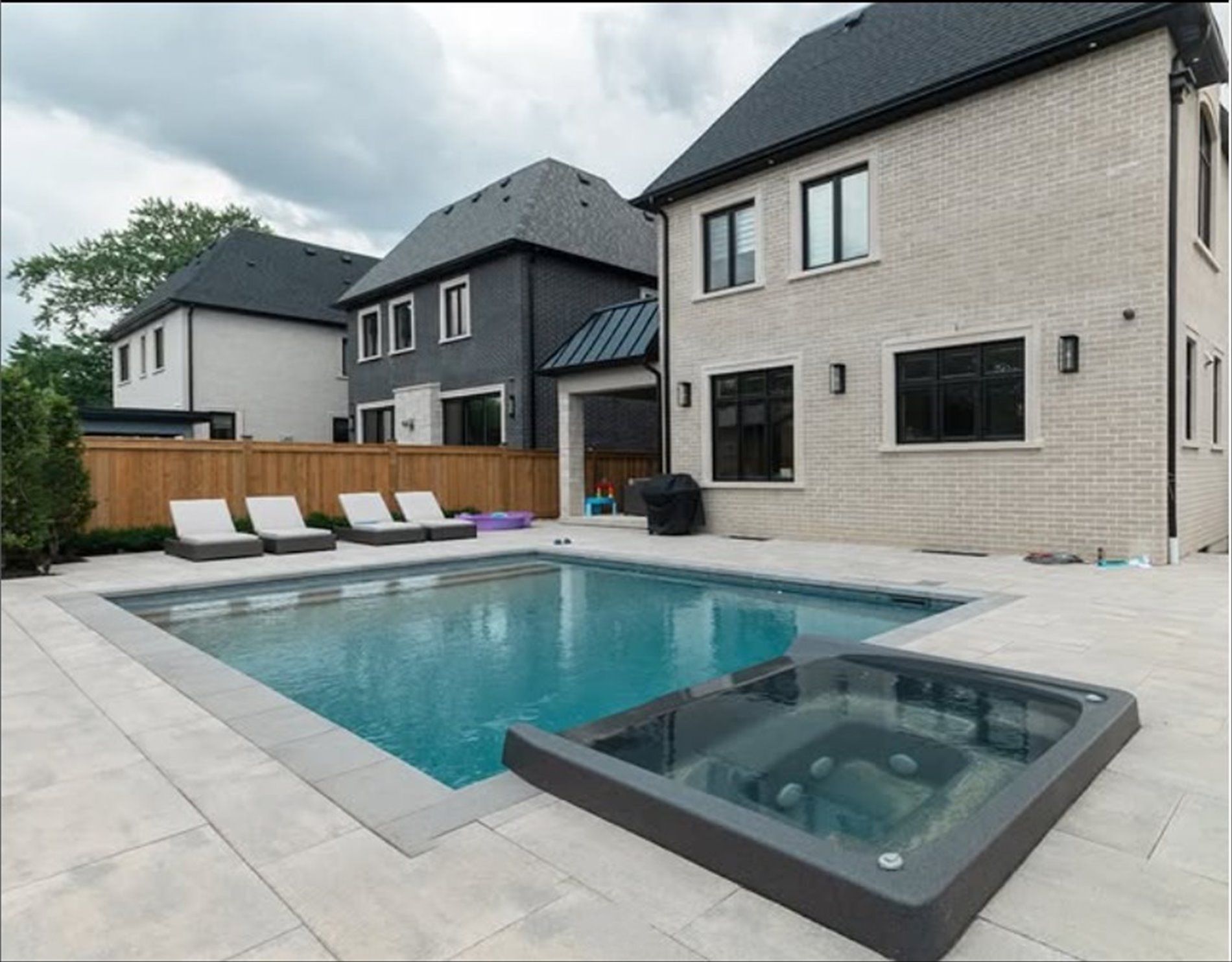 • Backyard oasis with inground pool, hot tub, and pool house.
