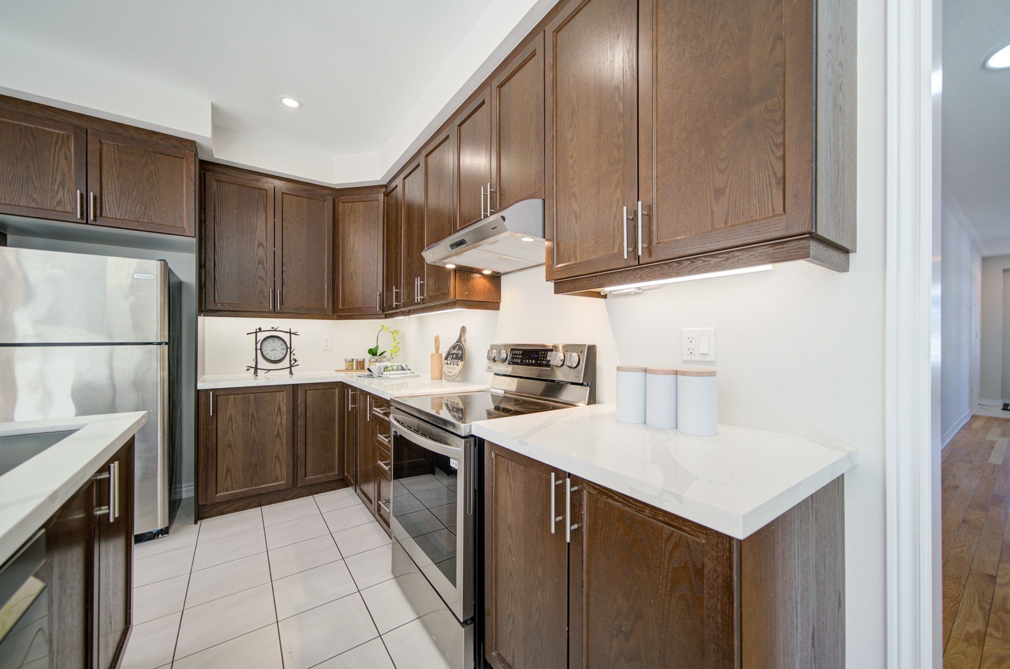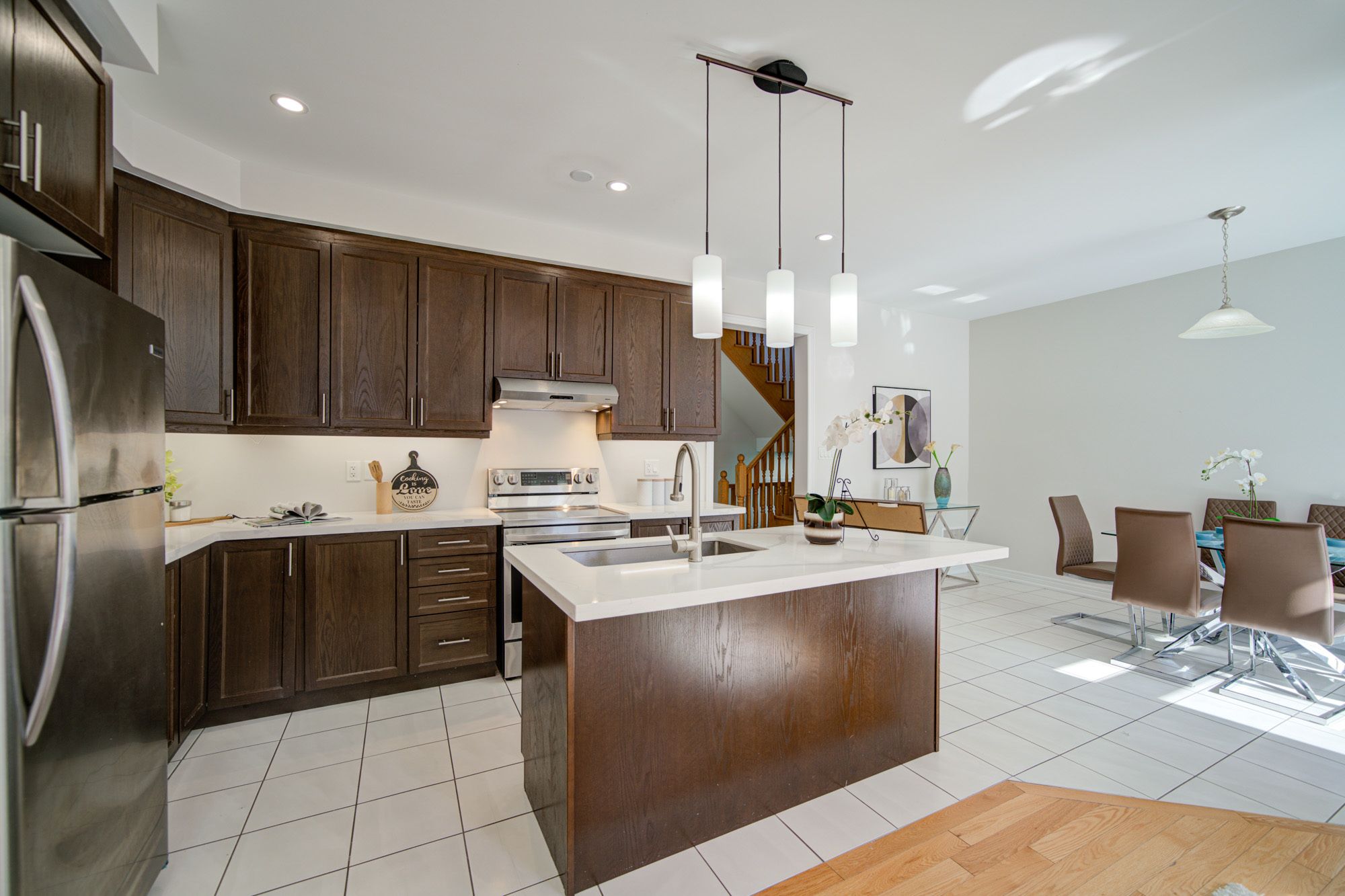 • Modern upgrades include smooth ceilings, pot lights, and a gourmet kitchen.