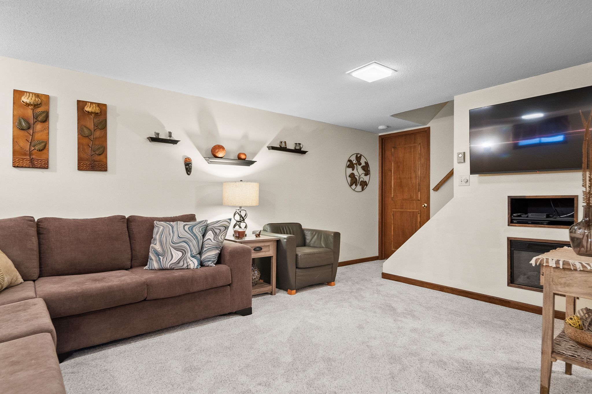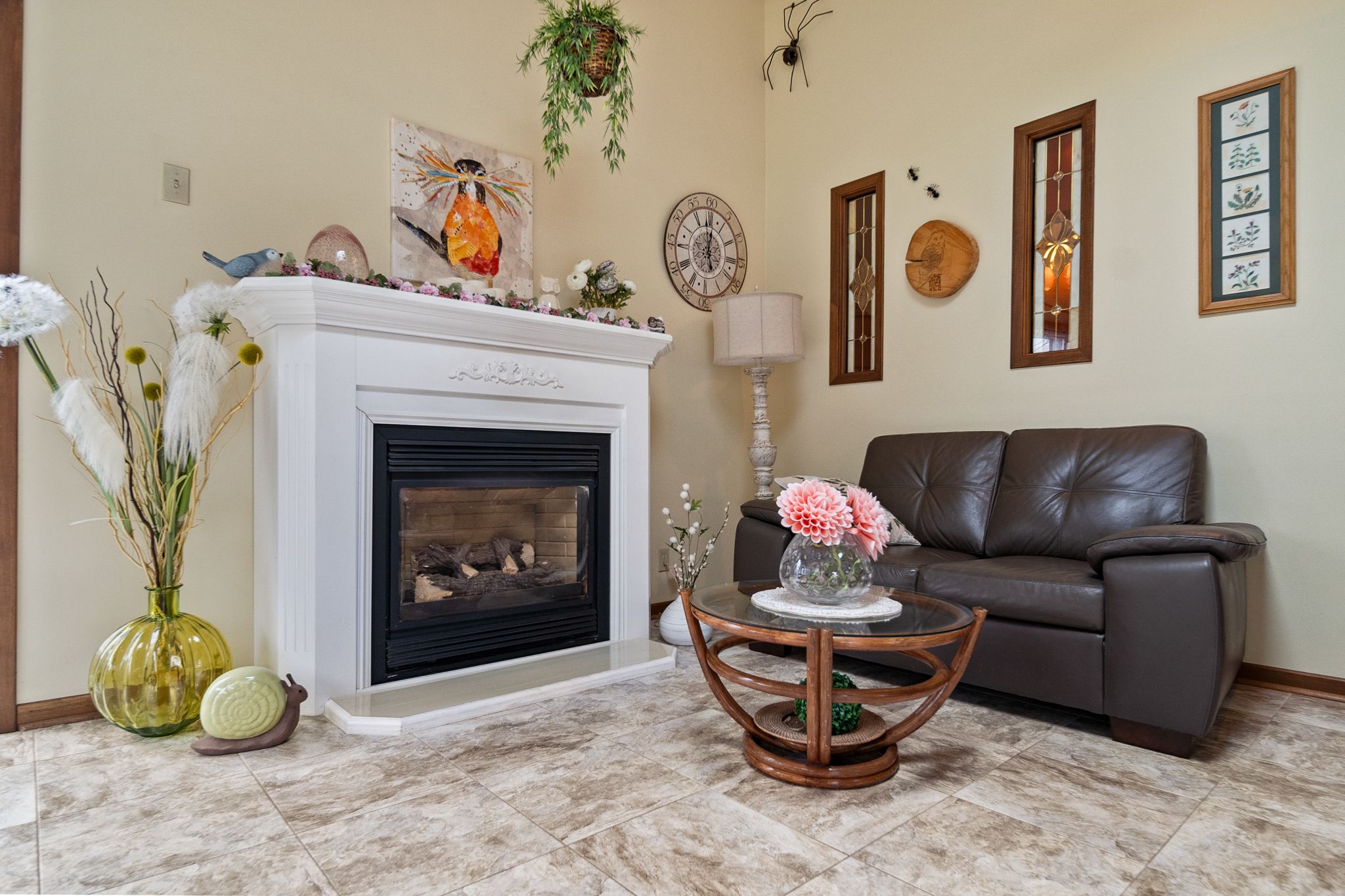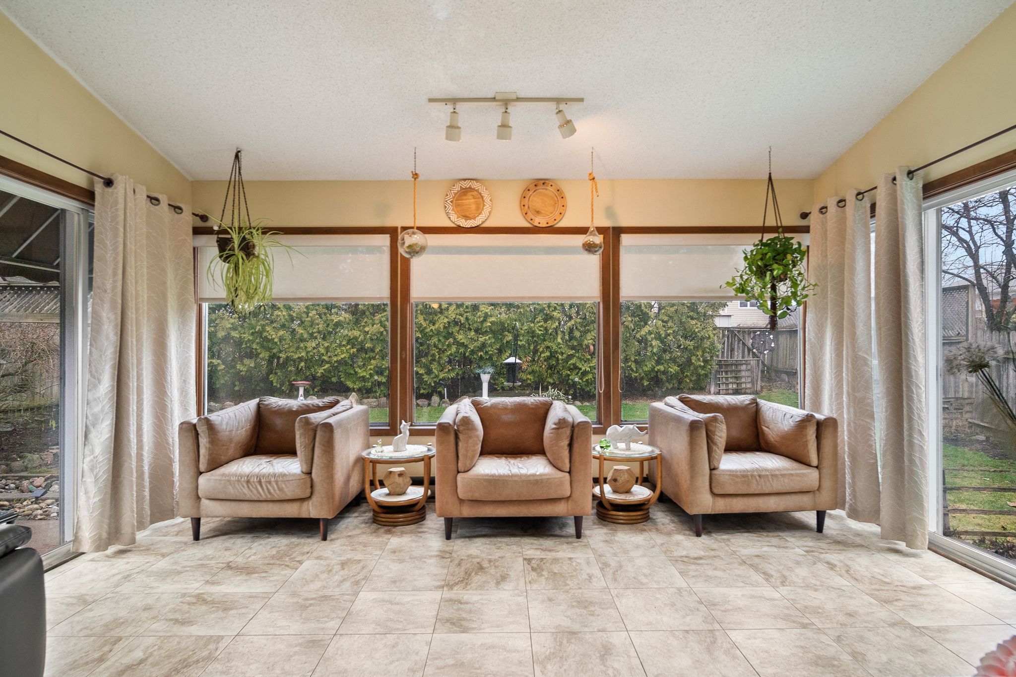 • Sunroom/family room addition with cozy gas fireplace and backyard views.