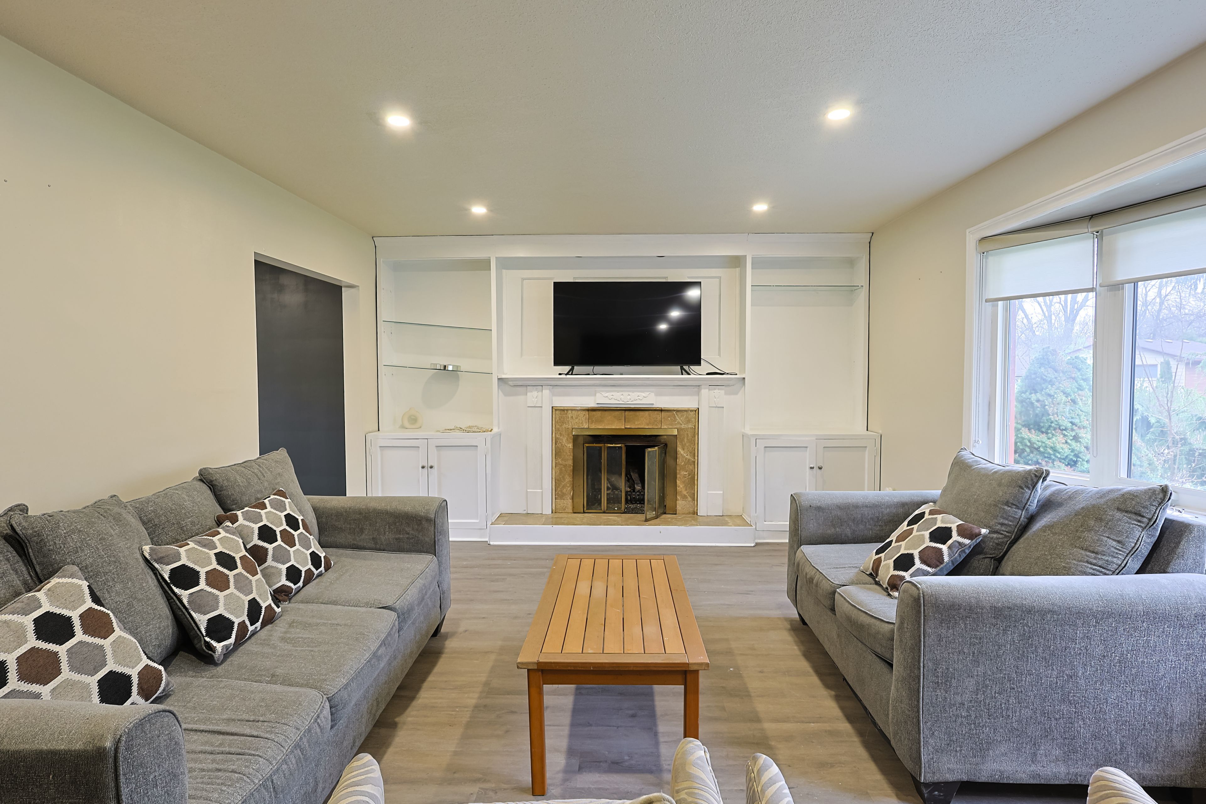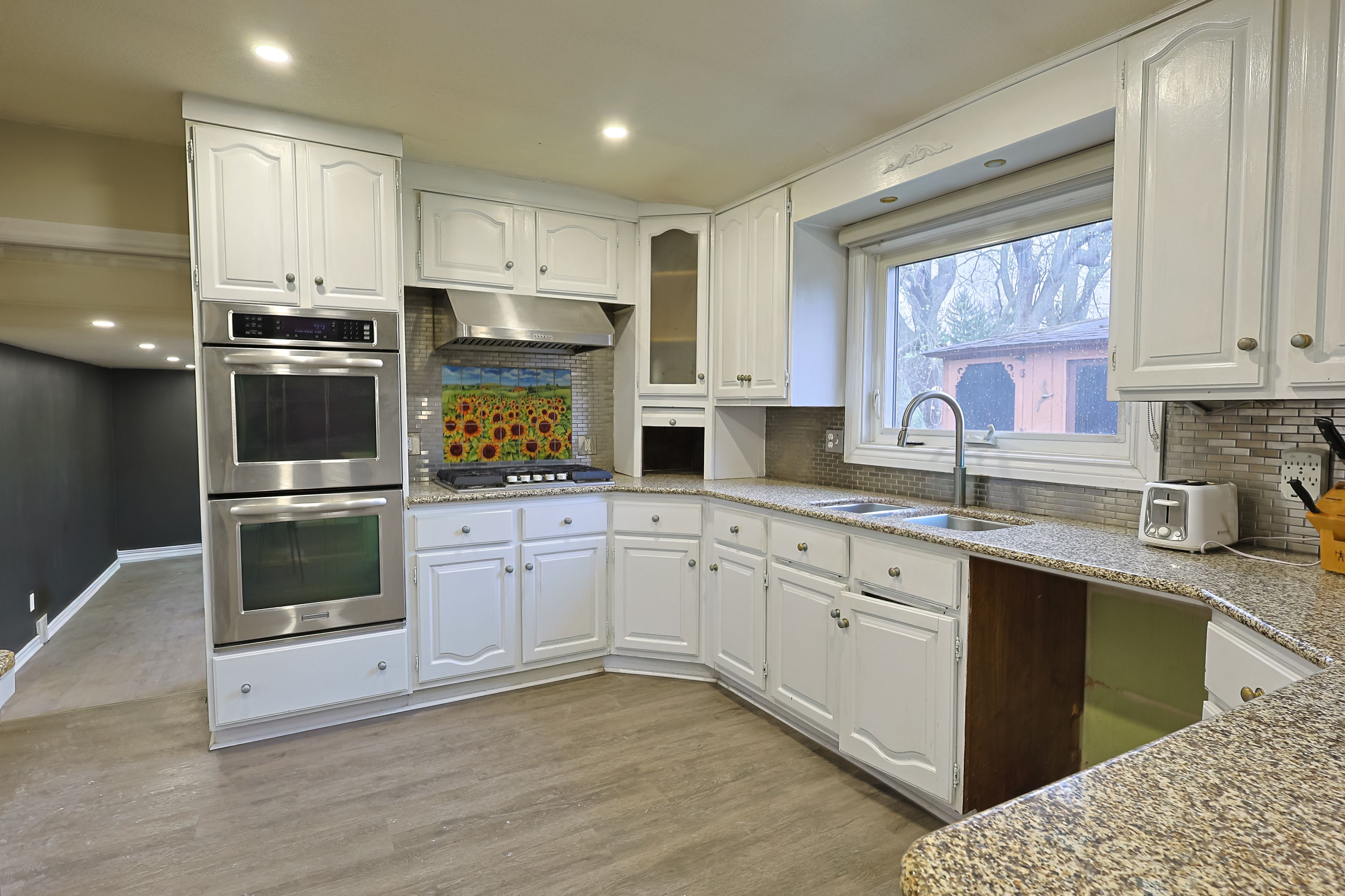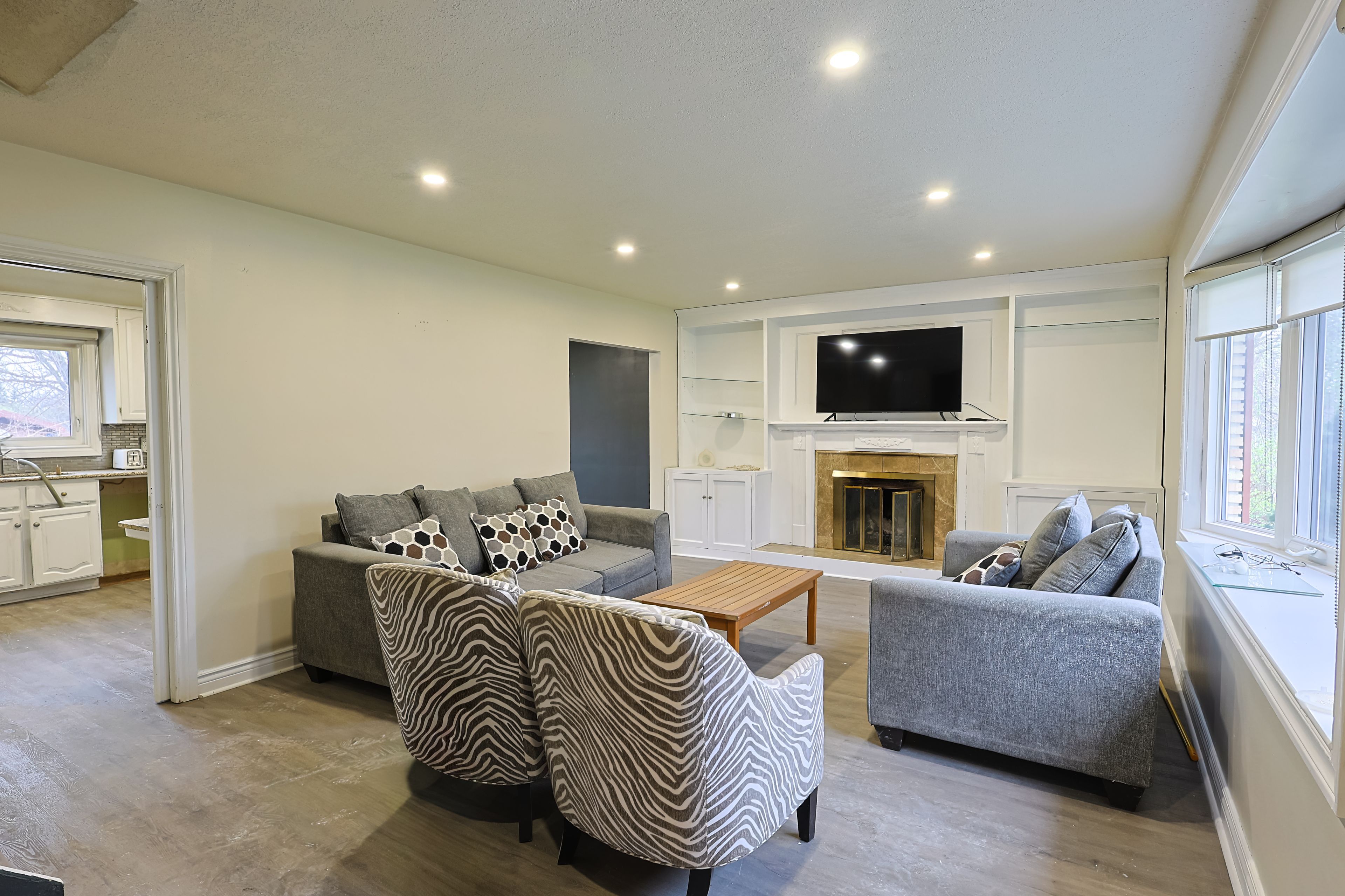 Welcome to 127 odessa ave! This renovated 4+1 bedroom, 3-bathroom split-level home backs directly onto the scenic odessa park in a quiet, family-friendly neighborhood. Upgraded from top to bottom, the home features fresh paint, luxury vinyl flooring, modern light fixtures, rolling shades, and pot lights throughout. The main floor offers a versatile bedroom/office, a cozy living room with a fireplace, a warm kitchen with a dining area, a large family room, and a powder room. Upstairs, find a spacious primary bedroom with double closets, two additional bedrooms, and a stunning updated bathroom with a stand-alone soaker tub and separate shower. The lower level provides great in-law suite potential with a large rec room, wet bar/second kitchen setup, laundry, an additional bedroom, a 3-piece bath, and electrical safety authority-compliant upgraded electrical. Step outside to a private, fully fenced backyard oasis featuring an enclosed hot tub gazebo, a tranquil waterfall pond, a fire pit, and a steel roof (2017). Just a short walk to arthur ford public school-don't miss this incredible opportunity!