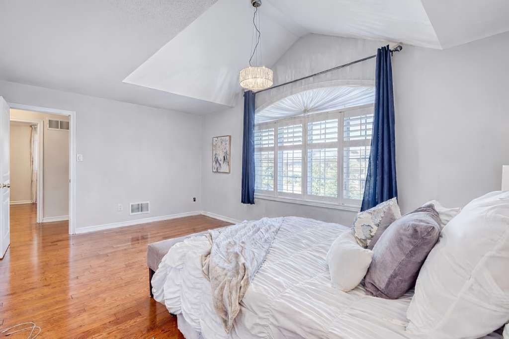 Beautiful upgraded 4-bedroom detached home with brand new roof, extensive updates, and optional finished basement, ideal for large families. Recently added all-season covered glass porch with sliding windows offers year-round protection and added privacy. Bright open-concept main floor with soaring 20-ft ceilings, floor-to-ceiling windows, and elegant finishes. Renovated and expanded kitchen with quartz counters, stainless steel appliances, large island, and abundant storage. Walkout to private backyard with interlock patio, lawn, and mature plum tree. Upstairs features 4 spacious bedrooms with hardwood flooring, freshly painted. Primary suite includes walk-in closet, 5-piece ensuite, and in-suite laundry. Updated second bathroom with new vanity. Finished basement suite available as optional additional living space (not included in base rent), featuring kitchenette, full bath, large bedroom, second full-size laundry, and separate living area-ideal for larger families. Walk to parks, walmart, longo's, restaurants, and medical centre. Located in top-rated school zone.