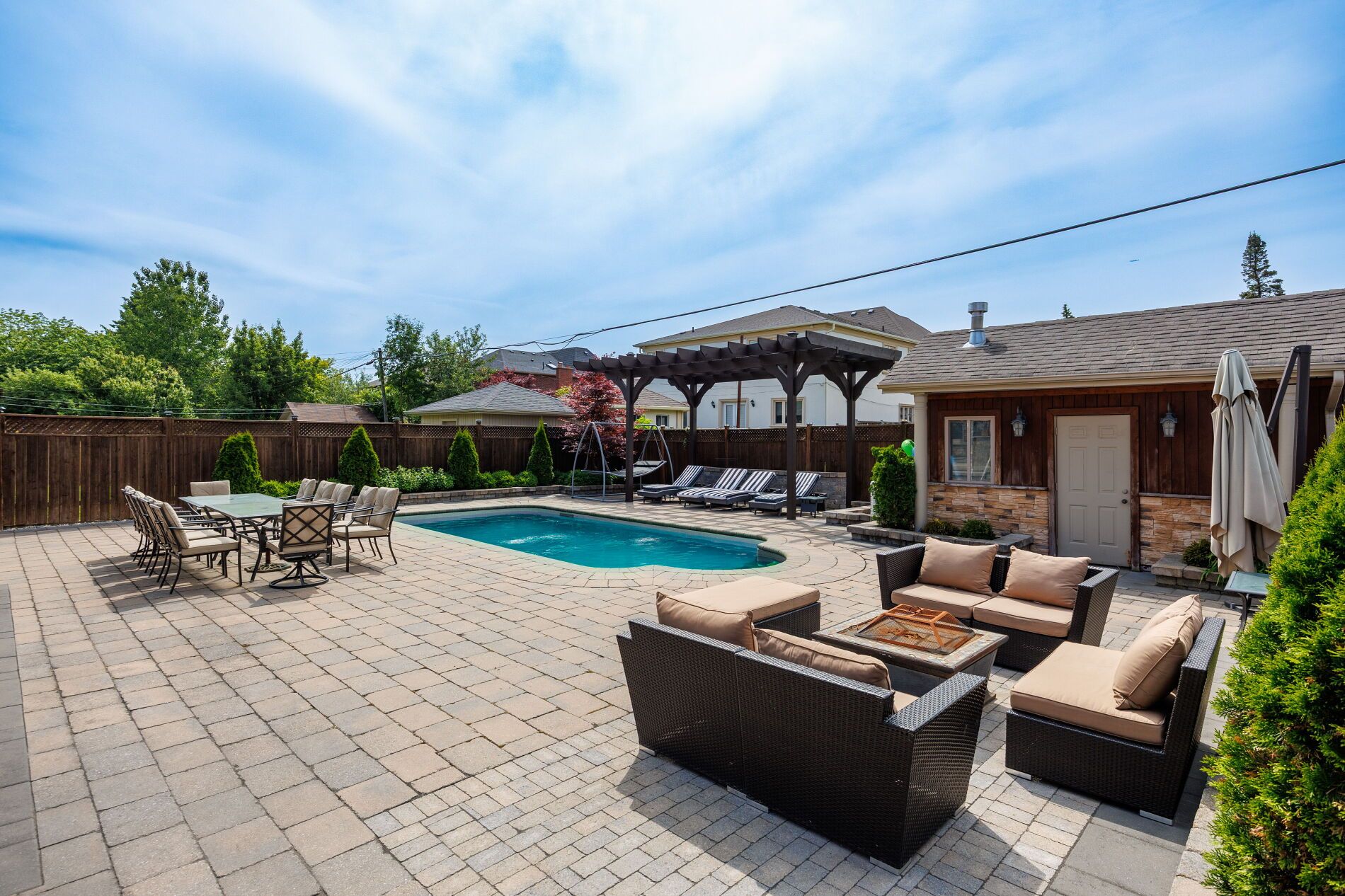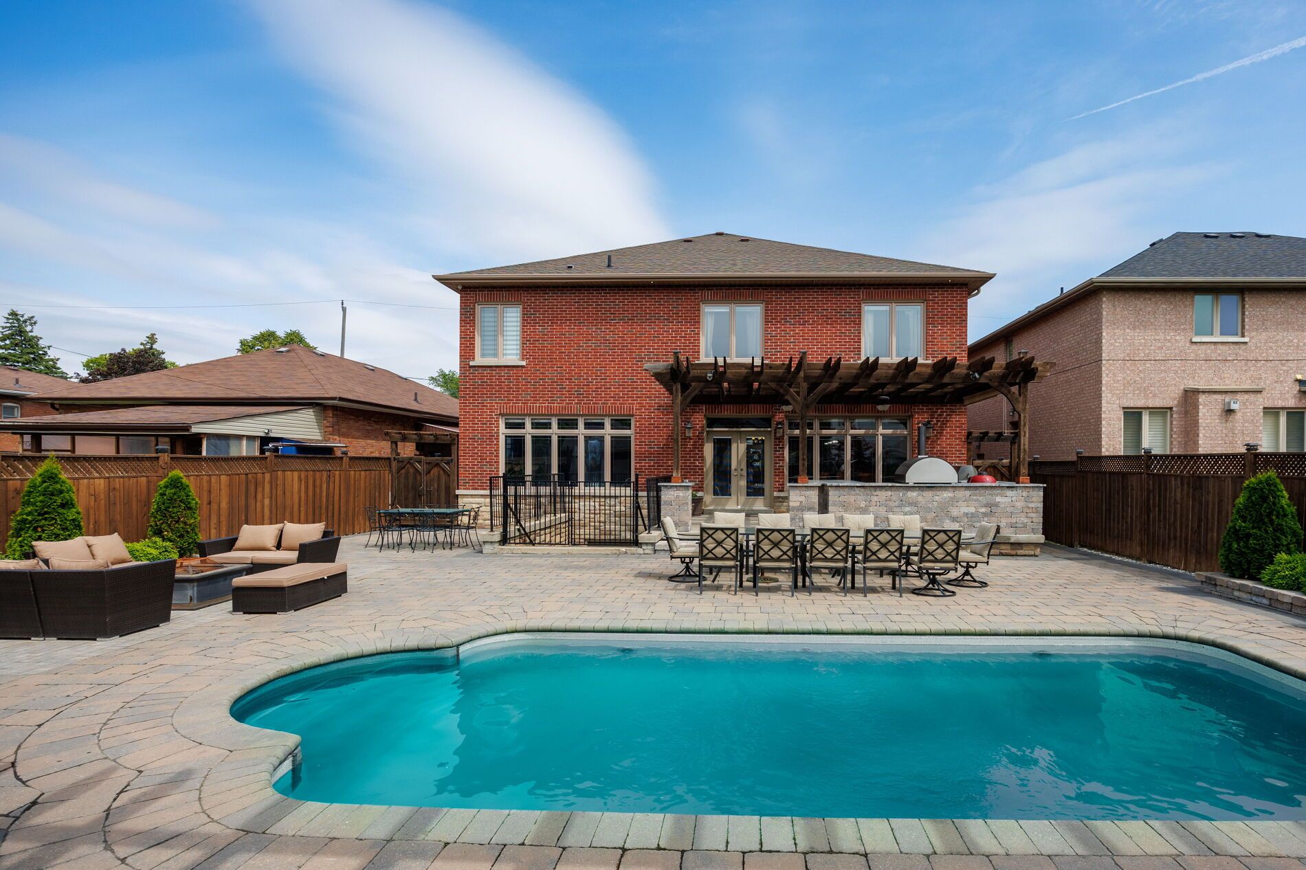 Step into refined living at 127 sultana avenue - a custom-built gem tucked away on a quiet dead-end street, just steps from a park. This elegant residence combines thoughtful design with modern comforts, offering the perfect balance of style, function, and location. The main floor boasts a private home office, ideal for working or studying from home, and an open-concept layout that flows effortlessly for both everyday living and entertaining. A chef-inspired kitchen anchors the space, seamlessly connecting to the dining and living areas. Step outside and discover an outdoor entertainer's dream: a beautifully designed kitchen and dining space, complete with built-in bbq and pizza oven, set against sleek stone finishes and a spacious prep island. Whether hosting family dinners or summer soirees, this space is the ultimate backyard retreat. Beyond the kitchen, the saltwater pool and low-maintenance interlock landscaping create a stunning setting for both relaxing and entertaining. With no sidewalk to shovel, the spacious driveway accommodates up to five cars. The basement features a separate entrance and a full second kitchen, perfect for a nanny or in-law suite, multi-generational living. Located in a highly sought-after neighbourhood, this home is a rare opportunity to enjoy luxury, privacy, and convenience in one exceptional package.