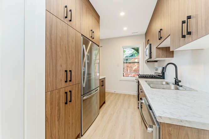 • Contemporary galley kitchen with stainless steel appliances and gas range.